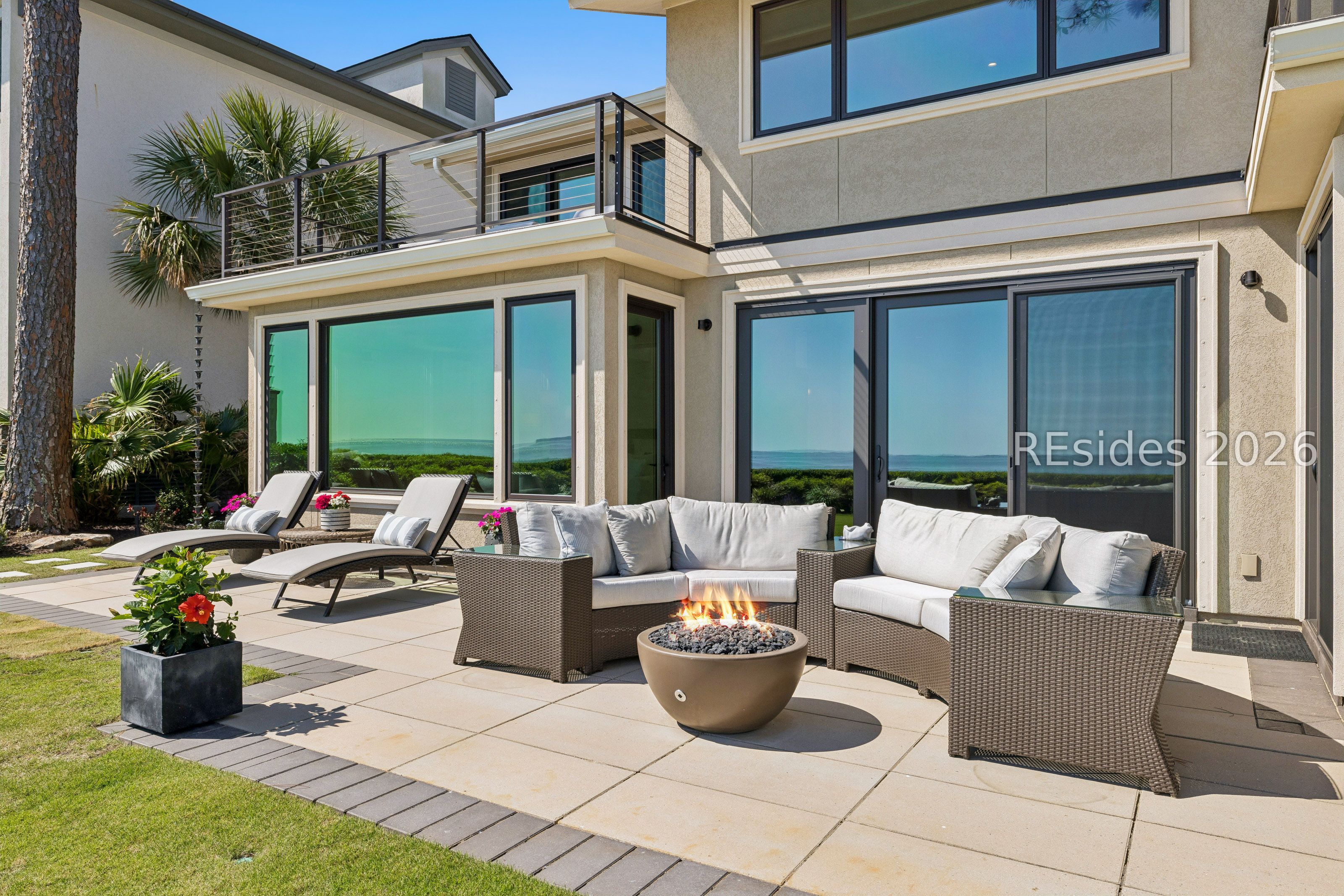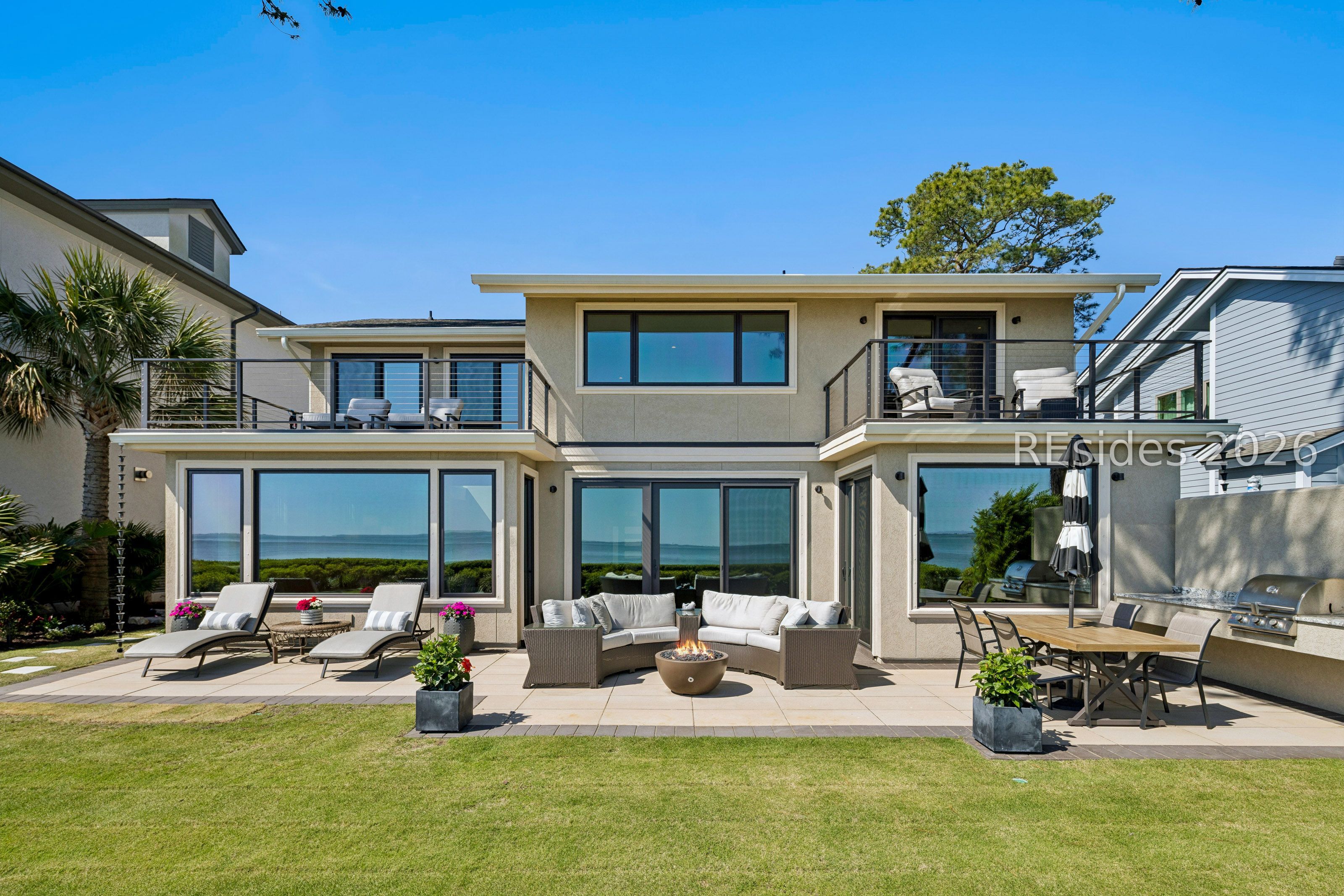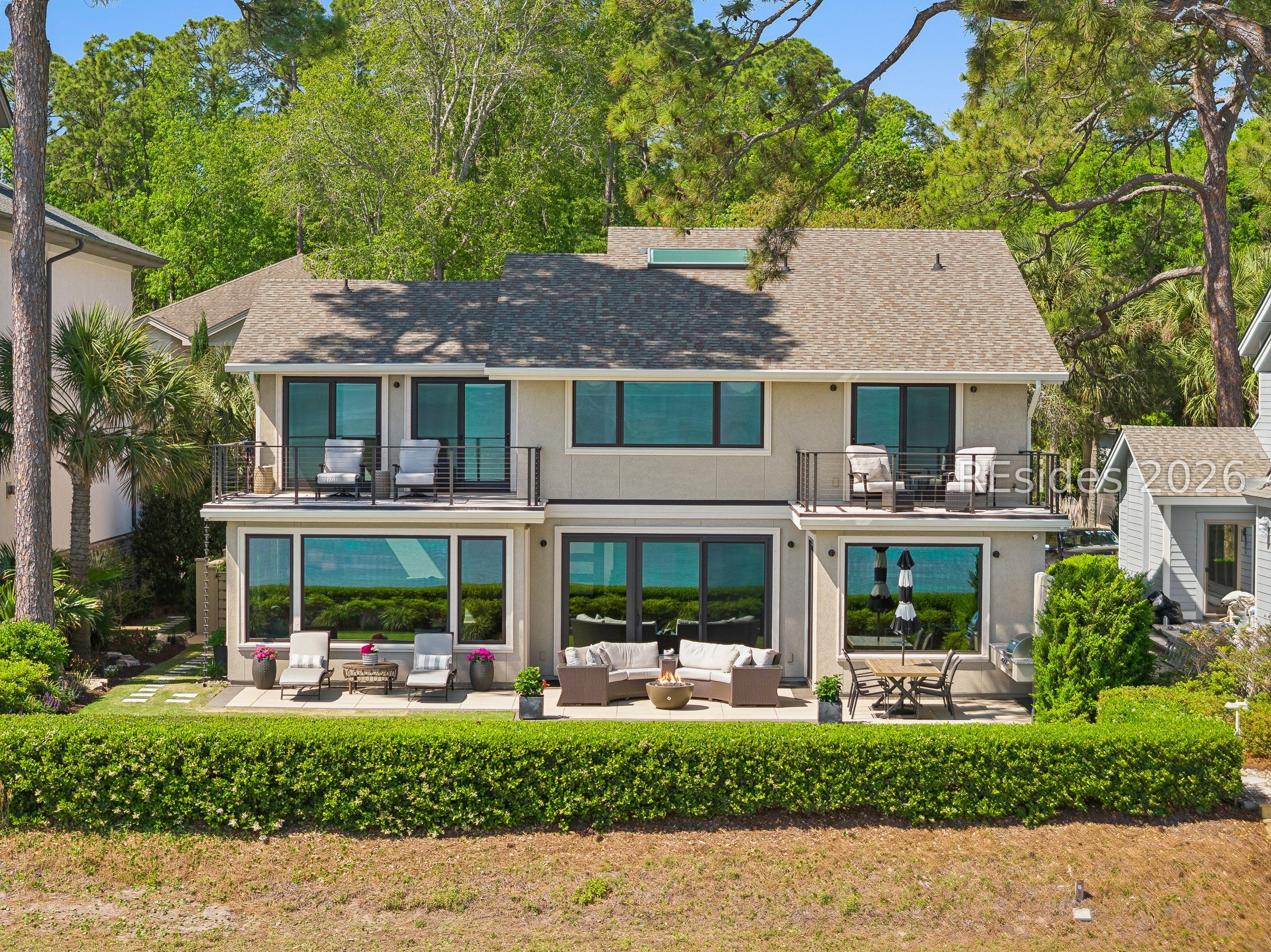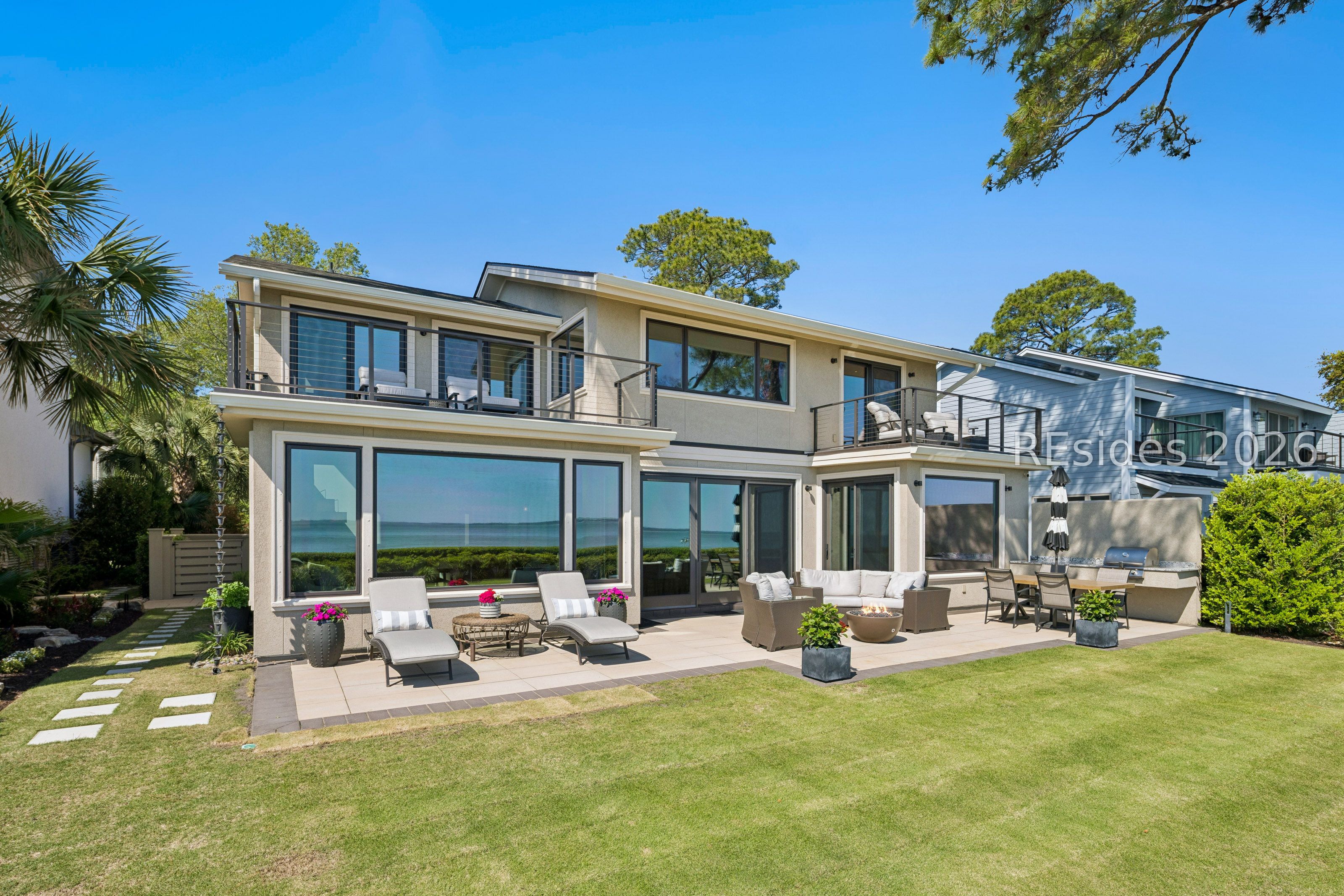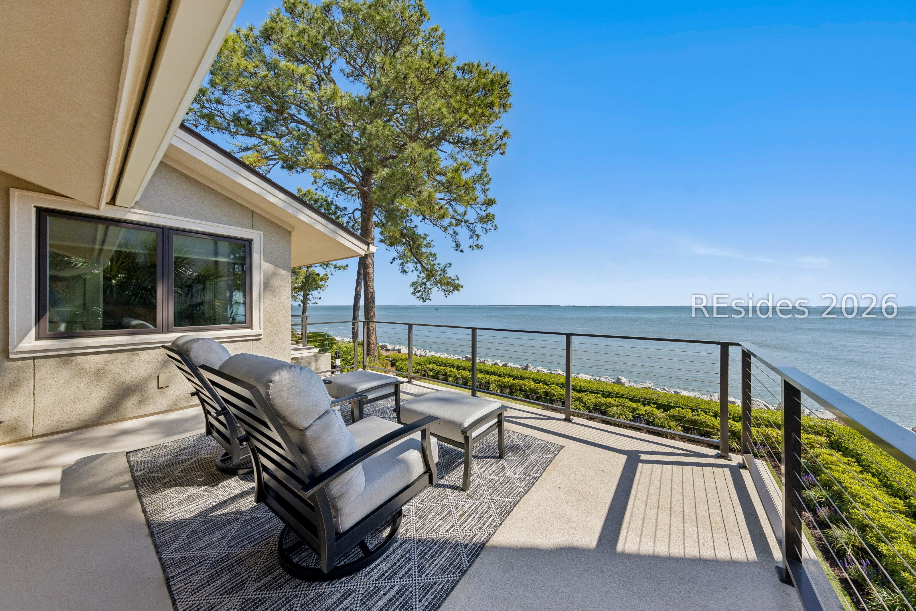 Experience an extraordinary, sweeping panorama of water-one of the most breathtaking views on Hilton Head Island. With over 180 degrees stretching from the Port Royal Sound to the Atlantic Ocean, this wide-angle coastal setting delivers stunning sunrises, light afternoon breezes, and ever-changing tides. Dolphins play just offshore, osprey dive with precision, and shrimp boats head out for their daily catch-an authentic showcase of Lowcountry coastal life.This completely renovated, classic contemporary home shows like new and offers just over 3,400 square feet with 3 bedrooms and 3.5 baths. Clean lines and an open layout maximize the views from nearly every room, while custom cabinetry, quartz countertops, and a sleek linear gas fireplace elevate the interiors.Outdoor living is equally inviting, with a spacious patio featuring a gas fire bowl, built-in grill, and multiple areas to relax. Upstairs, two decks extend the experience-one off the primary bedroom for morning coffee, and a larger deck for evening "sundowners" overlooking the water.A two-car garage adds convenience, while the Dolphin Head location places you just a short stroll from Pine Island. Just steps away, the private Dolphin Point Club pool overlooking the sound-reserved exclusively for residents of the street-offers a rare blend of convenience, privacy, and community.Wide water, endless horizon, coastal breezes-the epitome of Lowcountry living. Owner is SCREA.