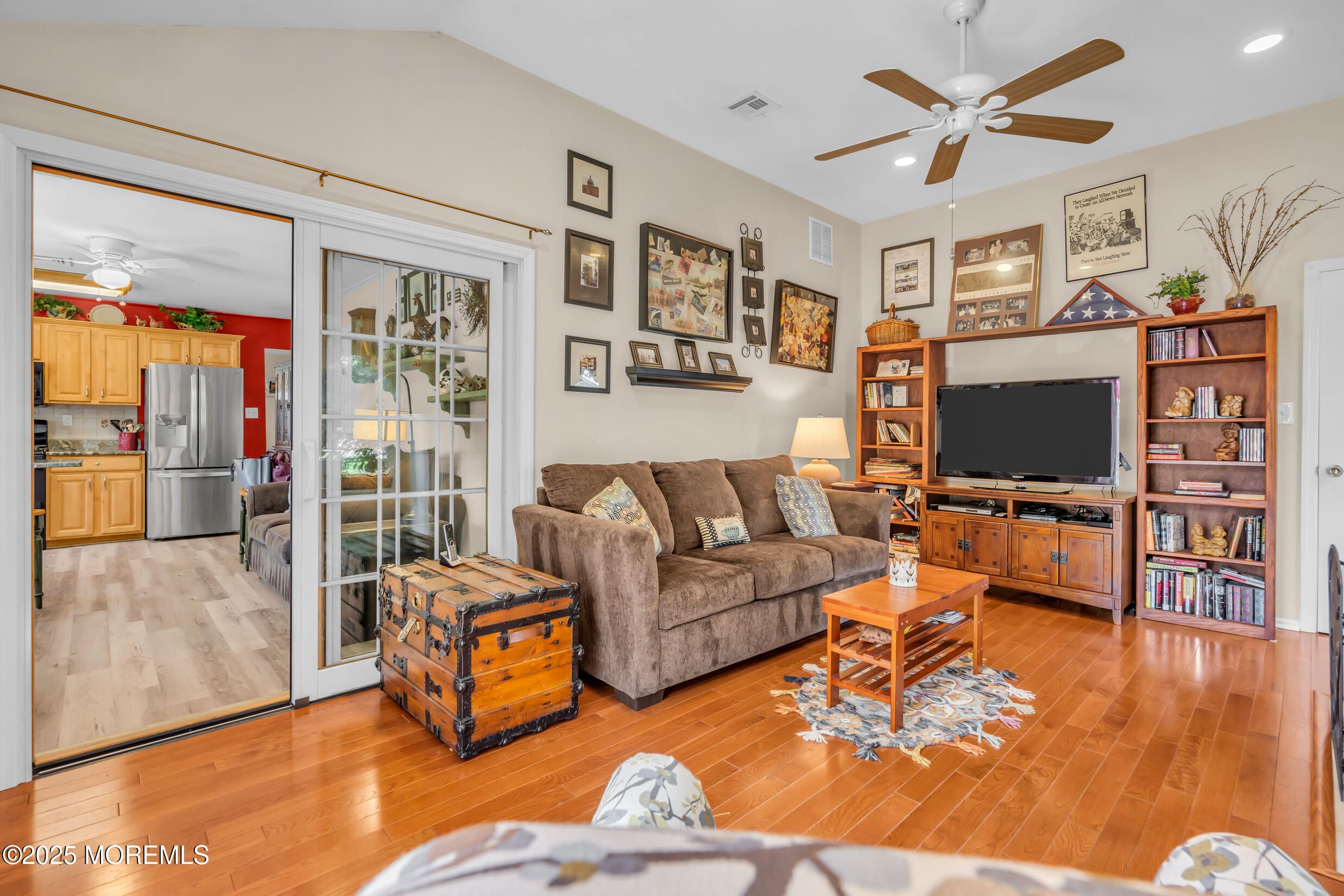 Welcome to this unique Yellowstone model featuring 2 full baths and a thoughtfully designed den addition that expands your living space. The den includes a walk-in closet, cathedral ceilings, gas fireplace, and sliding glass doors leading to a private deck. The home showcases Brazilian hardwood floors, an updated kitchen with recessed lighting, crown molding, and newer windows throughout. Enjoy the comfort and efficiency of a tankless hot water/boiler combo system and the convenience of a stackable washer and dryer. Outside, you'll find an 8x10 shed with shelving for all your storage needs. This home combines classic style with modern updates, offering warmth, functionality, and extra living space.