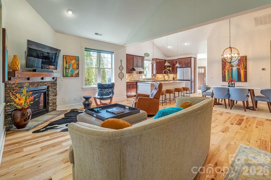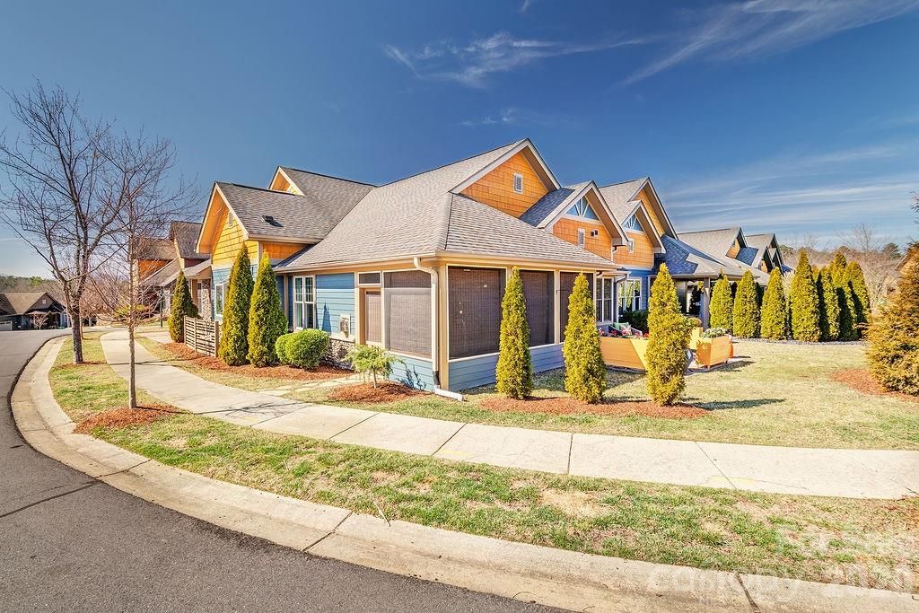 Set within the peaceful mountain community of Pinebrook Farms is a lovely (not your typical) end unit Townhome that captures a mountain view from the Lg screened porch and the new patio w/ arborvitae trees and custom-made planters is just one of many improvements. Inside, the design and new color choices create a sense of calm, complemented by the open floor plan, vaulted ceilings and the natural light that bathes the living, kitchen, primary bedroom, and dining areas – the result is the atmosphere of relaxed sophistication. Gorgeous wood floors, stone fireplace, good storage, and a well-maintained home where thoughtful design, architectural character and a natural connection to the outdoor living space comes together beautifully. The expansive kitchen island provides plenty of room for guests. You will find well-appointed appliances, the perfect “garden window”, plenty of cabinet space, a pantry and an appliance garage/closet situated near the dining area. The main level Primary ensuite is generous in size and features distinctive ceiling lines that adds both height and character. Lovely updated Primary bath w/ a walk-in shower and walk-in closet. 2 nd Guest Bedroom on main is also a good size w/ an updated full bath and lots of natural light. Stylish choices in updated fixtures throughout. Upstairs - a new custom railing leads to flex space (guest retreat, den, office, yoga… you decide) complete w/ a full bath - deep tub/shower, plus a Lg utility/ storage closet. Double car garage with built-in cabinets and work bench for crafts or workshop. Pinebrook Farms is considered a “caring community” with walking trails, club house, a pool and is conveniently located to downtown Weaverville and downtown AVL. See attached improvement list and the neighborhood dish plus more.