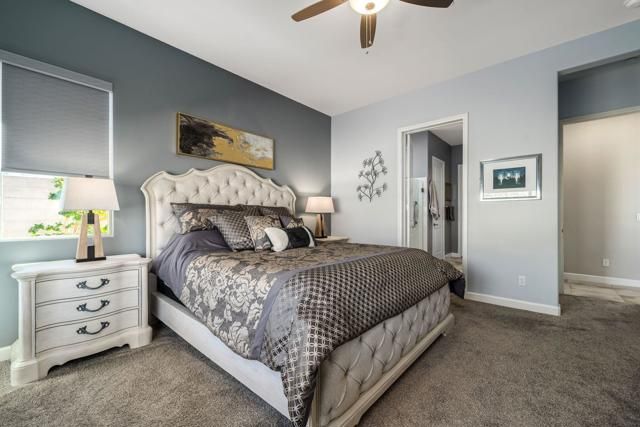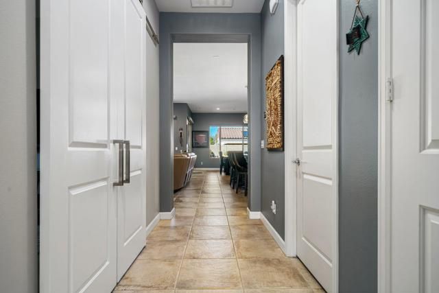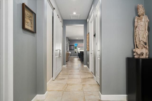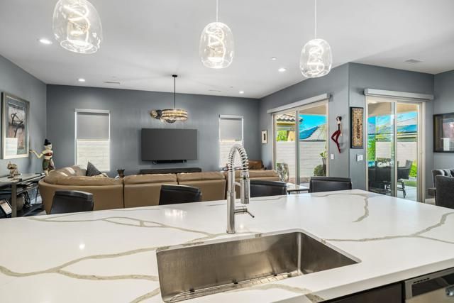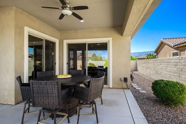 This exceptional, customized PRESERVE plan is in the prestigious 55+ gated community of Del Webb Rancho Mirage, on a quiet street with mountain views and custom landscaping, on a private, gated lot. The residence welcomes you through a striking custom glass door that enhances natural light. The elegantly appointed interior features custom paint, upgraded tile and carpeting, and electric shades in the great room. The home offers three bedrooms. The guest room was thoroughly redesigned, featuring a solid-core door to emulate a fully enclosed ensuite experience. The other guest suite features solid-core wood barn doors and is currently utilized as a den. A spacious living/great room with an additional sliding glass door and upgraded lighting fixtures is the perfect place to relax and enjoy the private views.The kitchen is thoughtfully designed with luxury upgrades, including Winstead maple cabinetry, a marbleized quartz island, a large single-basin sink, and Whirlpool appliances, including a counter-depth refrigerator and a generous walk-in pantry. The laundry room features added cabinetry and is pre-plumbed for a sink. The garage provides ample space for two cars and a golf cart, and includes custom cabinetry, air conditioning, and wiring for an EV charger. 15 leased Tesla solar panels power the property at $103.45 per month.Residents enjoy a low HOA fee that includes a 24-hour guard-gated entrance, a cable and internet package, a clubhouse, pools, tennis courts, pickleball, and additional amenities.