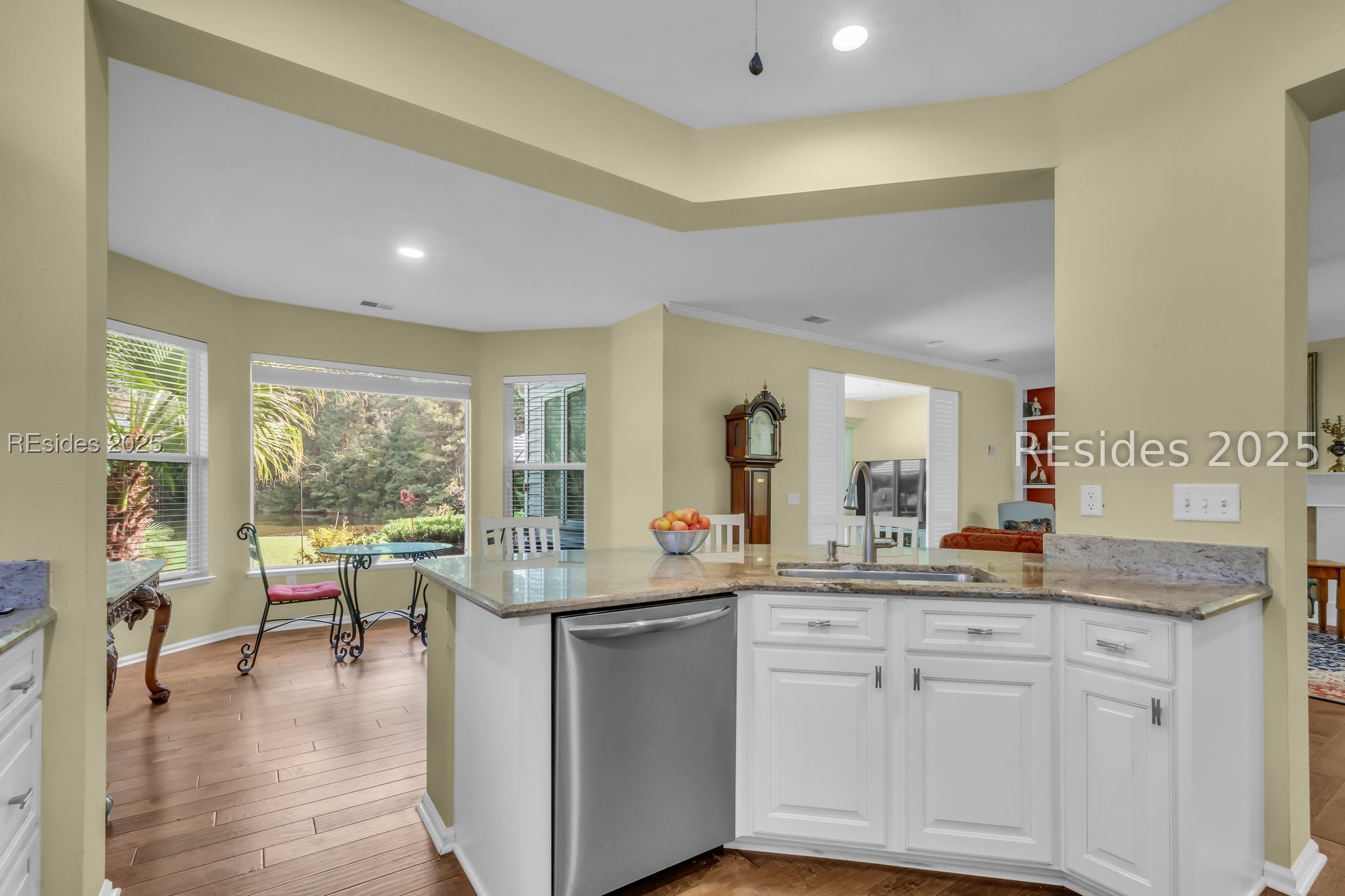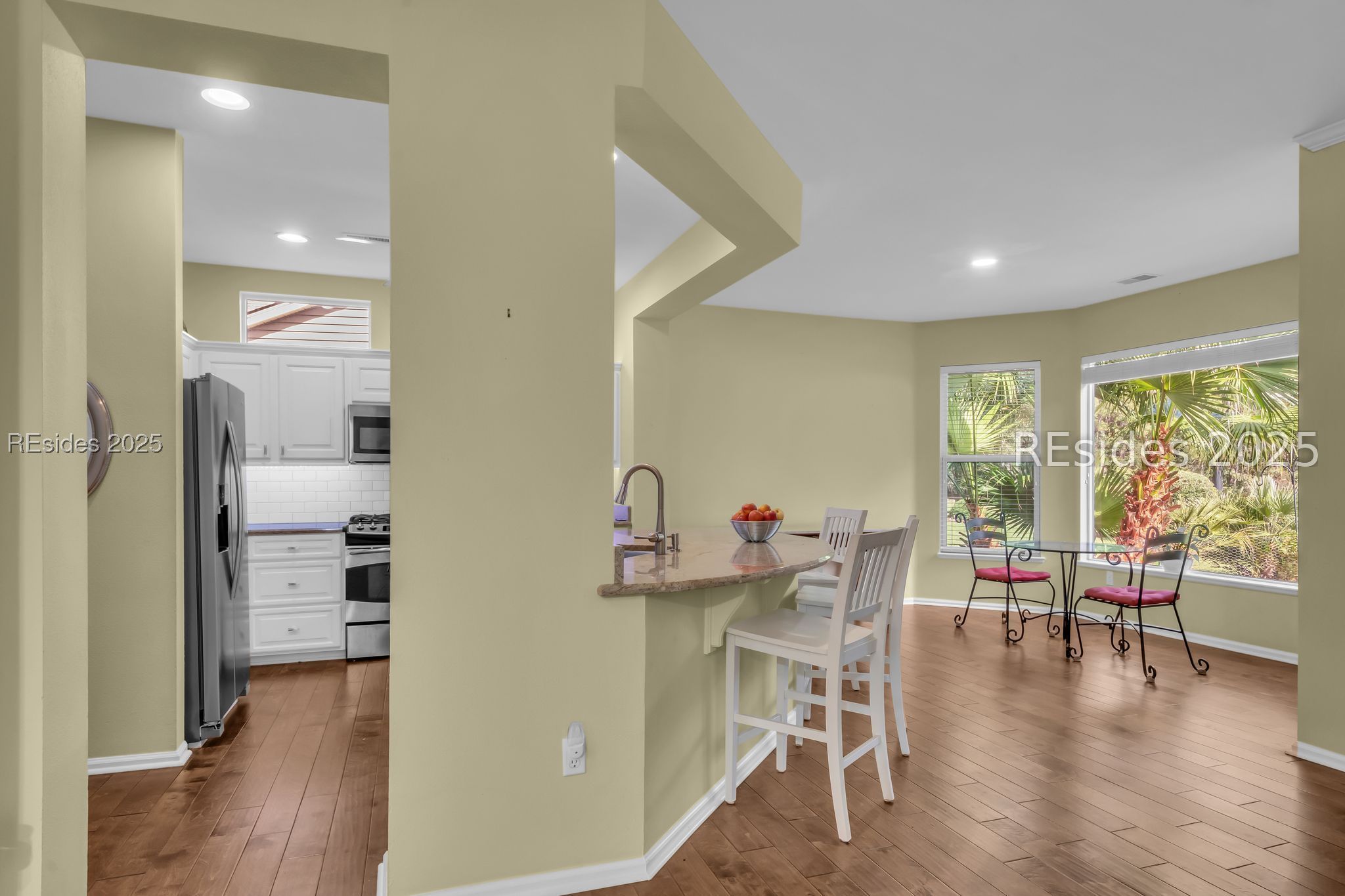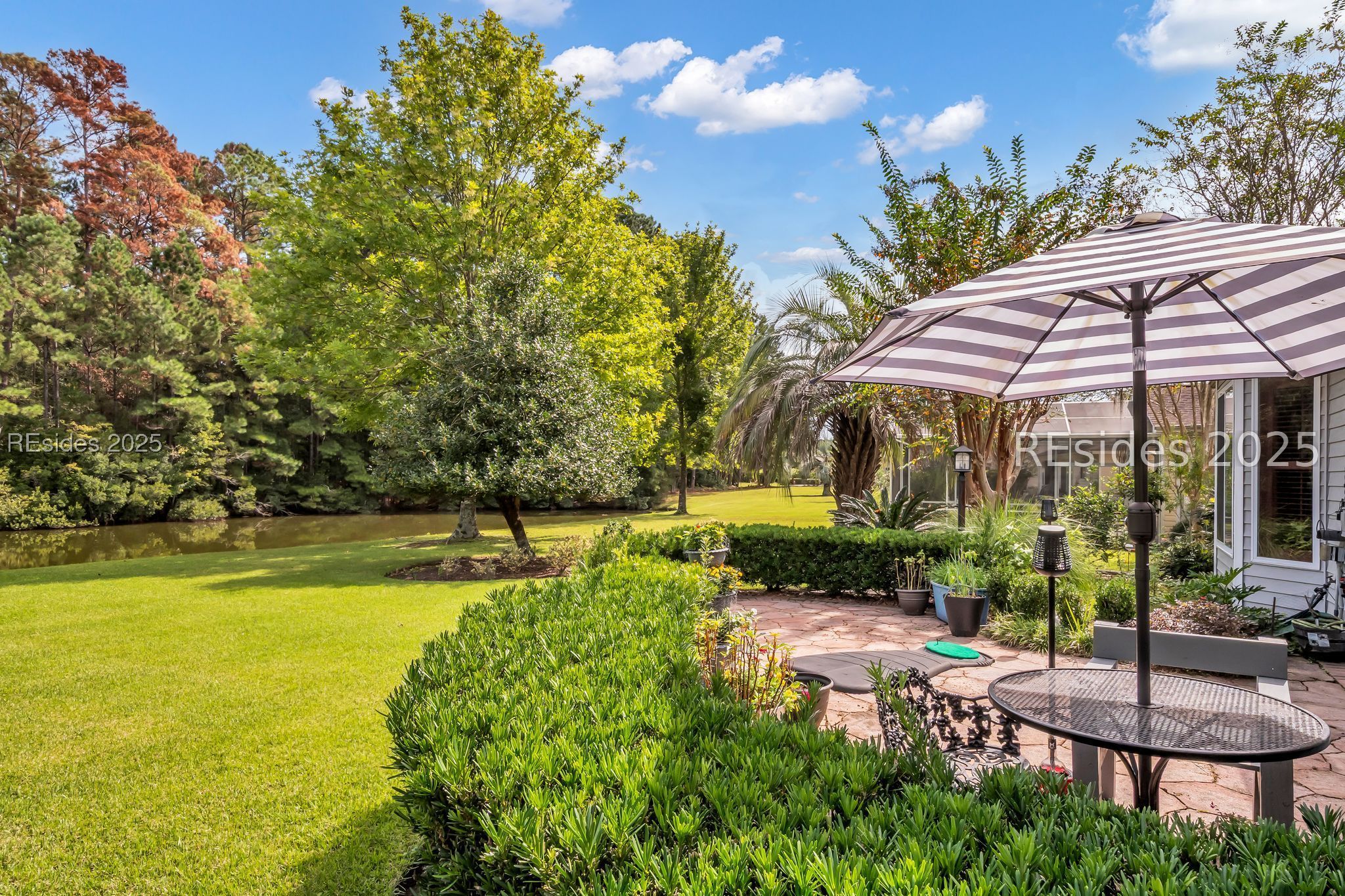 Enjoy one of the best lagoon-to-woods views in Sun City Hilton Head from this desirable 2-bedroom, 2-bath Hamilton/Jefferson home. The Carolina Room overlooks the brick paver patio and private backyard, creating a perfect spot to relax and take in the stunning scenery. Inside, the light-filled Great Room with built-ins and fireplace offers a comfortable gathering space, while the kitchen features refaced cabinets, a lowered bar with quartz countertops, stainless steel appliances, and a gas stove. A mini bonus room off the kitchen provides flexible space for an office, storage, craft area, or laundry room. Both bathrooms have been updated with quartz countertops for a fresh, modern touch. Additional highlights include wood floors in the main living areas, bay windows, plantation shutters and blinds, smooth ceilings, ceiling fans, vinyl siding, and a paver-lined driveway for added curb appeal. The home's convenient location near the front gate and Town Center amenities makes this must-see. Don't miss this opportunity to enjoy stunning lagoon views and Lowcountry living. Schedule your tour today!