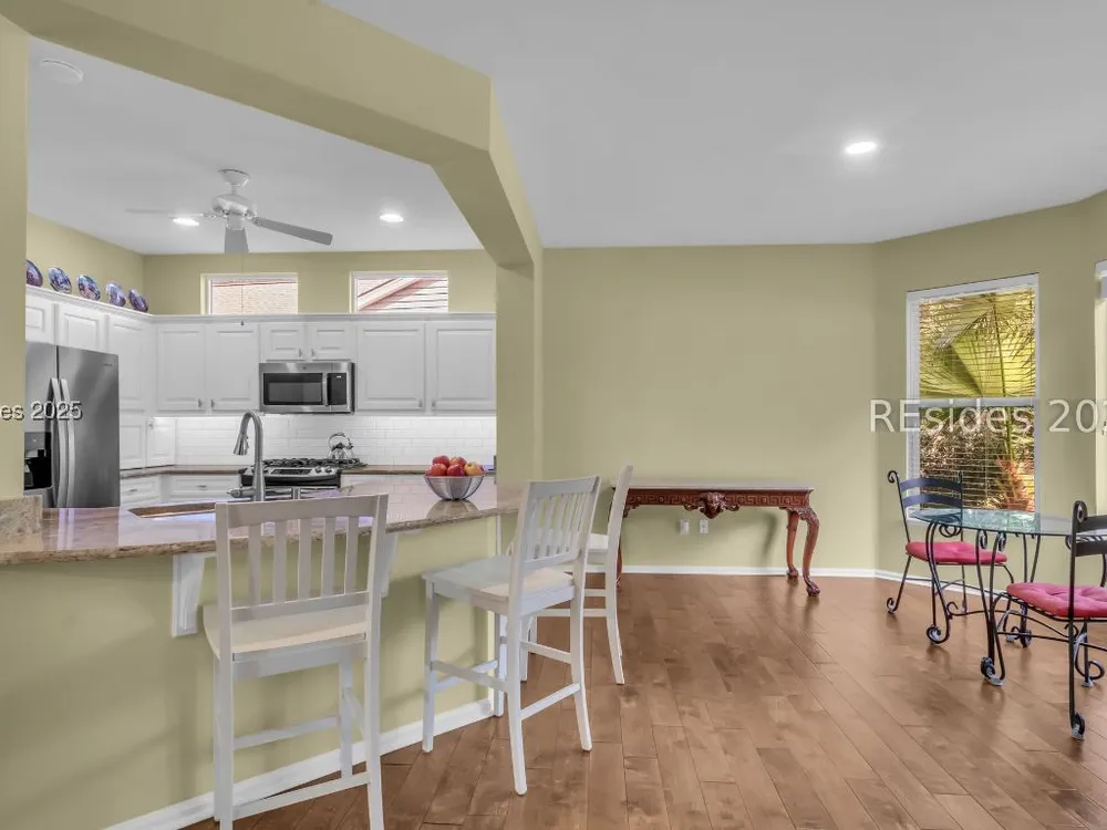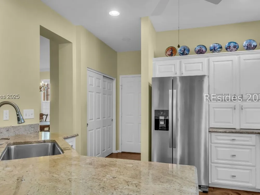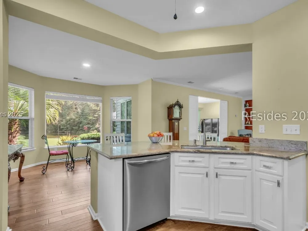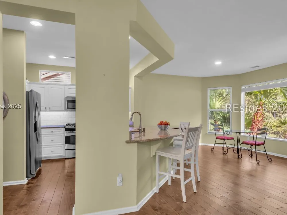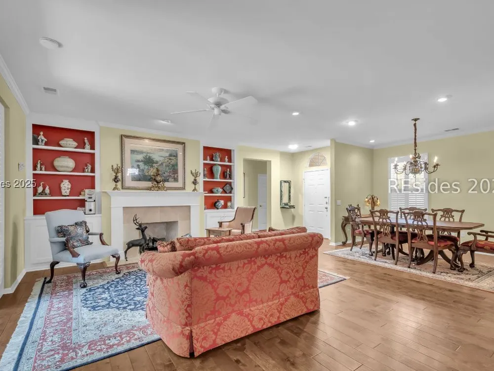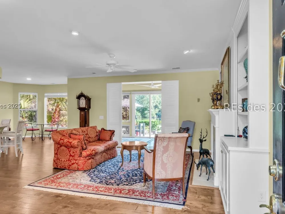 Enjoy one of the best lagoon-to-woods views in Sun City Hilton Head from this desirable 2-bedroom, 2-bath Hamilton/Jefferson home. The Carolina Room overlooks the brick paver patio and private backyard, creating a perfect spot to relax and take in the stunning scenery. Inside, the light-filled Great Room with built-ins and gas fireplace offers a comfortable gathering space, while the kitchen features refaced cabinets, a lowered bar with quartz countertops, stainless steel appliances, and a gas stove. A mini bonus room off the kitchen provides flexible space for an office, storage, craft area, or laundry room. Both bathrooms have been updated with quartz countertops for a fresh, modern touch. Additional highlights include wood floors in the main living areas, bay windows, plantation shutters and blinds, smooth ceilings, ceiling fans, vinyl siding, and a paver-lined driveway for added curb appeal. The home's convenient location near the front gate and Town Center amenities makes this must-see. Don't miss this opportunity to enjoy stunning lagoon views and Lowcountry living. Schedule your tour today!