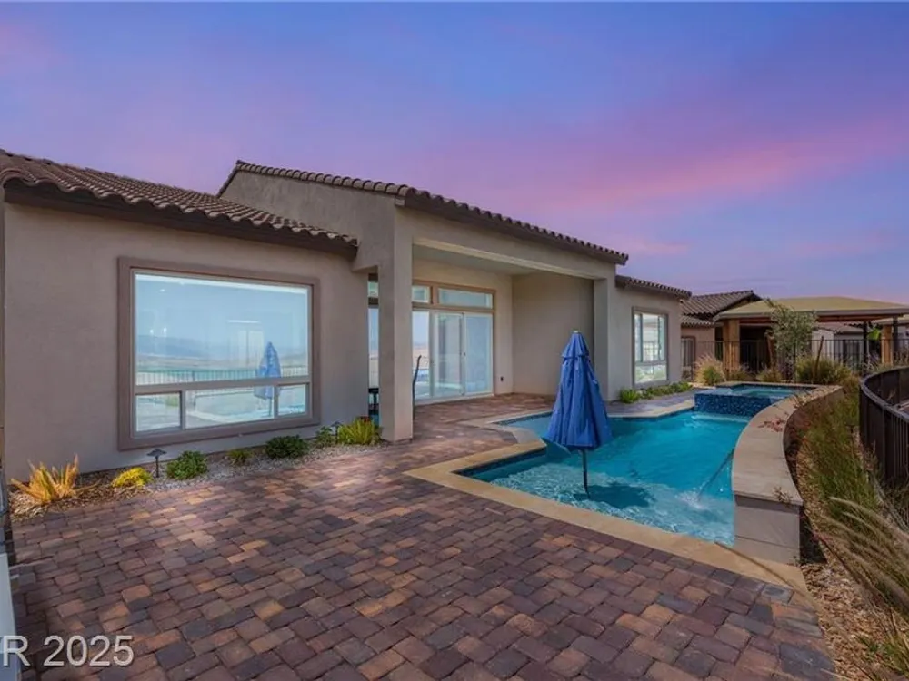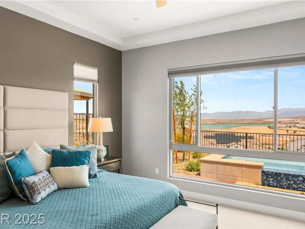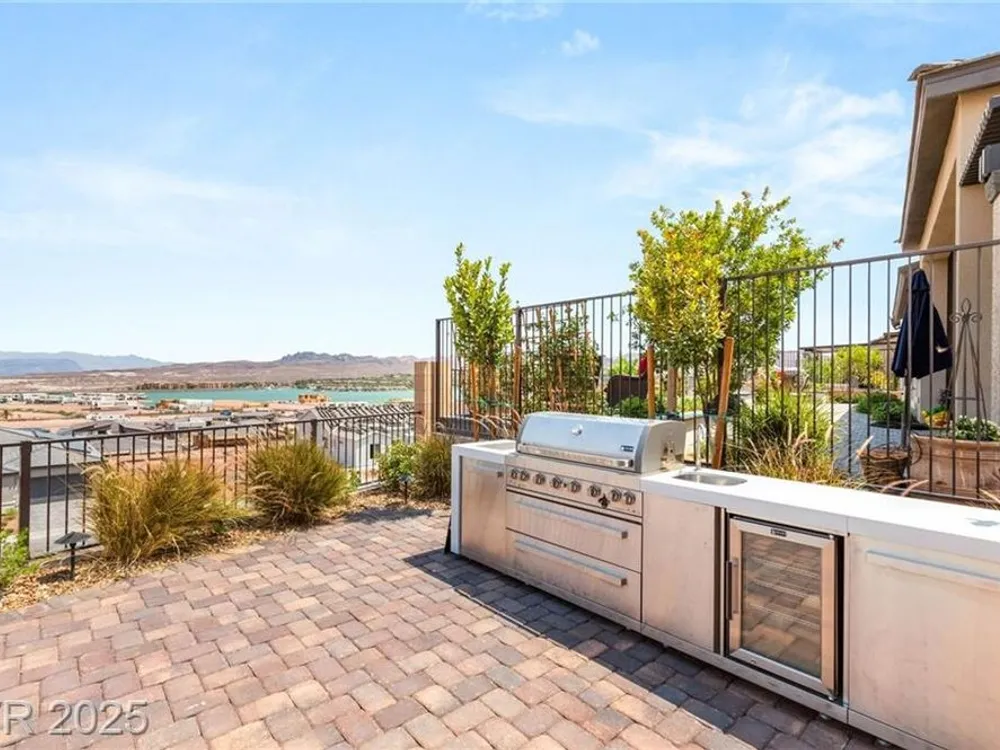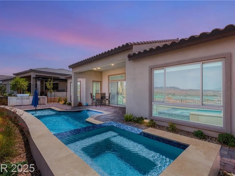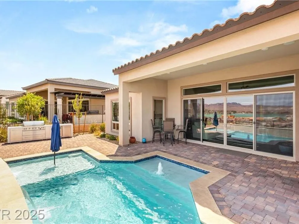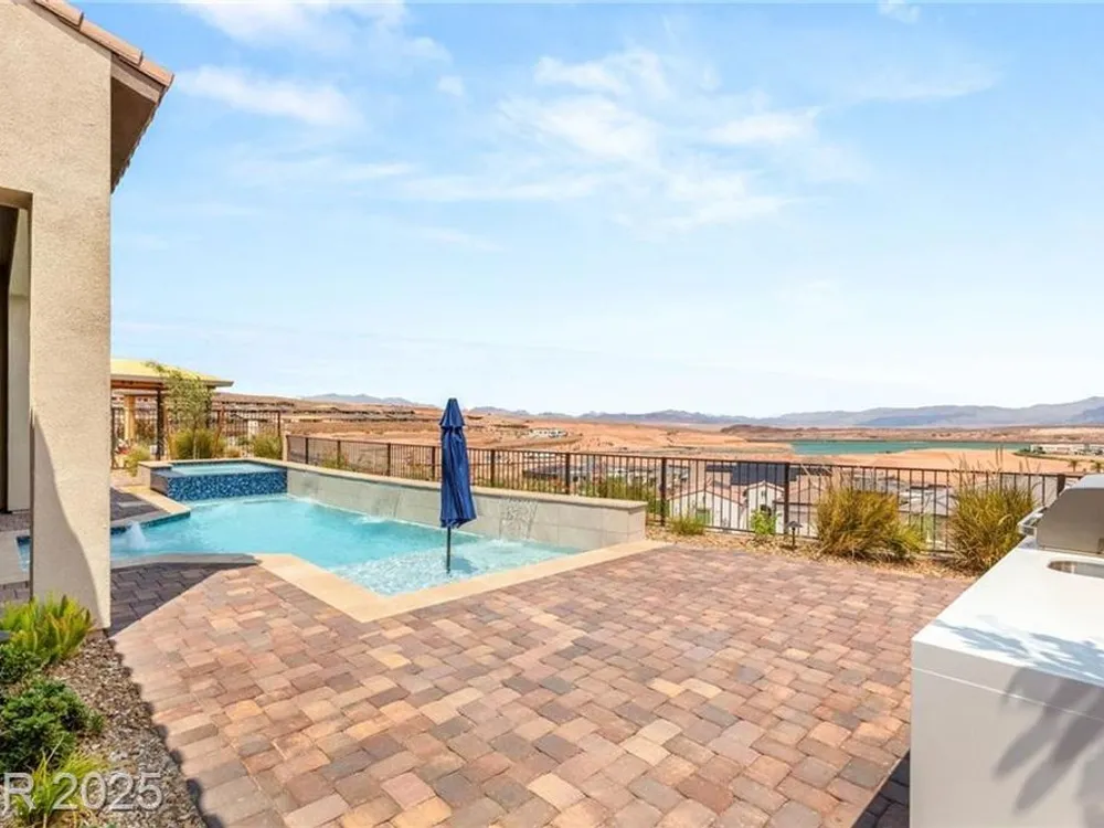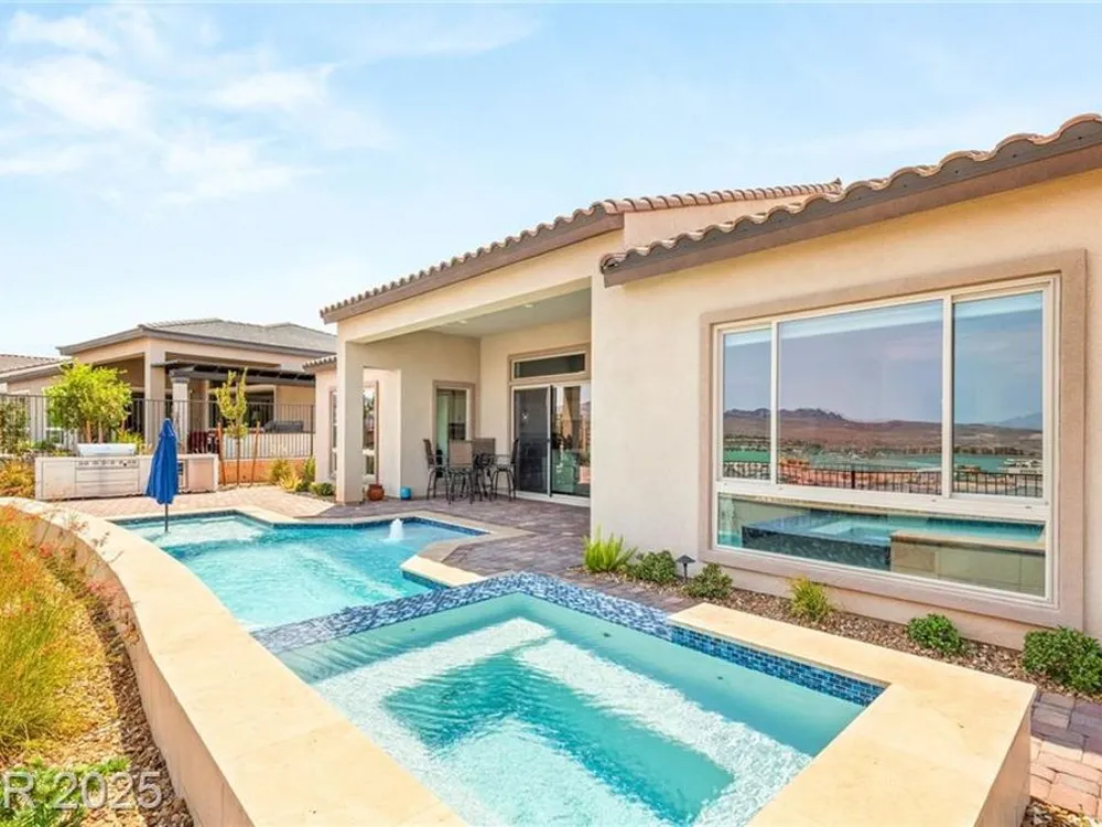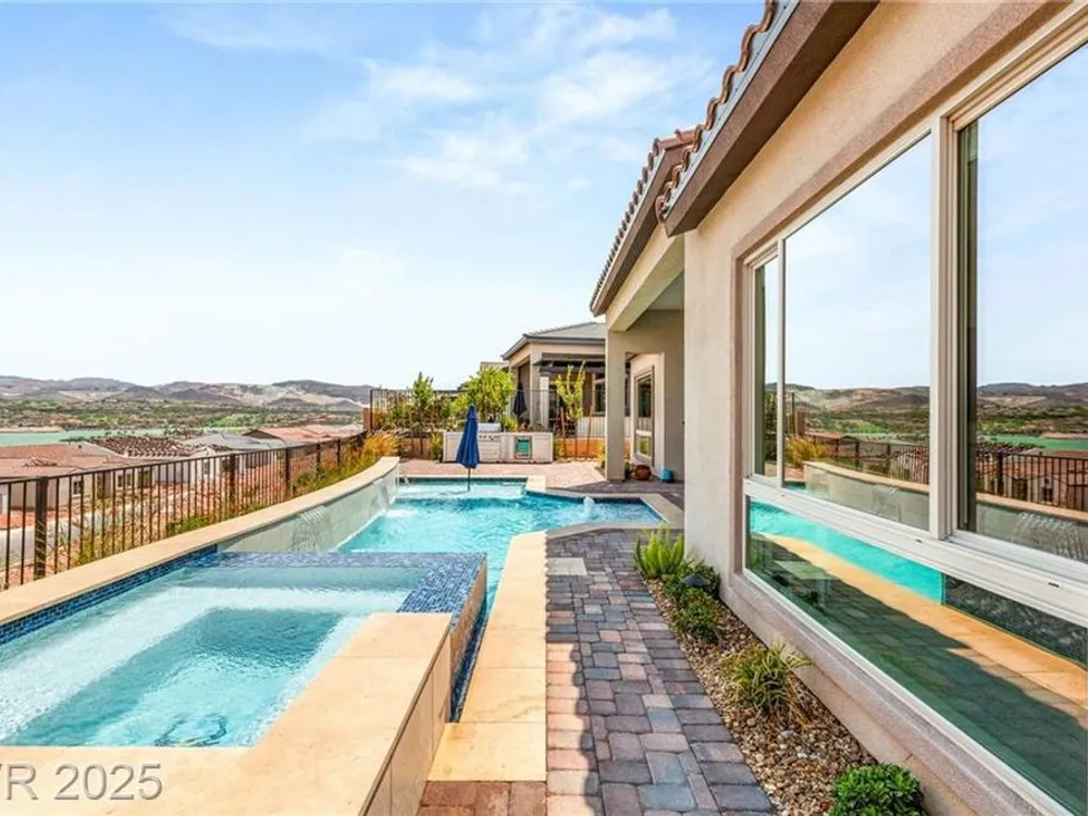 Stunning single story in the lifestyle community of Del Webb Lake Las Vegas! Situated on Stone Mesa, this home sits on an oversized homesite with 180 degree views of Lake Las Vegas. Step through your front door into a massive open concept living area flooded with natural light. You will love the tray ceilings, A/V built-in w/surround sound, luxury plank floors, stacked center slider w/transom windows and custom light fixtures. Well appointed kitchen w/slab quartz counters, white cabinets, stainless steel Kitchen Aid hood, oven, 5 burner cooktop and oversized pantry. Primary bedroom has an enormous spa shower, separate vanities and spacious walk-in closet.Relax under your covered patio and enjoy a STUNNING custom pool, spa, built in BBQ with wet bar, and griddle. Home has window shades throughout, epoxied garage, tankless WH, high SEER A/C w/cathedralized cellulose insulation. State of the art clubhouse with social calendar, 2 pools, hot tub, pickleball, fitness center, and more!