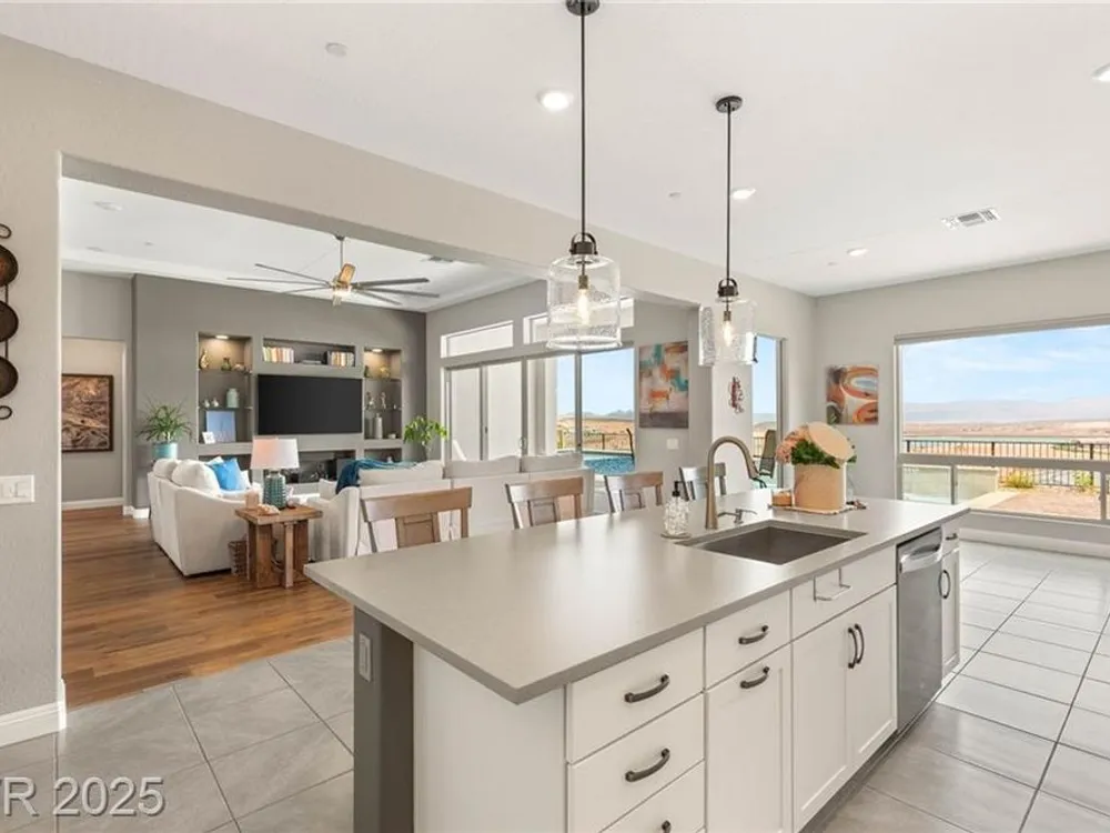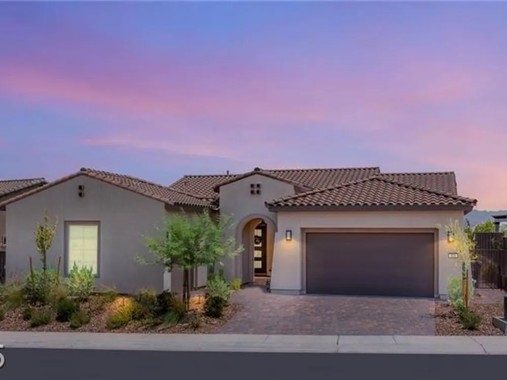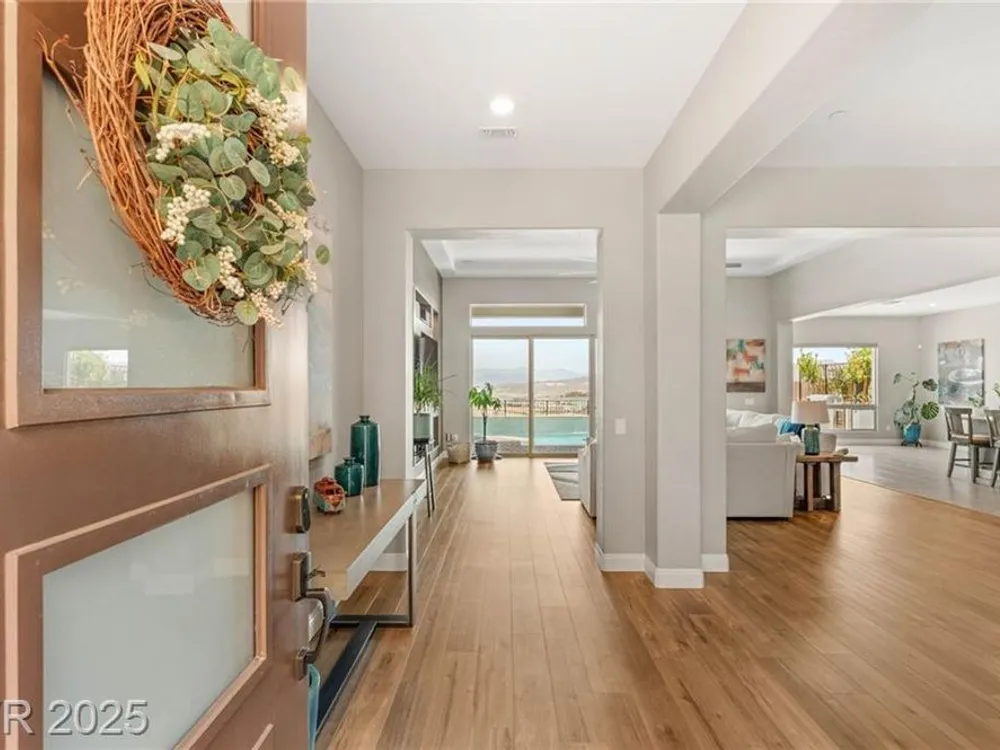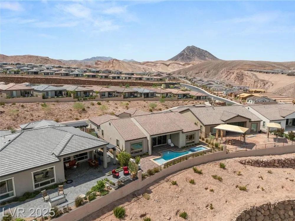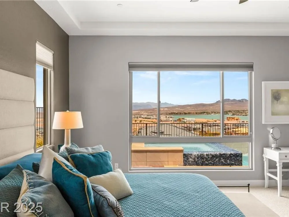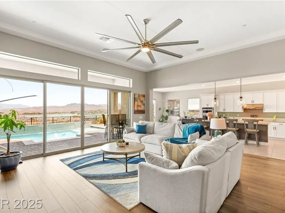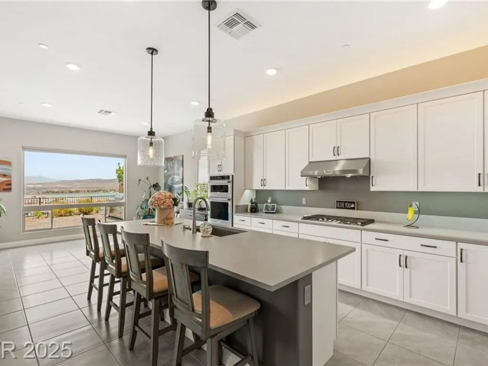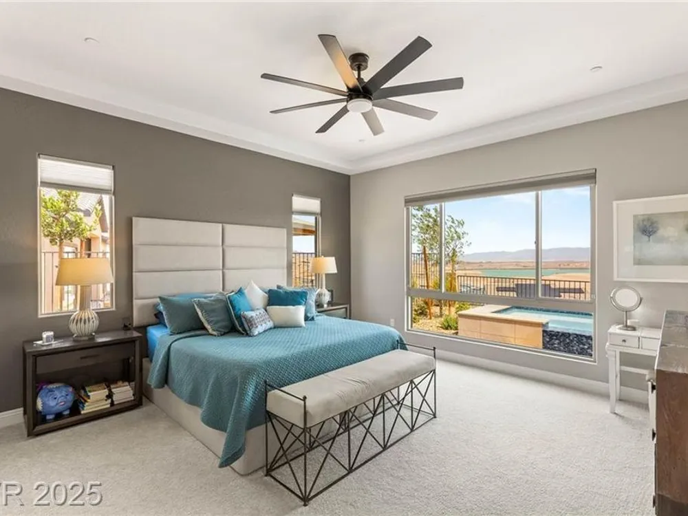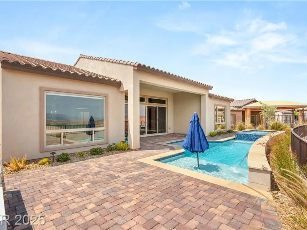 Stunning single story in the lifestyle community of Del Webb Lake Las Vegas! Situated on Stone Mesa, this home sits on an oversized homesite with 180 degree views of Lake Las Vegas. Step through your front door into a massive open concept living area flooded with natural light. You will love the tray ceilings, A/V built-in w/surround sound, luxury plank floors, stacked center slider w/transom windows and custom light fixtures. Well appointed kitchen w/slab quartz counters, white cabinets, stainless steel Kitchen Aid hood, oven, 5 burner cooktop and oversized pantry. Primary bedroom has an enormous spa shower, separate vanities and spacious walk-in closet.Relax under your covered patio and enjoy a STUNNING custom pool, spa, built in BBQ with wet bar, and griddle. Home has window shades throughout, epoxied garage, tankless WH, high SEER A/C w/cathedralized cellulose insulation. State of the art clubhouse with social calendar, 2 pools, hot tub, pickleball, fitness center, and more!
