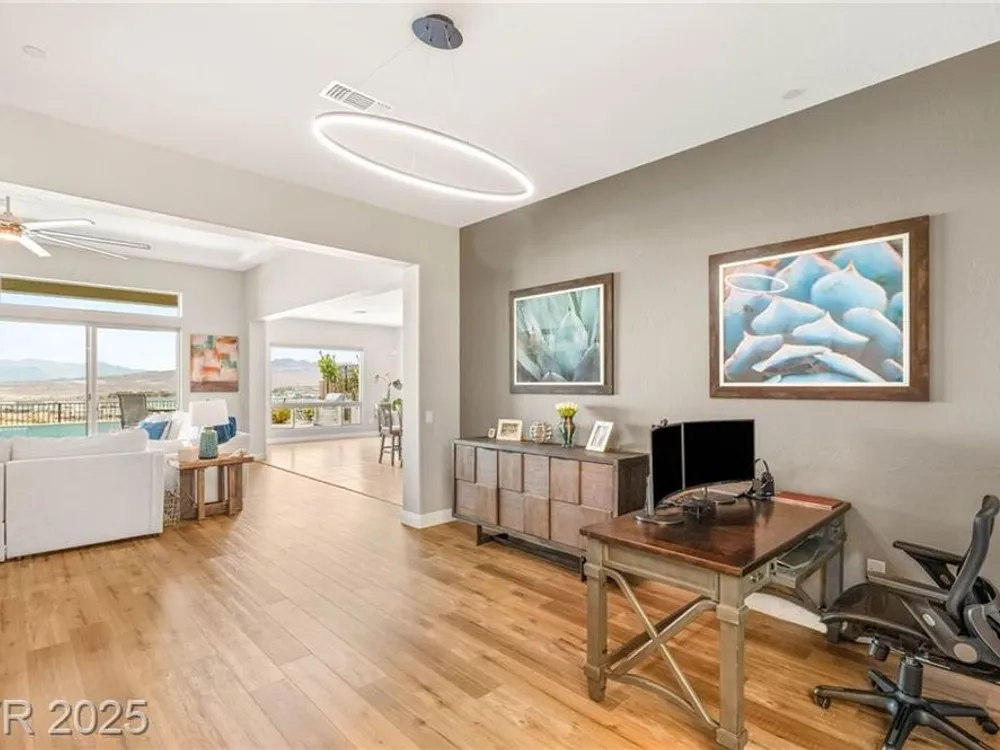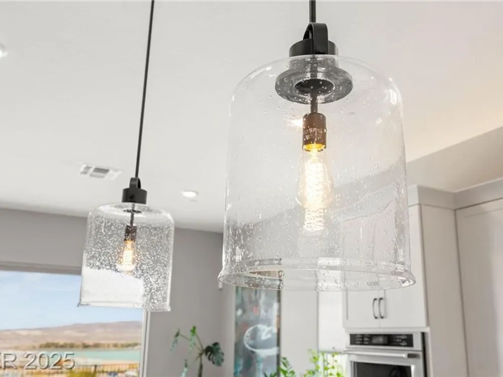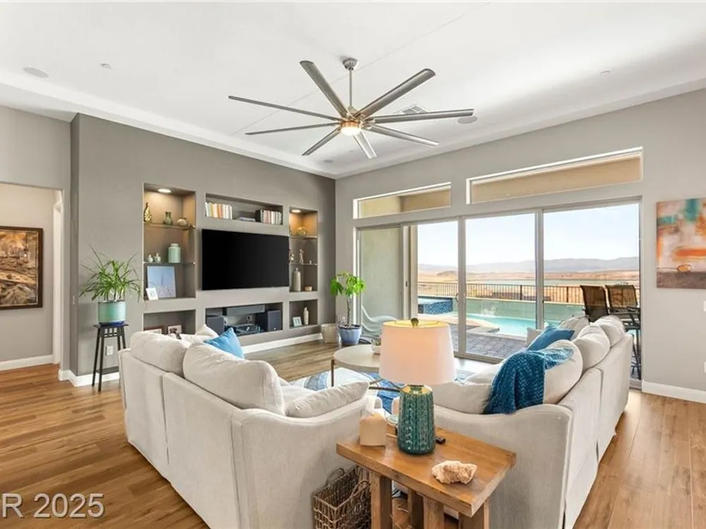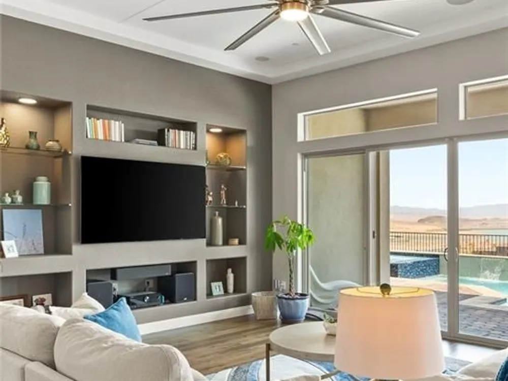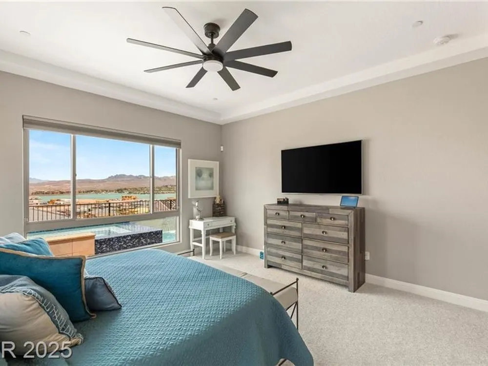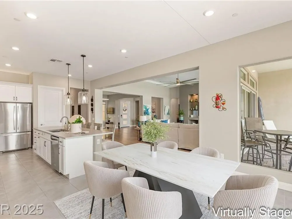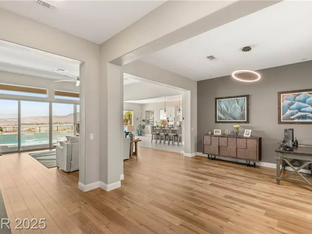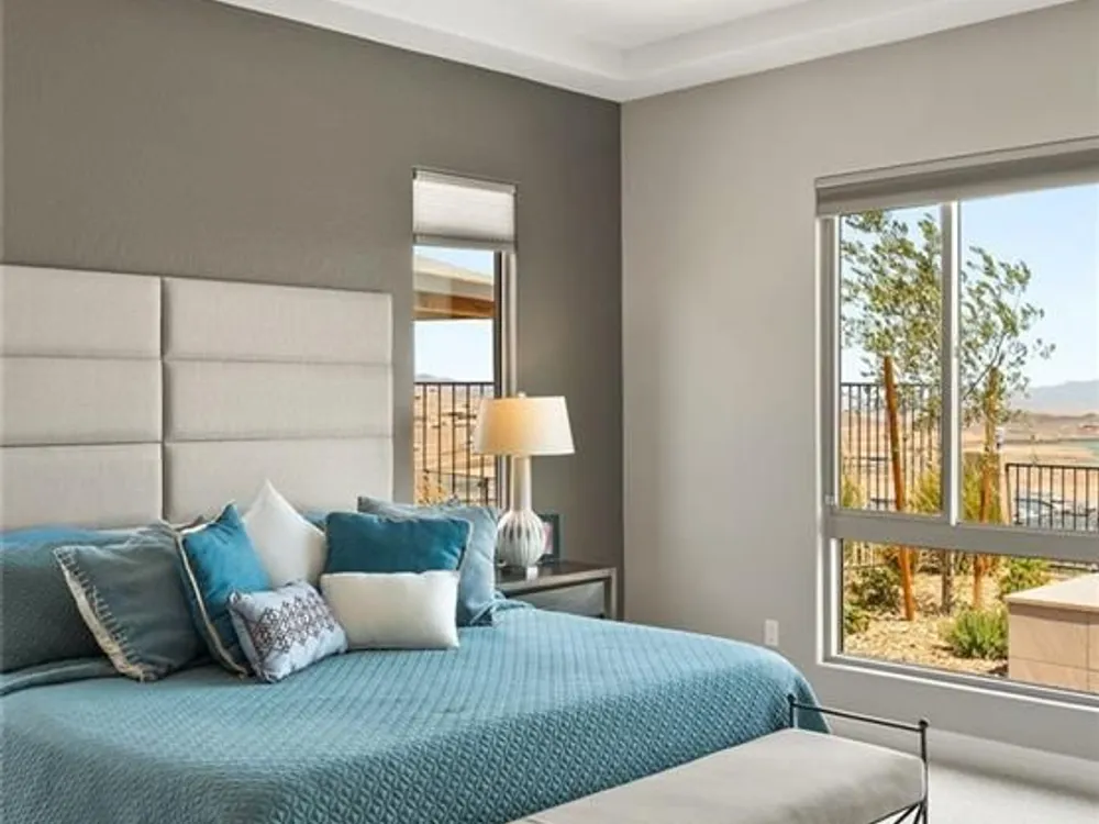 Stunning single story in the lifestyle community of Del Webb Lake Las Vegas! Situated on Stone Mesa, this home sits on an oversized homesite with 180 degree views of Lake Las Vegas. Step through your front door into a massive open concept living area flooded with natural light. You will love the tray ceilings, A/V built-in w/surround sound, luxury plank floors, stacked center slider w/transom windows and custom light fixtures. Well appointed kitchen w/slab quartz counters, white cabinets, stainless steel Kitchen Aid hood, oven, 5 burner cooktop and oversized pantry. Primary bedroom has an enormous spa shower, separate vanities and spacious walk-in closet.Relax under your covered patio and enjoy a STUNNING custom pool, spa, built in BBQ with wet bar, and griddle. Home has window shades throughout, epoxied garage, tankless WH, high SEER A/C w/cathedralized cellulose insulation. State of the art clubhouse with social calendar, 2 pools, hot tub, pickleball, fitness center, and more!