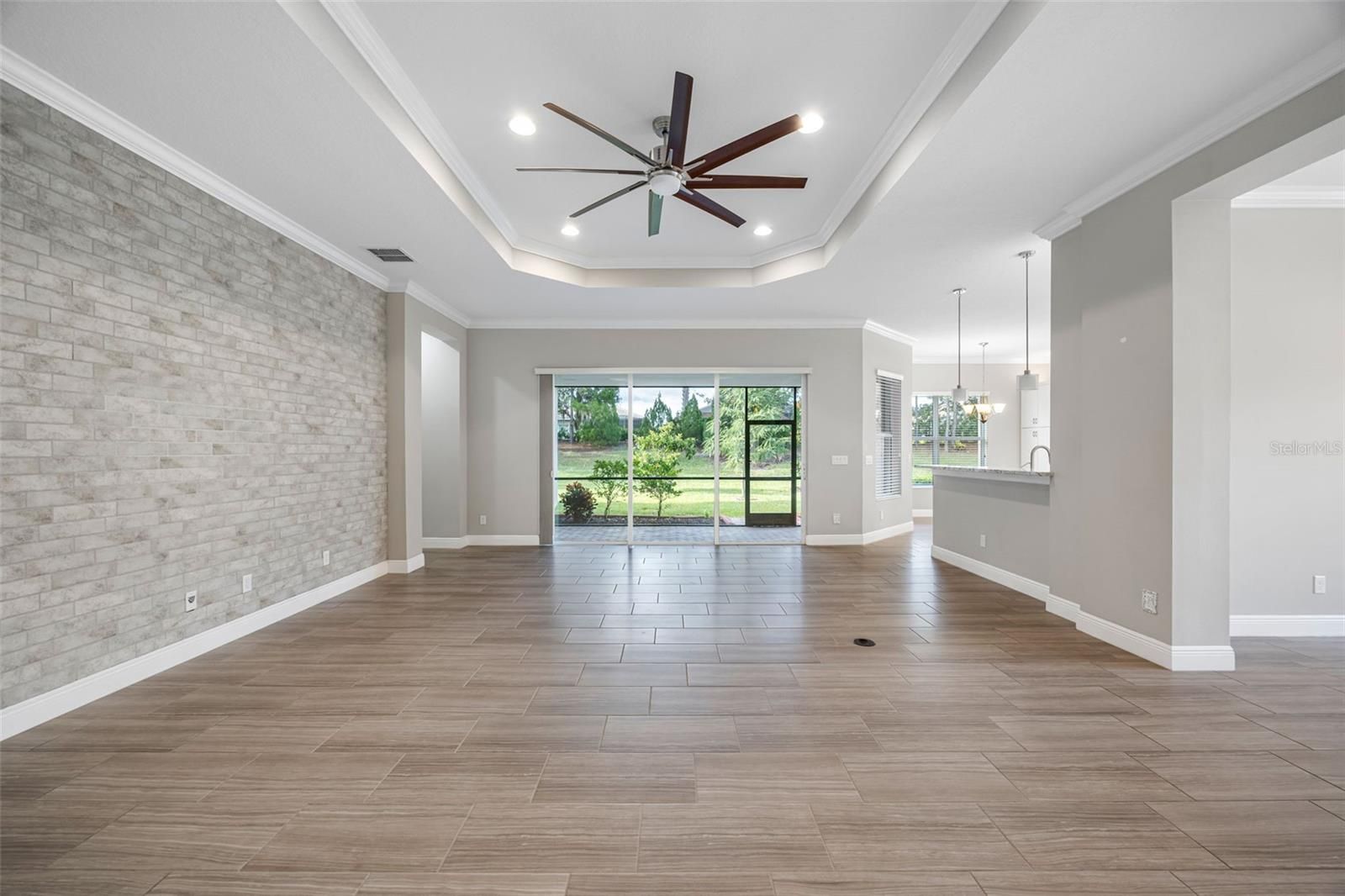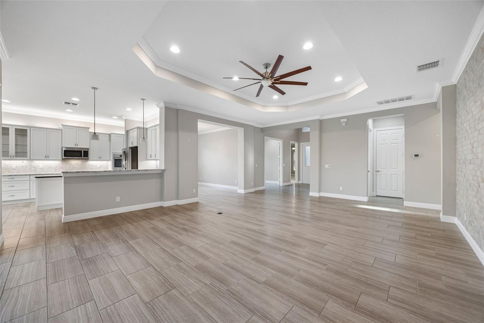 - Ceiling Fan(s), Crown Molding, Eat-in Kitchen, High Ceilings, Living/Dining Room, Open Floorplan, Solid Surface Counters, Window Treatments