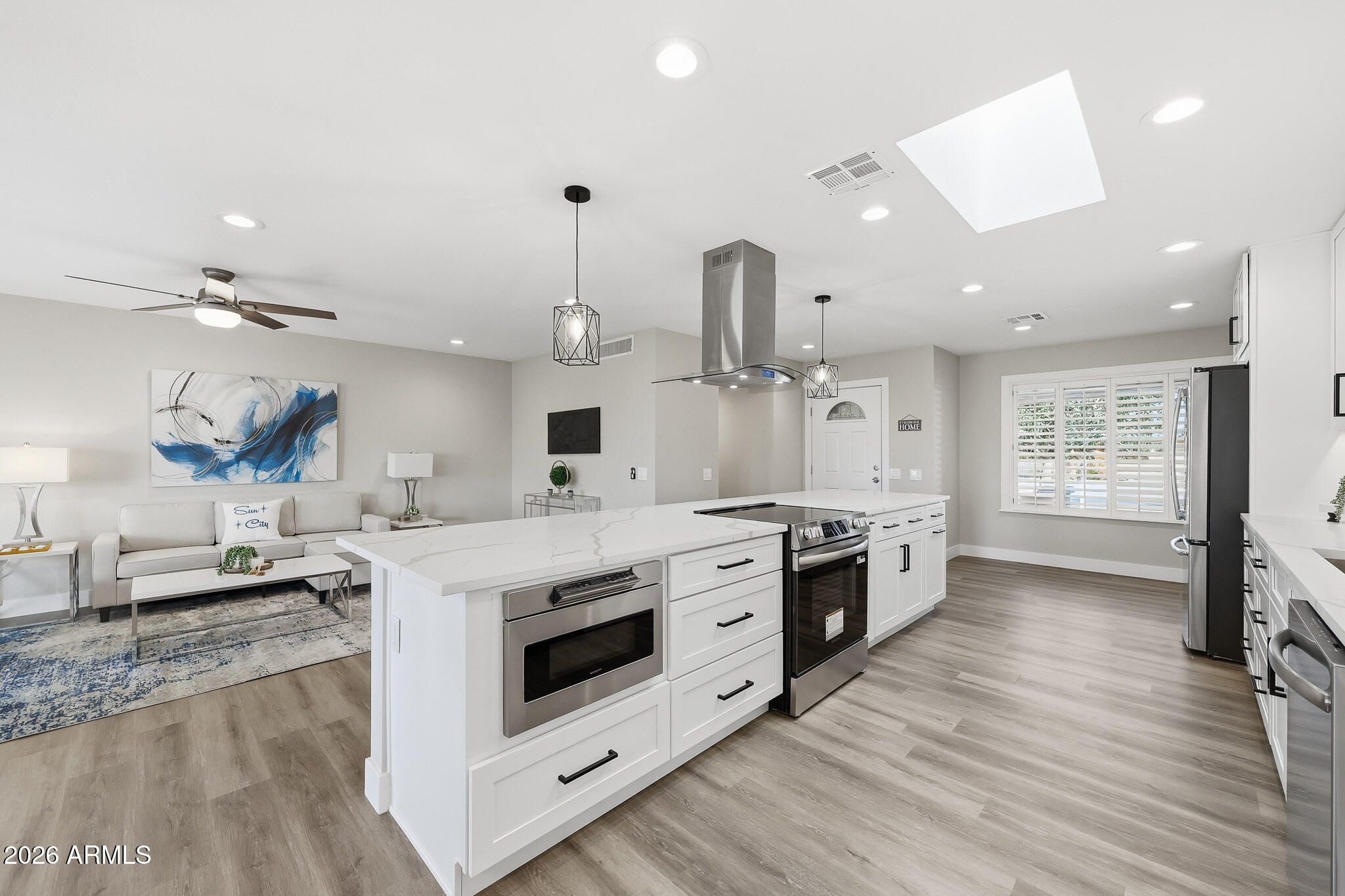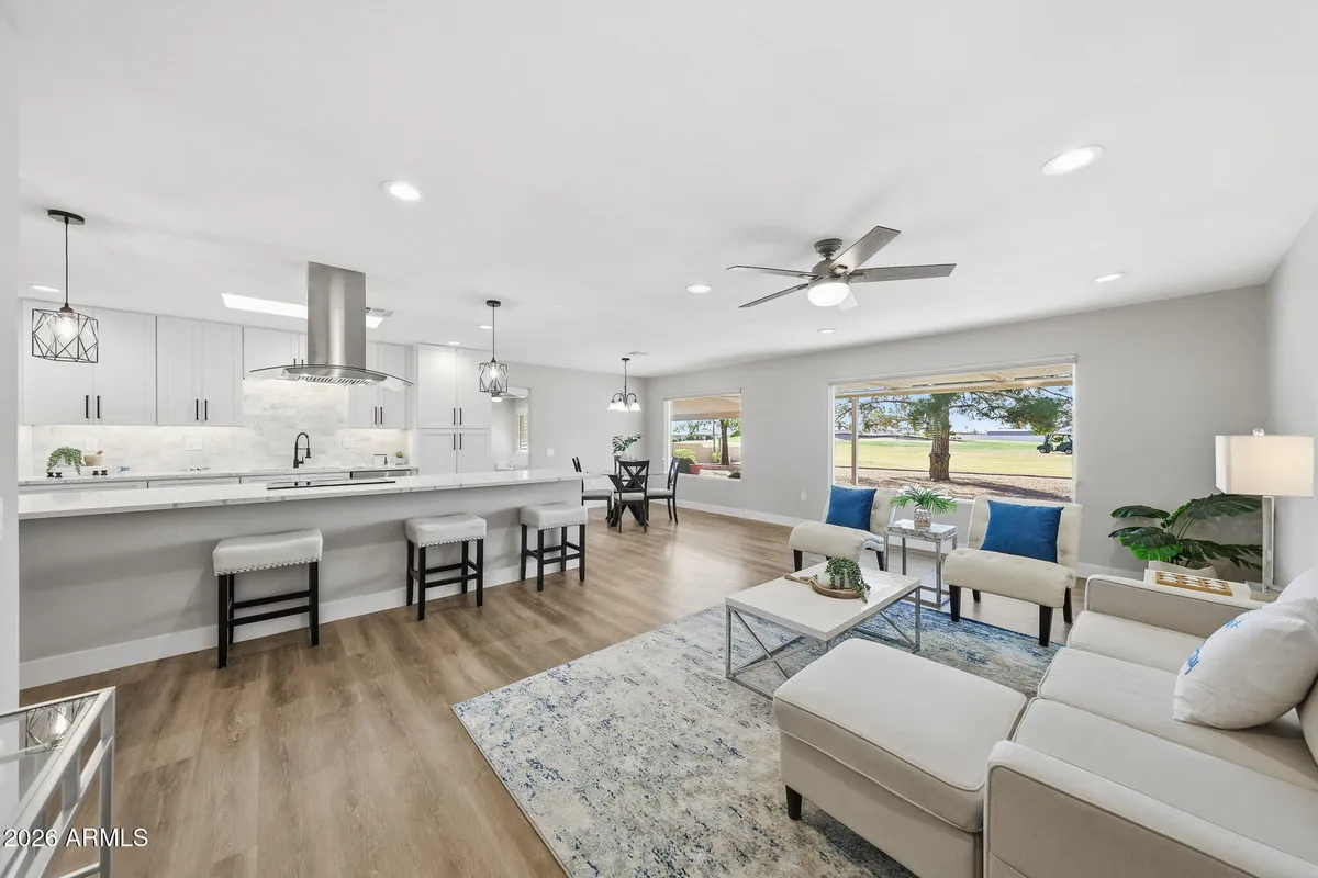 Exceptionally Updated! 14th Hole of Riverview Golf Course in Sun City! GOLF CART GARAGE! 3 BR 2 BA Stanford has been completely updated! New open concept Chef's Kitchen w/white soft close quality shaker cabinets with drawers for pots & pans & a built in spice rack. 42''uppers provide massive amounts of storage along with the pantry! New Calcatta Quartz counters throughout kitchen and baths. New luxury vinyl plank flooring throughout home, all popcorn removed (even the garage!) Primary bedroom with ensuite is complete with all new custom shower, dual vanities and a walk in closet! Guest rooms feature updated built in storage; Guest bath updates showcase a custom shower! Updated indoor laundry! Newer windows throughout. Newer roof, LED lighting. Perfect location close to Bell Rec Center!