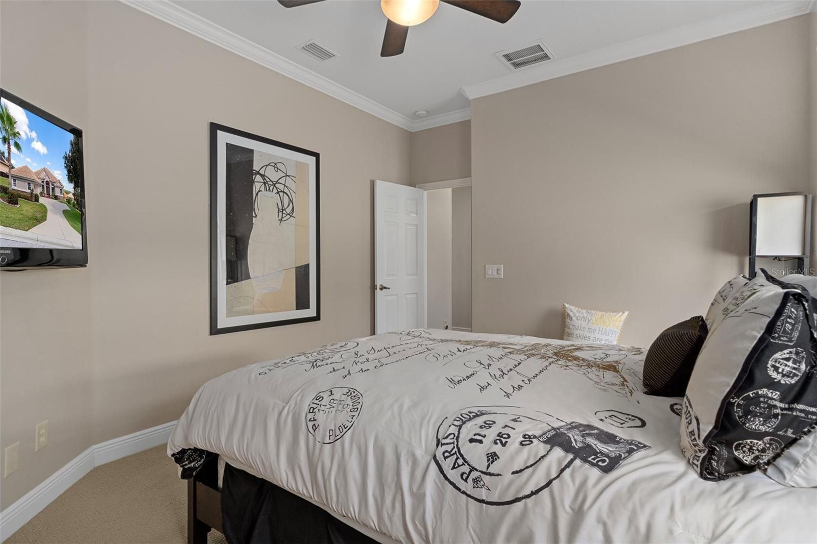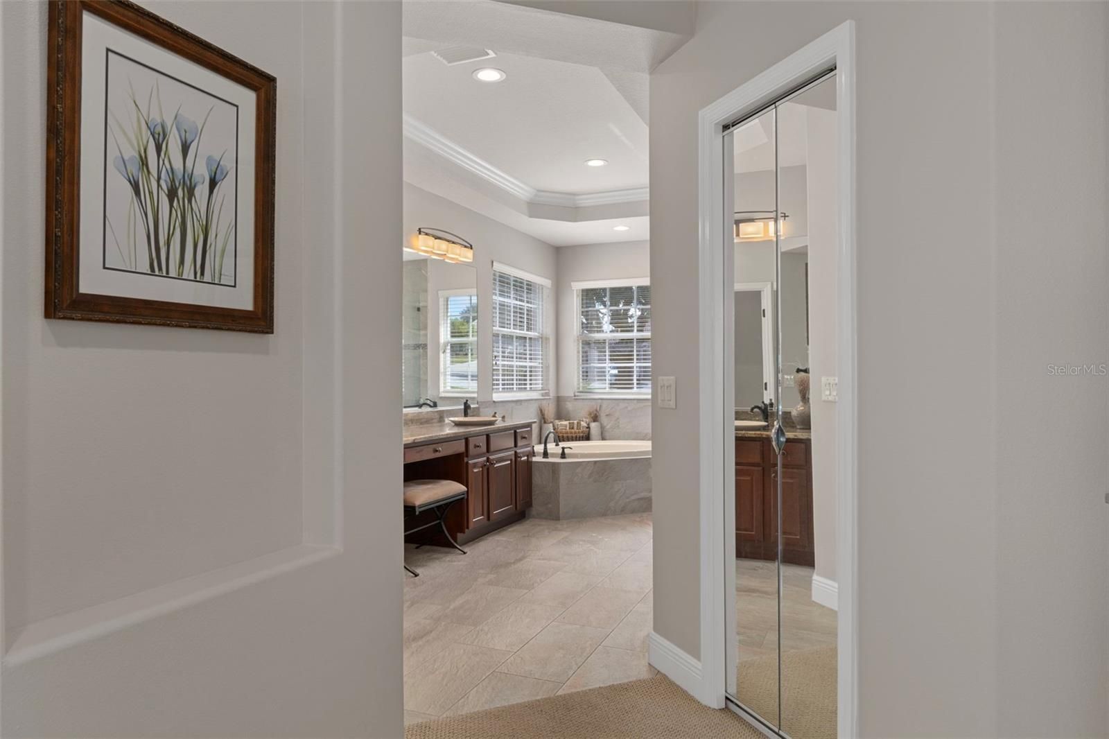 - Ceiling Fan(s), Crown Molding, High Ceilings, Main Level Primary, Solid-Wood Cabinets, Split Bedrooms, Stone Counters, Thermostat, Tray Ceiling(s), Walk-In Closet(s), Window Treatments