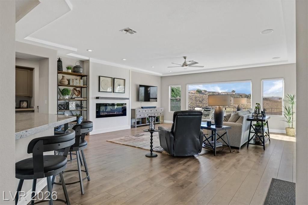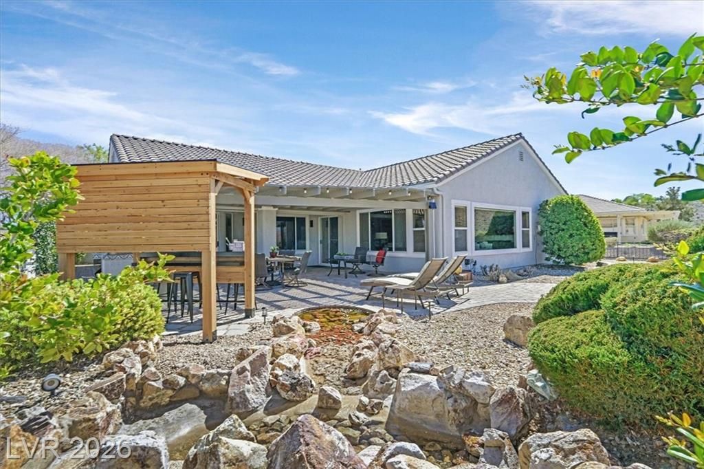 Views in backyard and beyond! Beautifully upgraded home w/ views in prestigious Sun City Anthem a fabulous 55+ community. Premier extended Arlington model with modern fireplace w/ mountain & city light views.The backyard has been renovated and boasts beautiful trees for privacy & great views. Pub style seating area gives character! The double door entry opens to the spacious formal living & dining area.Great room w/natural light & gorgeous sunset views. Beautiful views to backyard from great room.Easy clean luxury vinyl flooring throughout. Sliding glass door to the backyard for easy BBQ access.Kitchen w/beautiful granite counters and backsplash.Lots of cabinetry too. Primary bedroom is separate from the other bedrooms.Primary bedroom is spacious, bright & has a sliding glass door to the backyard..Primary bath is modern w/separate tub & shower & 2 beautiful vanities.There are 2 rooms and a second bath on the opposite side of the house. Bedroom 3 has no closet. So much more! MUST SEE!