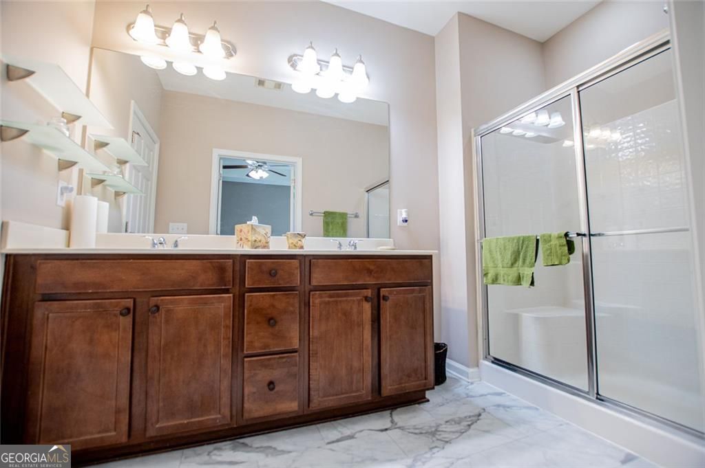 Located within the gates of a premier 55+ active adult community, this beautifully appointed 3BR/3BA home offers refined, low-maintenance living in Douglasville. The thoughtfully designed floor plan features two spacious bedrooms and two full baths on the main level, including a serene primary suite, plus a private upstairs bedroom and full bath ideal for guests or a quiet retreat. The open-concept living, dining, and kitchen areas create an inviting space for entertaining, while the sun-filled sunroom provides a relaxing extension of the living area. A two-car garage plus two additional parking spaces offer exceptional convenience. Residents enjoy resort-style amenities including a clubhouse and swimming pool. HOA fees include all exterior and lawn maintenance, allowing for true lock-and-leave, carefree living. Ideally located near shopping, dining, and medical facilities, this home blends comfort, security, and ease in a sought-after gated community.