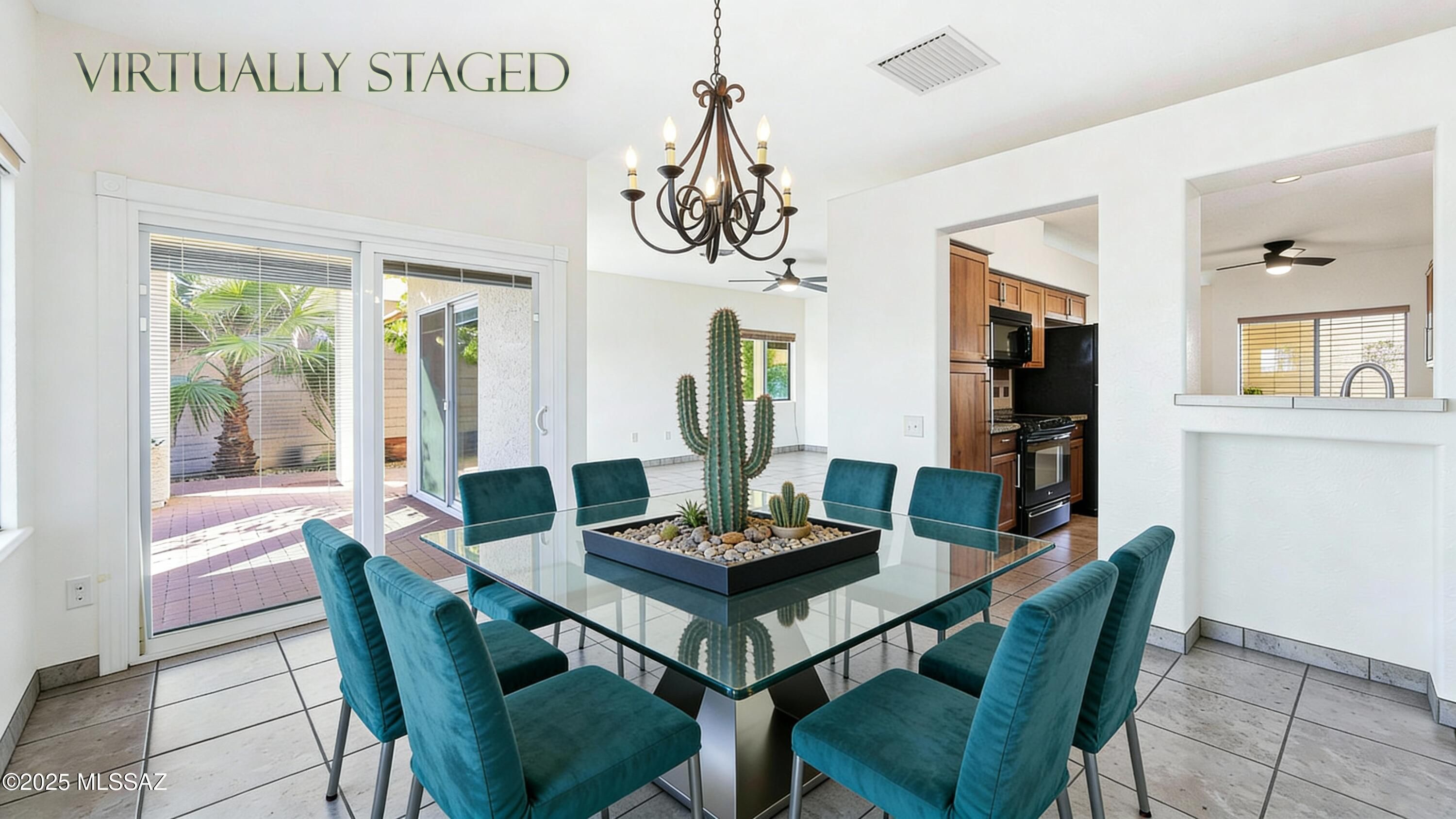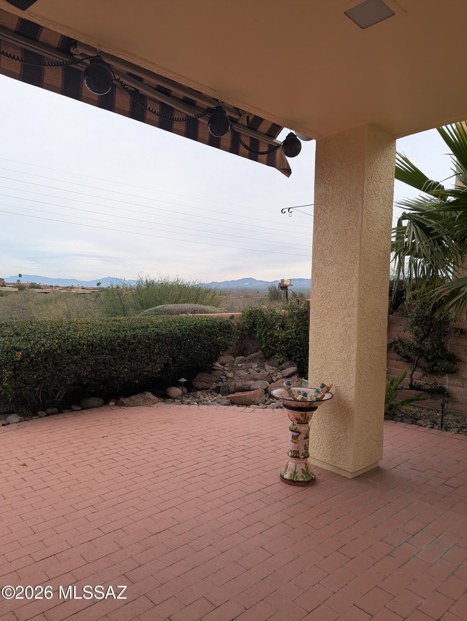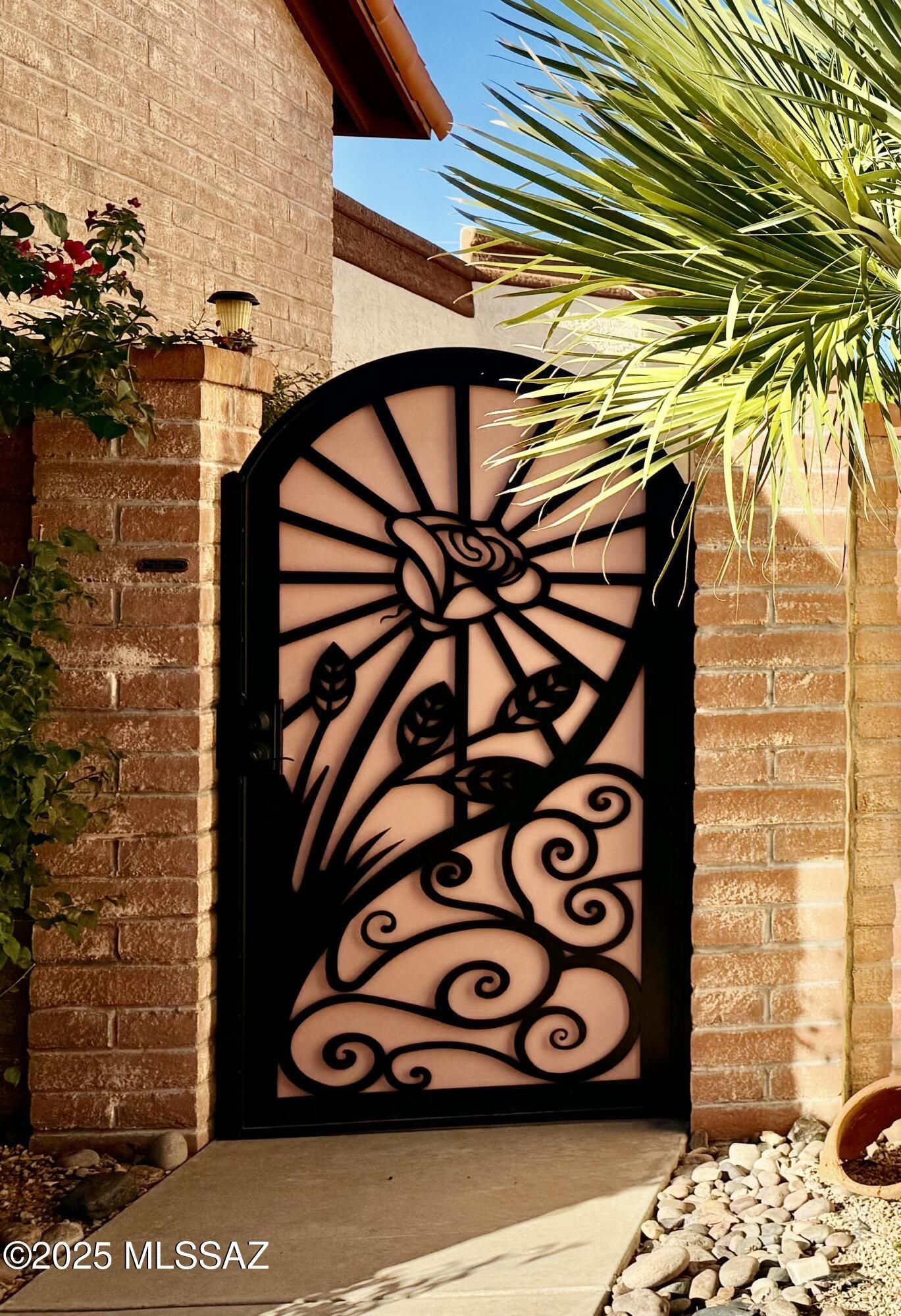 Enter through a charming front courtyard gate into the sun-filled, freshly painted 1706 sq ft home. Two Bedrooms and a den. This floor plan features 9'' ceilings, a kitchen that shines with Black finish appliances, granite countertops, hardwood cabinetry, under cabinet lighting and a breakfast nook. Formal dining area with a sneak peek of the Santa Rita mountains and you own mature pomegranate tree! Primary en suite offers a walk-in closet, double vanity, custom step in shower and water closet. Down the hallway you will find a den/office with French doors and guest bedroom with full bath just across the hall. The garage has abundant storage cabinets, work shop area, man door, utility sink to wash your golf clubs and an area to park your golf cart.