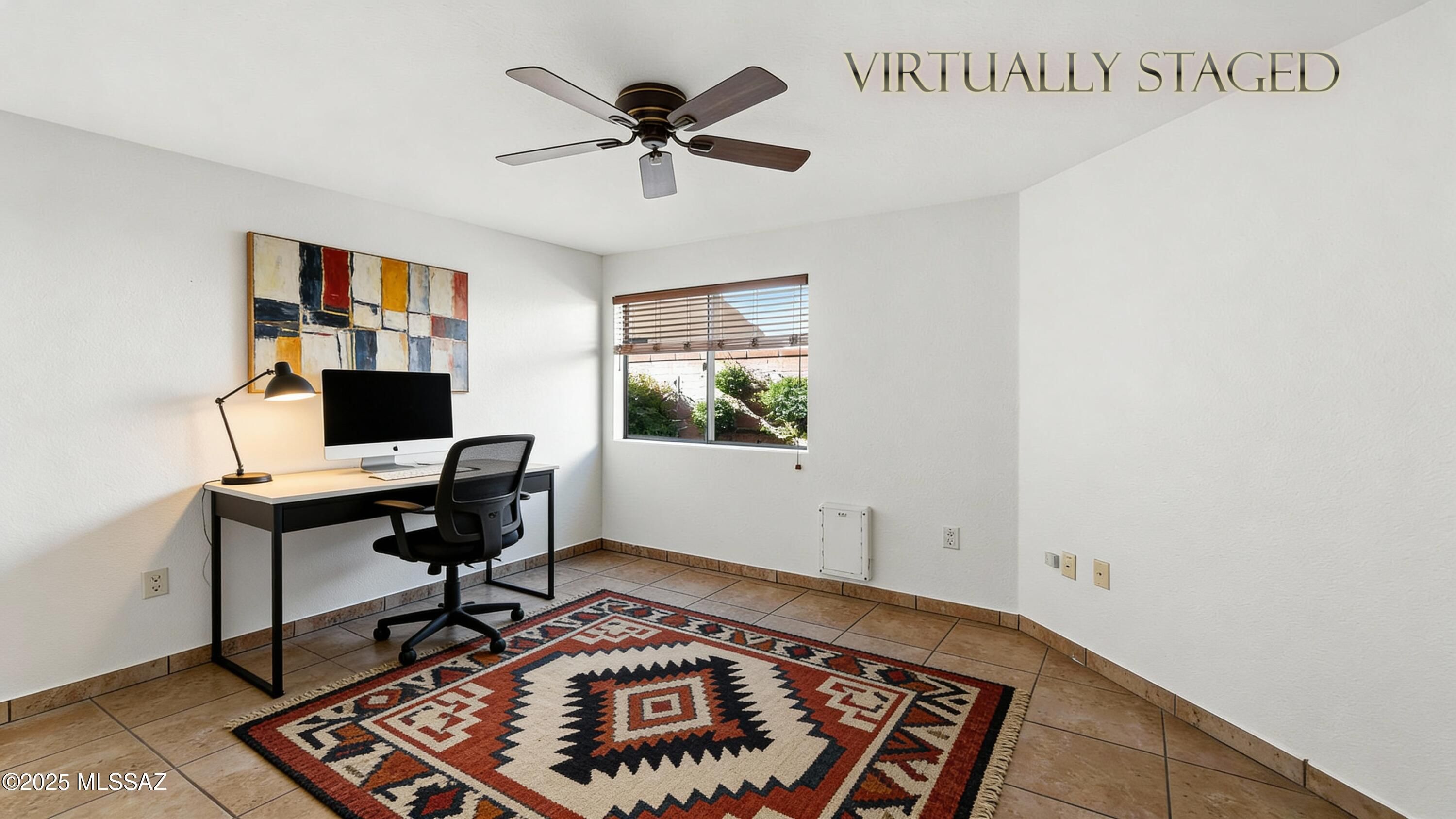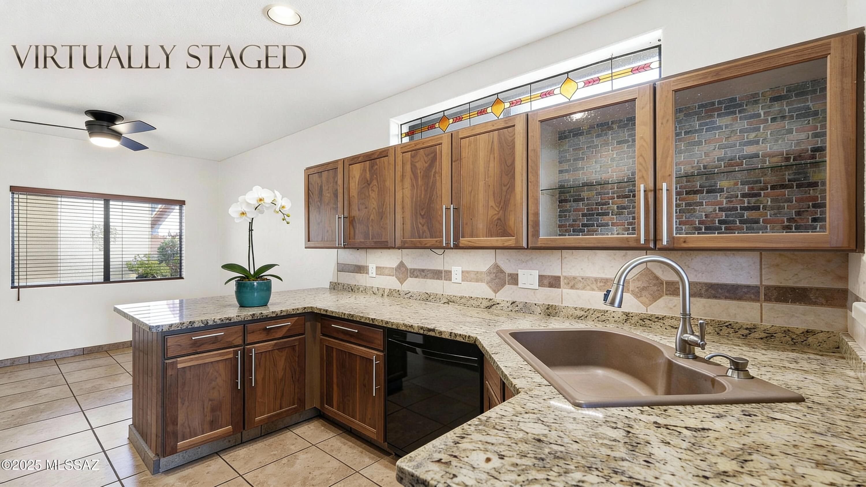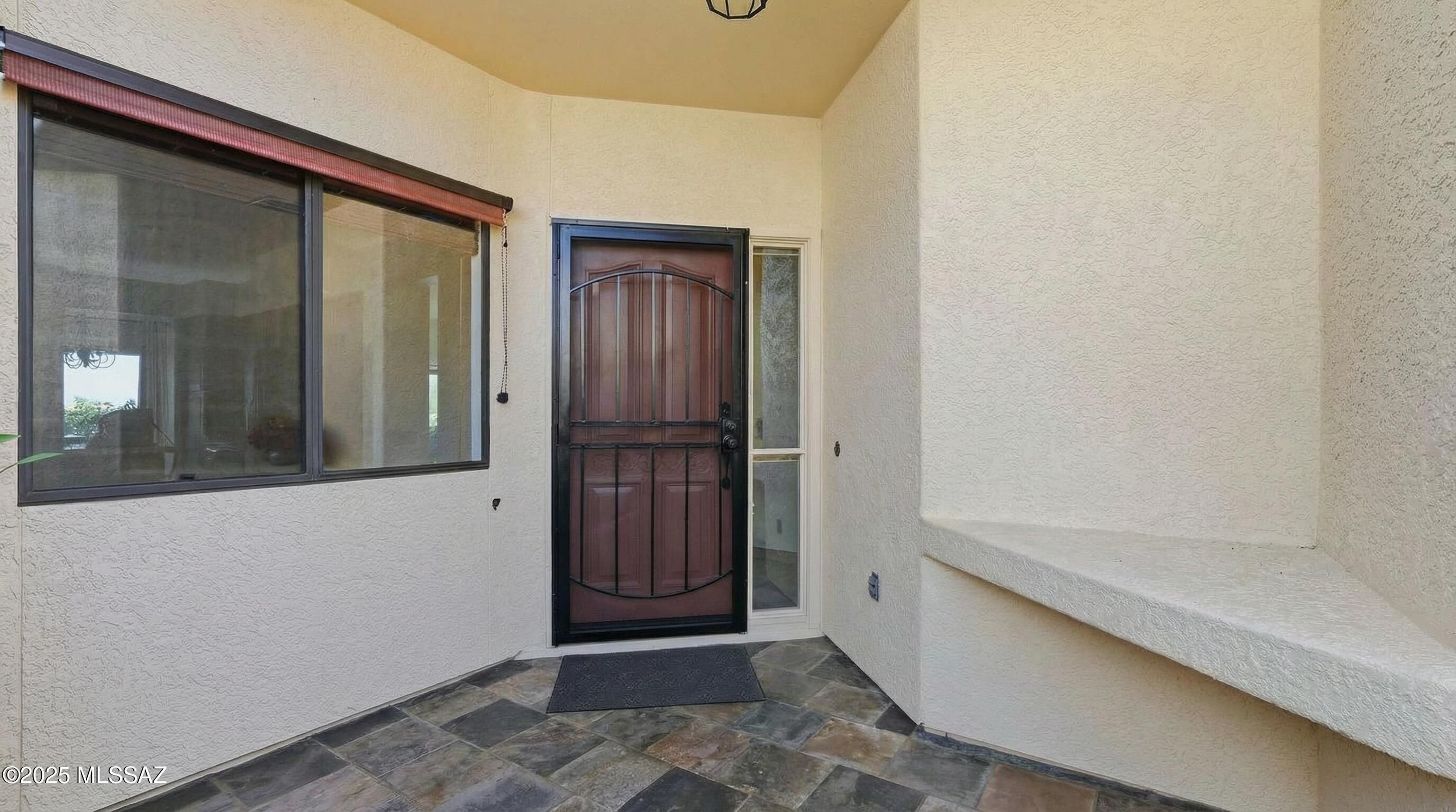 Enter through a charming front courtyard gate into the sun-filled, freshly painted 1706 sq ft home. Two Bedrooms and a den. This floor plan features 9'' ceilings, a kitchen that shines with Black finish appliances, granite countertops, hardwood cabinetry, under cabinet lighting and a breakfast nook. Formal dining area with a sneak peek of the Santa Rita mountains and you own mature pomegranate tree! Primary en suite offers a walk-in closet, double vanity, custom step in shower and water closet. Down the hallway you will find a den/office with French doors and guest bedroom with full bath just across the hall. The garage has abundant storage cabinets, work shop area, man door, utility sink to wash your golf clubs and an area to park your golf cart.