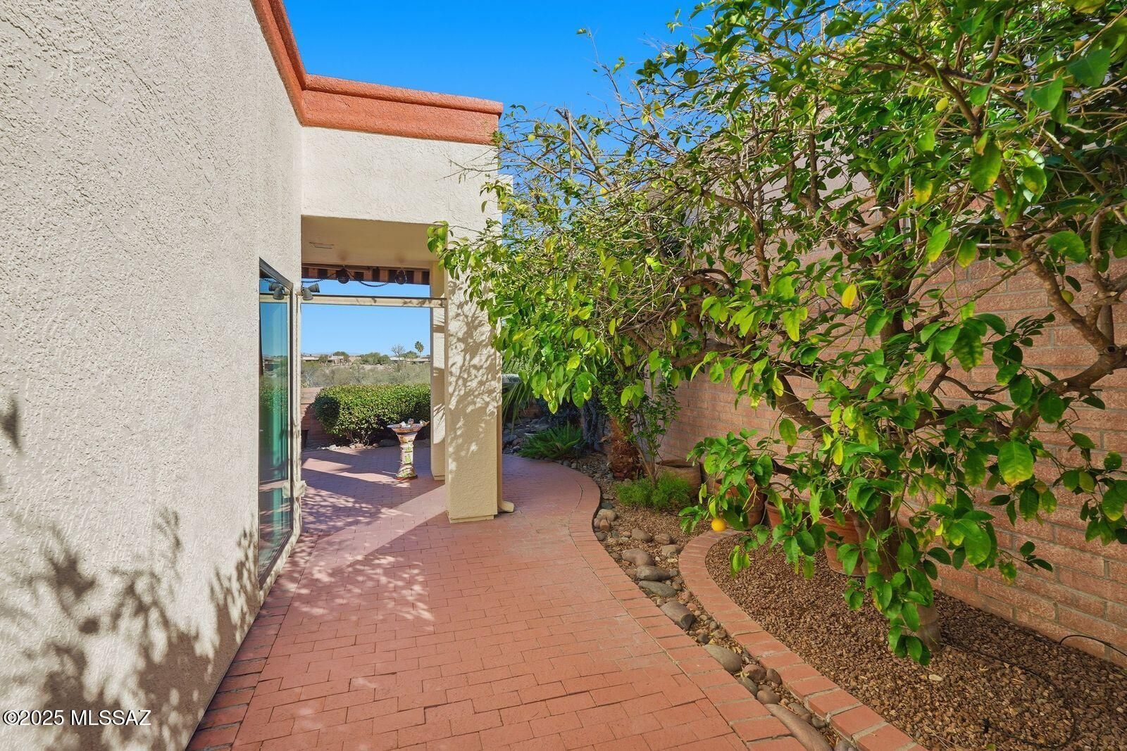 Enter through a charming front courtyard gate into the sun-filled, freshly painted 1706 sq ft home. This floor plan features 9'' ceilings, a kitchen that shines with Black finish appliances, granite countertops, hardwood cabinetry, under cabinet lighting and a breakfast nook. Formal dining area with a sneak peek of the Santa Rita mountains and you own mature pomegranate tree! Primary en suite offers a walk-in closet, double vanity, custom step in shower and water closet. Down the hallway you will find a den/office with French doors and guest bedroom with full bath just across the hall. The garage has abundant storage cabinets, work shop area, man door, utility sink to wash your golf clubs and an area to park your golf cart. And now, discover your private rear yard with electric awning,
