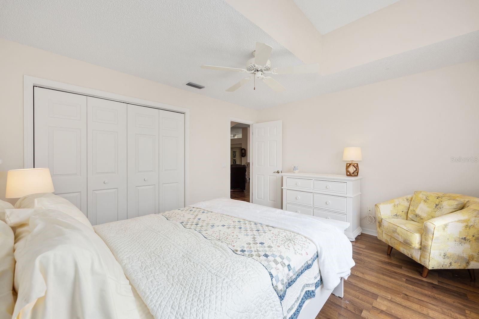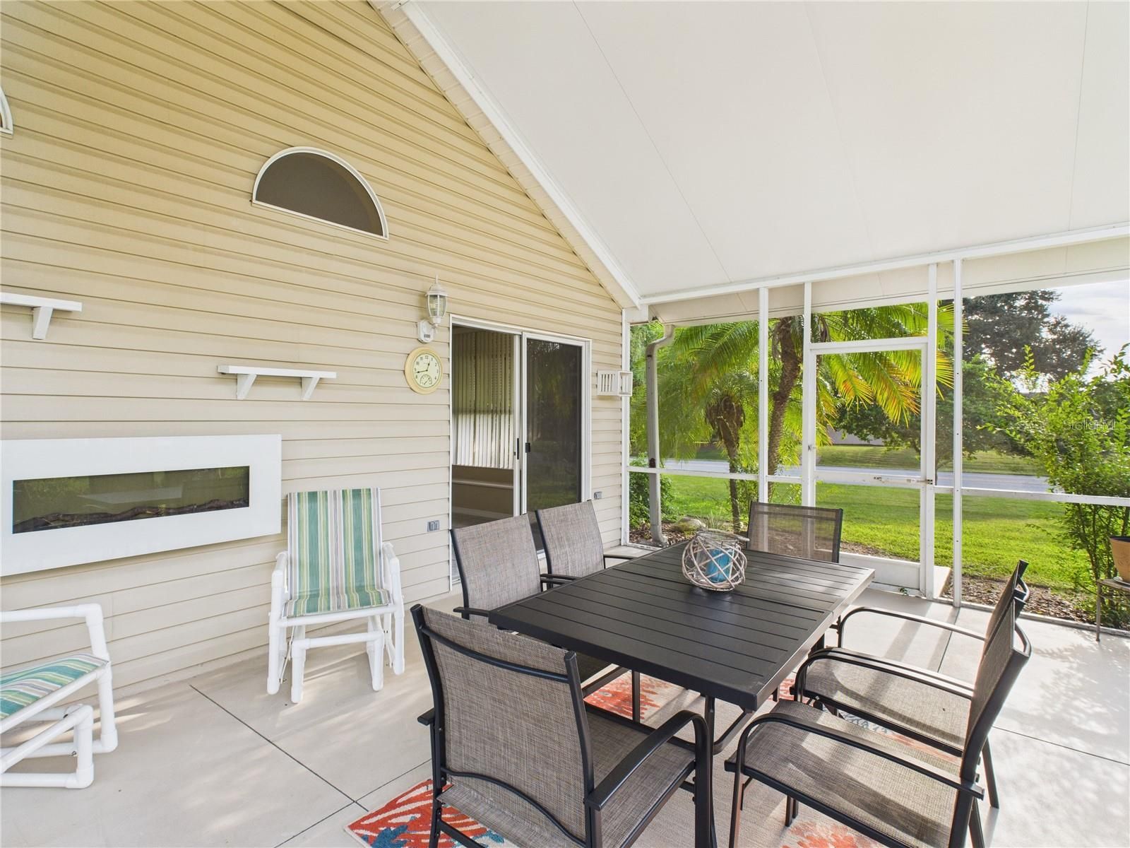 New Roof coming soon! Price Improvement for this Turn-key home. Just bring your suitcase! Furnished home and with a Golf Cart. 2 Spacious Bedrooms. Primary has a large walk-in Closet and a newer Tile Shower with Double Vanity. Large Eat-in Kitchen (new countertops coming soon) and a separate Dining Room with Table and 6 Chairs for entertaining. Beautiful Landscaping with covered screened Lanai and no neighbors in back. All cookware, dishes and linens are in place to get you started in this adventure! So much to do and see from this location by golf cart! So much at your fingertips from golfing, nightly entertainment in Spanish Springs Town Center and Lake Sumter Landing. Both with restaurants and shopping. Regional recreation centers, activity pools, family pool, multi-purpose trails for golf carts - bike - exercising, etc. Bond is Paid.