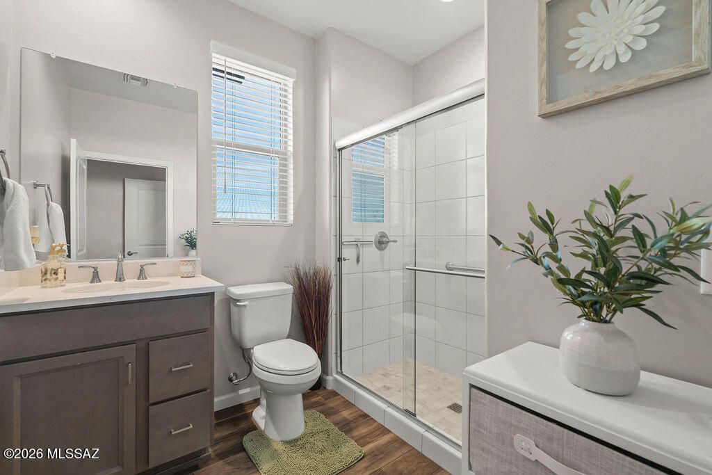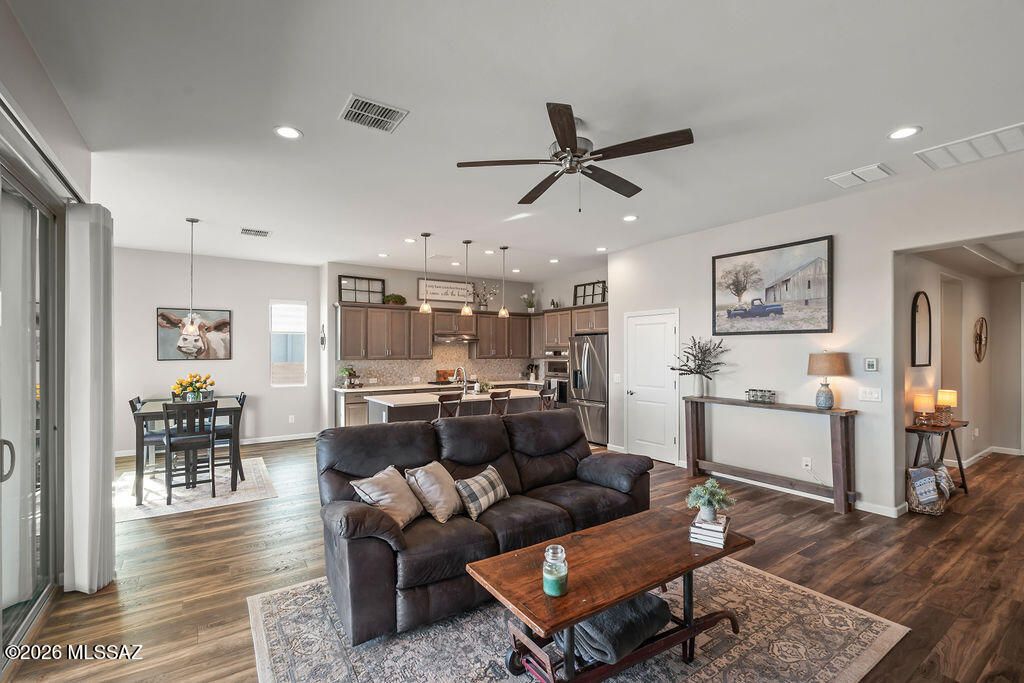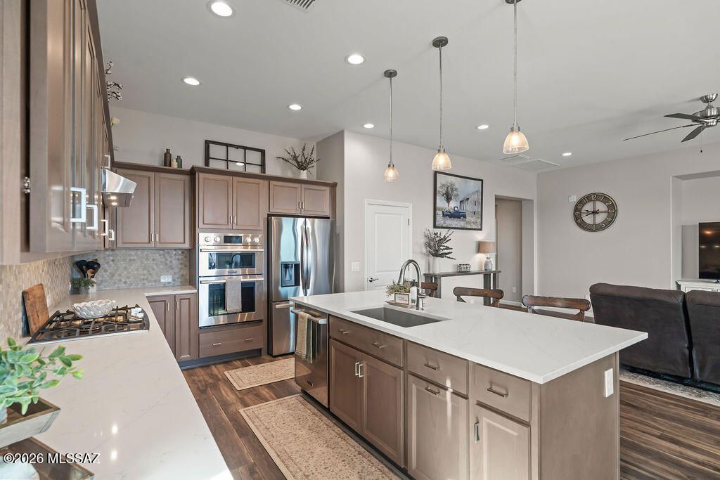 A must see in person, you will be blown away! Highly sought-after and extensively upgraded Mariposa floorplan situated on an elevated corner lot with breathtaking panoramic and mountain views. Designed for both comfort and style, this open-concept home features 10-foot ceilings, abundant natural light, and beautiful LVP flooring throughout -no carpet anywhere. Thoughtful builder extensions include a 4-foot expansion to the primary suite and garage, plus 2-foot extensions to the second bedroom and dining area, creating generous and functional living spaces. The kitchen is beautifully appointed with quartz countertops, upgraded cabinetry with soft-close features, pull-outs, and additional cabinet enhancements throughout. Quartz surfaces continue in the bathrooms for a cohesive, upscale feel.