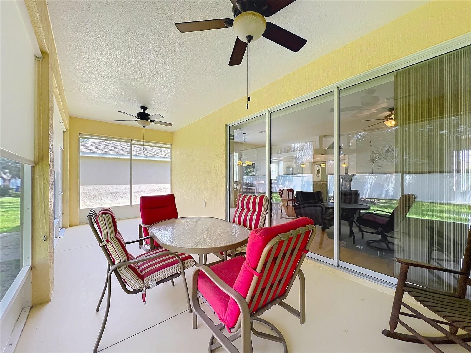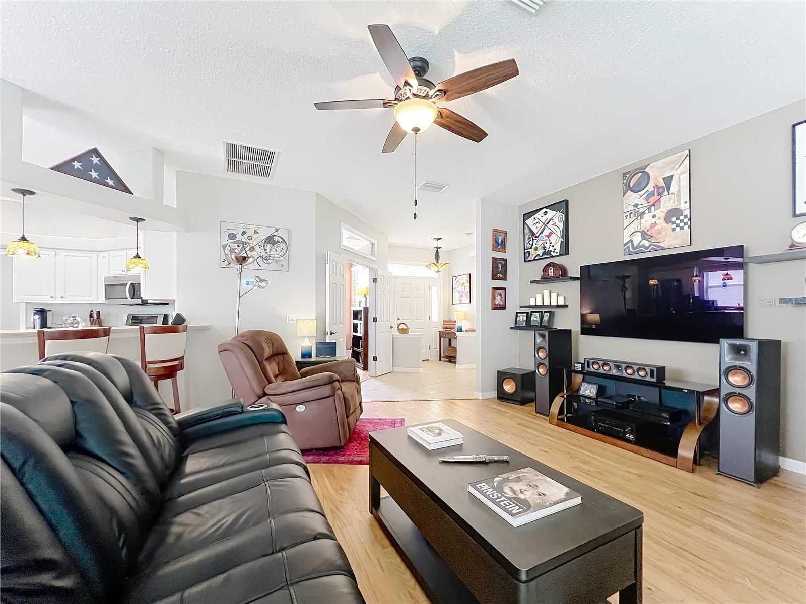 - Ceiling Fan(s), High Ceilings, Kitchen/Family Room Combo, Living/Dining Room, Open Floorplan, Thermostat, Window Treatments