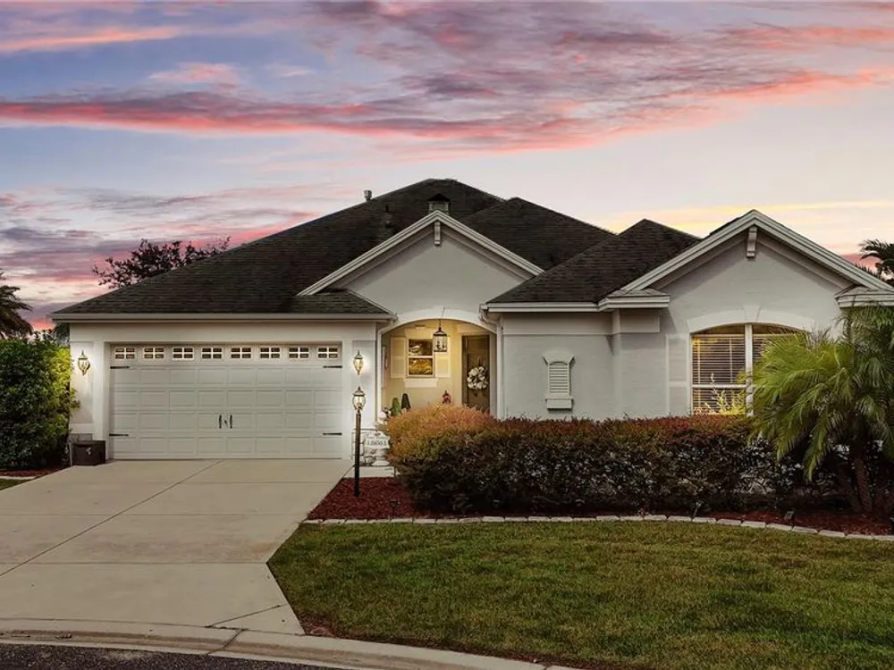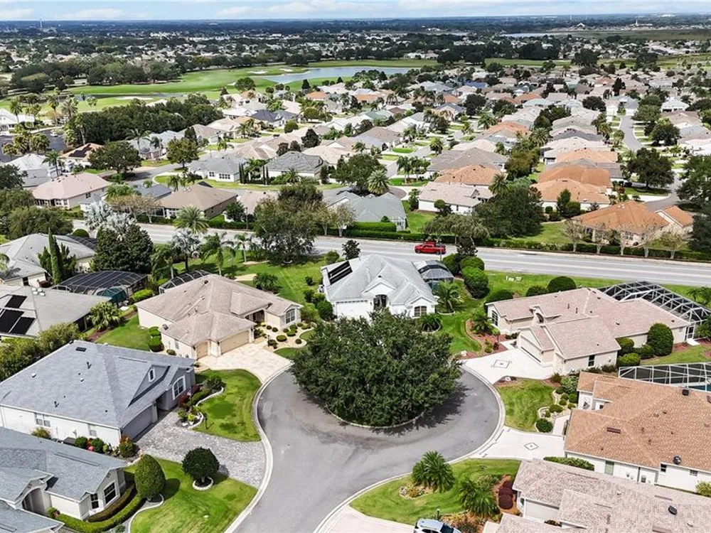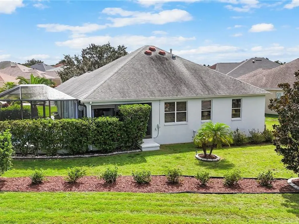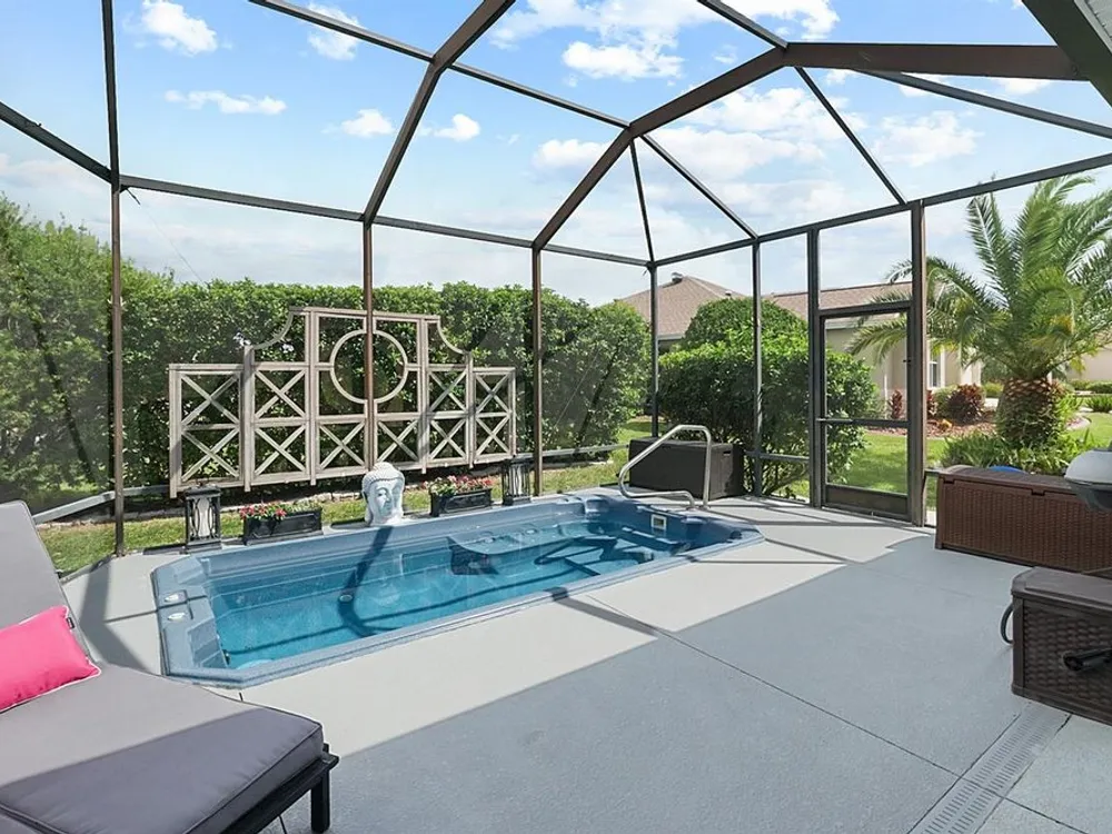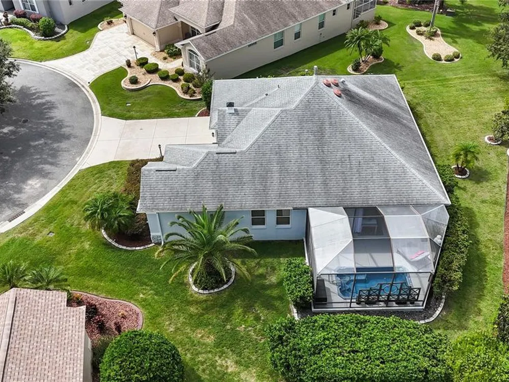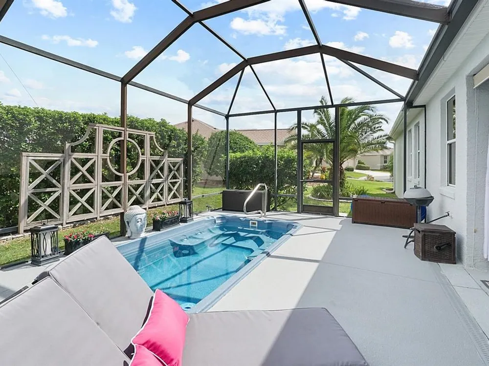 Welcome to your private retreat in the Village of Mallory. This elegant Camden Designer Home, crafted with CBS construction, is ideally positioned at the end of a quiet cul-de-sac on an expansive 10,000+ square foot pie-shaped homesite. With no homes behind and serene views backing to O’Dell Circle, the setting is unmatched for privacy and tranquility. The approach is warm and inviting, framed by lush landscaping, a two-tier stone fountain, solar lighting, and a stately Robellini palm that accents the welcoming front porch. The entryway sets the tone with an old-world glass front door and a charming wallpapered foyer that opens into refined interiors. Inside, soaring 9’4" ceilings create a sense of volume and light, while architectural arches, fresh paint, 5 1/4 inch baseboards, and wide-slat wood blinds enhance the home’s timeless sophistication. The main living areas are finished in durable tile, complemented by newly installed neutral plush carpet with upgraded padding in the bedrooms. The layout is thoughtfully designed with a split floor plan: the owner’s suite offers a grand walk-in closet and a spa-inspired bath with dual granite vanities, chandelier lighting, an oversized tile shower with built-in seating, and carefully upgraded fixtures. Guests are treated to their own private wing with two additional bedrooms and a full bath, ensuring both comfort and privacy. The chef’s kitchen is as functional as it is beautiful, featuring gleaming granite countertops, maple cabinetry with updated hardware, upgraded appliances, a pantry closet, convenient pull-out shelving, and a spacious bar counter that opens seamlessly to the dining and living areas. Designer chandeliers, recessed lighting, and upgraded Kichler ceiling fans throughout the home complete the elegant interior ambiance. A brand-new GE washer and dryer with upper cabinetry enhance the well-appointed interior laundry room, while an oversized two-car garage with pull-down attic stairs and storage space adds practicality. The true crown jewel of this home is its outdoor living space, which was featured on the cover of Villages Magazine and celebrated in an article on entertaining. A heated T&D swim spa pool, with both solar and gas options, is surrounded by an enlarged Mansard-screened lanai with cross bracing, roller shades, multiple lounging and dining areas, and outdoor TV wiring. The northeast-facing orientation captures soft morning and early afternoon sun, creating the perfect setting for gatherings. Mature oaks, magnolia trees, and specimen palms encircle the lanai, blending natural beauty with a private resort feel. Every detail reflects thoughtful updates and pride of ownership, including a new architectural shingle roof in 2014, a new HVAC system with Ecobee thermostat in 2021, tinted double-pane windows for comfort and privacy, upgraded light fixtures and chandeliers throughout, newly installed smoke detectors, and gutters encircling the home. The result is a residence that blends elegance, practicality, and the very best of Florida living. This is more than just a home—it is an entertainer’s showcase, a private sanctuary, and a statement of refined living. With its premier location, soaring ceilings, magazine-worthy outdoor spaces, and a rare blend of privacy and style, this home stands as one of the most desirable residences in The Villages.