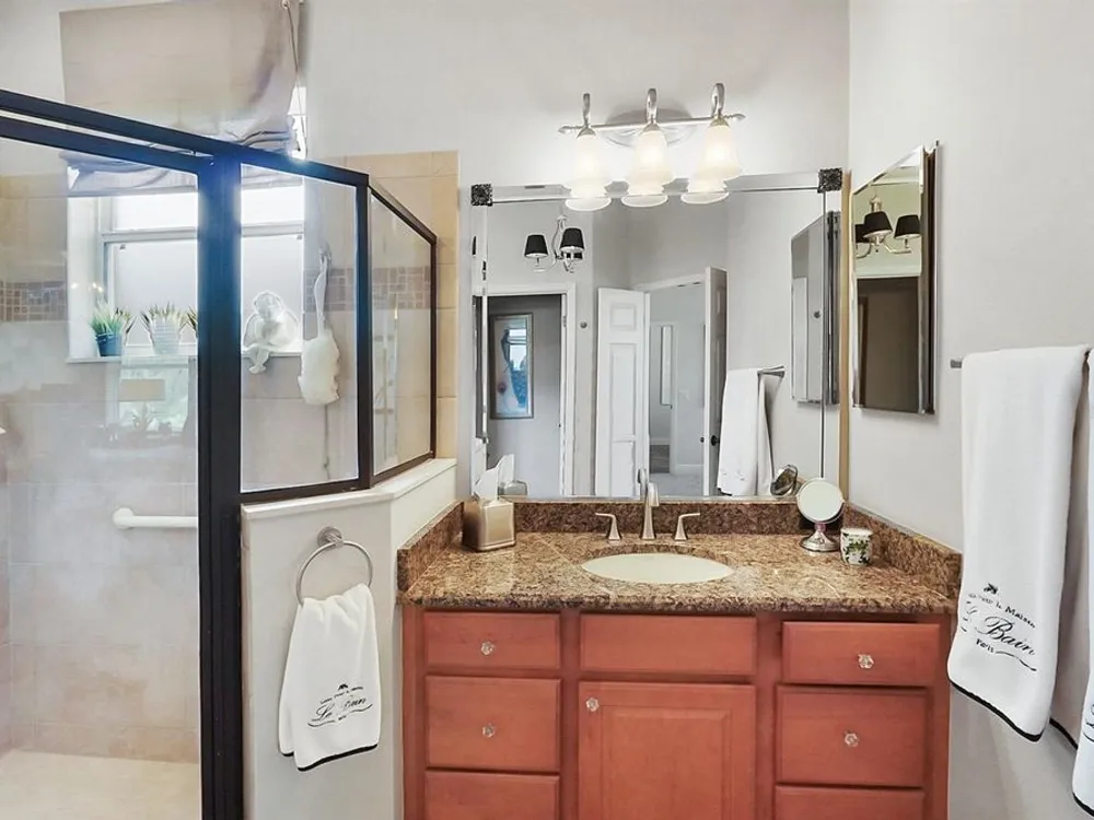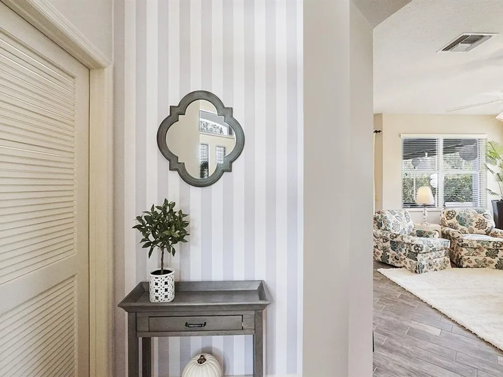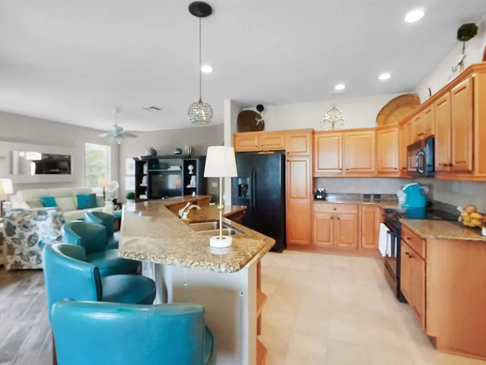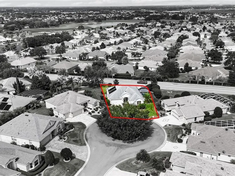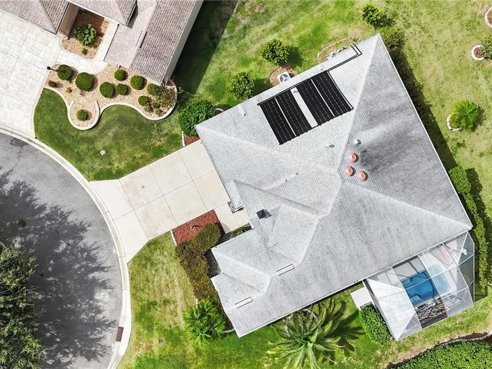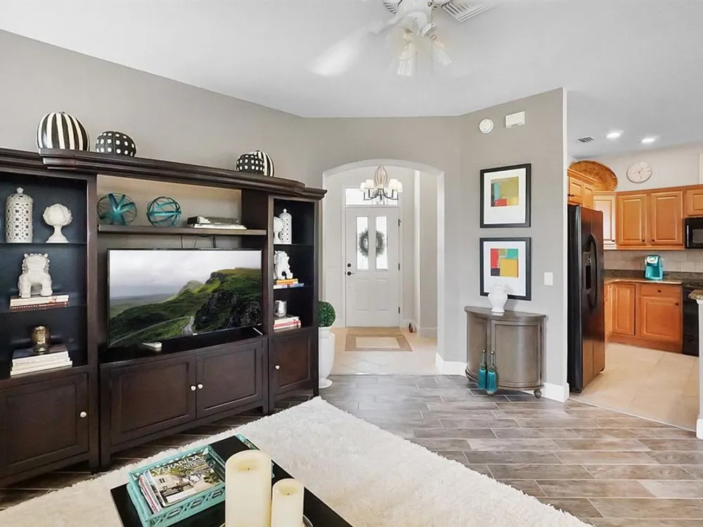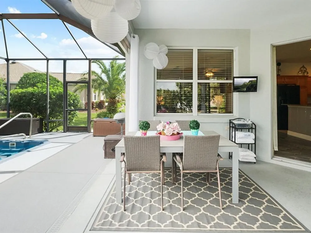 Welcome to your private retreat in the Village of Mallory. This elegant Camden Designer Home, crafted with CBS construction, is ideally positioned at the end of a quiet cul-de-sac on an expansive 10,000+ square foot pie-shaped homesite. With no homes behind and serene views backing to O’Dell Circle, the setting is unmatched for privacy and tranquility. The approach is warm and inviting, framed by lush landscaping, a two-tier stone fountain, solar lighting, and a stately Robellini palm that accents the welcoming front porch. The entryway sets the tone with an old-world glass front door and a charming wallpapered foyer that opens into refined interiors. Inside, soaring 9’4" ceilings create a sense of volume and light, while architectural arches, fresh paint, 5 1/4 inch baseboards, and wide-slat wood blinds enhance the home’s timeless sophistication. The main living areas are finished in durable tile, complemented by newly installed neutral plush carpet with upgraded padding in the bedrooms. The layout is thoughtfully designed with a split floor plan: the owner’s suite offers a grand walk-in closet and a spa-inspired bath with dual granite vanities, chandelier lighting, an oversized tile shower with built-in seating, and carefully upgraded fixtures. Guests are treated to their own private wing with two additional bedrooms and a full bath, ensuring both comfort and privacy. The chef’s kitchen is as functional as it is beautiful, featuring gleaming granite countertops, maple cabinetry with updated hardware, upgraded appliances, a pantry closet, convenient pull-out shelving, and a spacious bar counter that opens seamlessly to the dining and living areas. Designer chandeliers, recessed lighting, and upgraded Kichler ceiling fans throughout the home complete the elegant interior ambiance. A brand-new GE washer and dryer with upper cabinetry enhance the well-appointed interior laundry room, while an oversized two-car garage with pull-down attic stairs and storage space adds practicality. The true crown jewel of this home is its outdoor living space, which was featured on the cover of Villages Magazine and celebrated in an article on entertaining. A heated T&D swim spa pool, with both solar and gas options, is surrounded by an enlarged Mansard-screened lanai with cross bracing, roller shades, multiple lounging and dining areas, and outdoor TV wiring. The northeast-facing orientation captures soft morning and early afternoon sun, creating the perfect setting for gatherings. Mature oaks, magnolia trees, and specimen palms encircle the lanai, blending natural beauty with a private resort feel. Every detail reflects thoughtful updates and pride of ownership, including a new architectural shingle roof in 2014, a new HVAC system with Ecobee thermostat in 2021, tinted double-pane windows for comfort and privacy, upgraded light fixtures and chandeliers throughout, newly installed smoke detectors, and gutters encircling the home. The result is a residence that blends elegance, practicality, and the very best of Florida living. This is more than just a home—it is an entertainer’s showcase, a private sanctuary, and a statement of refined living. With its premier location, soaring ceilings, magazine-worthy outdoor spaces, and a rare blend of privacy and style, this home stands as one of the most desirable residences in The Villages.