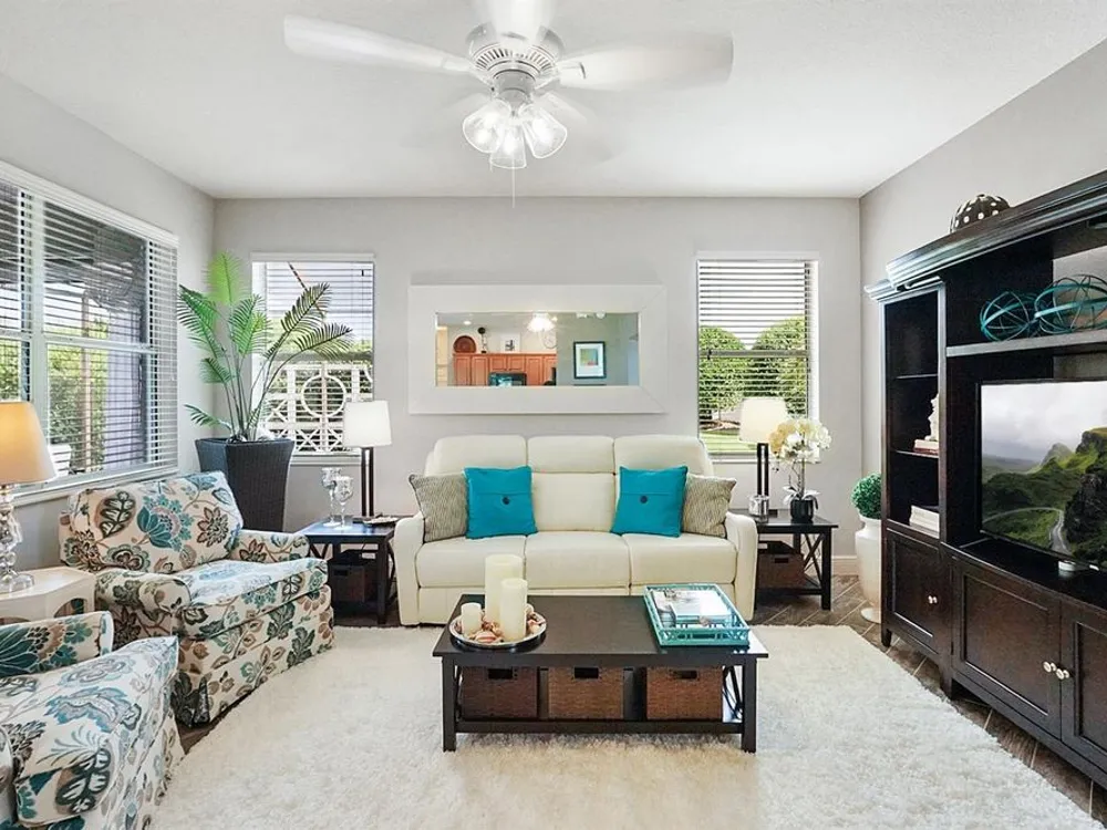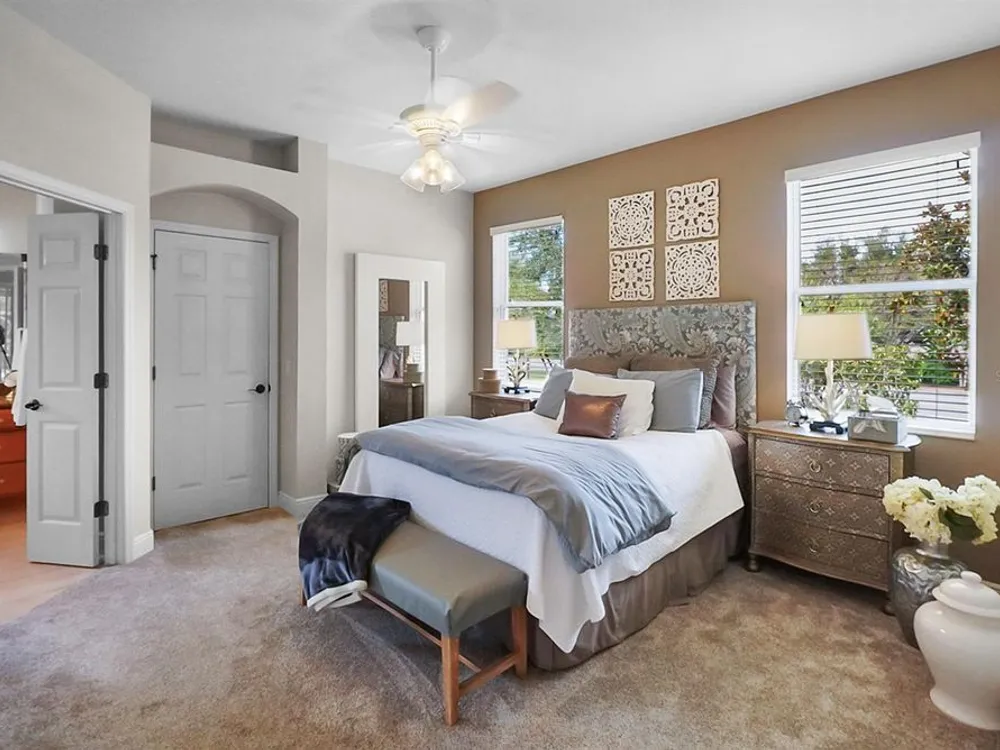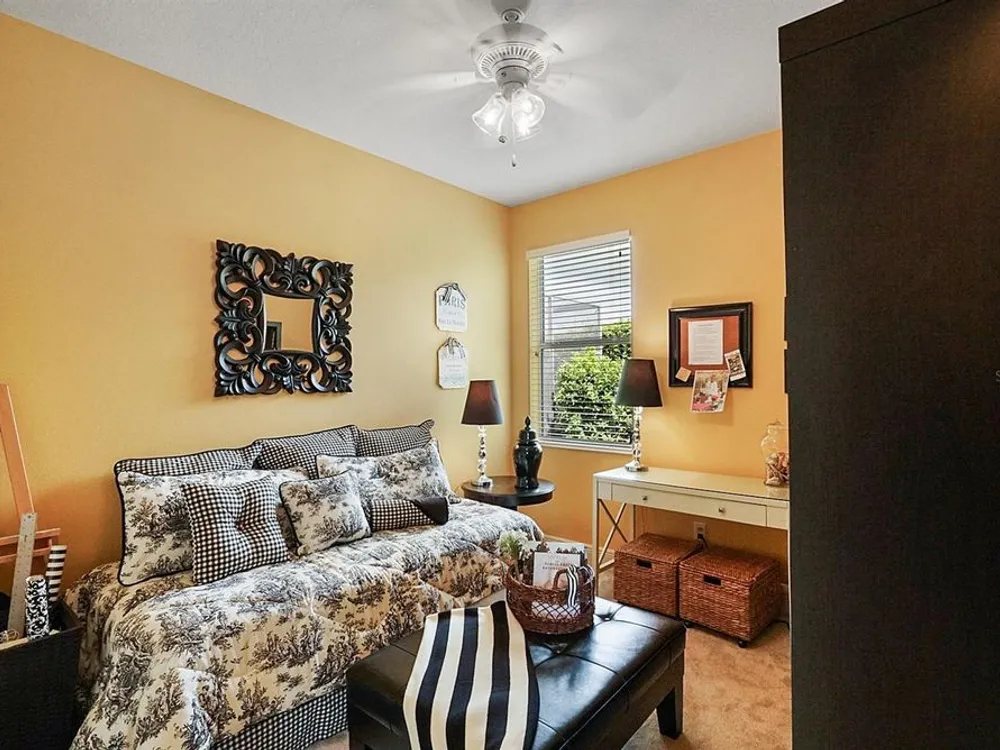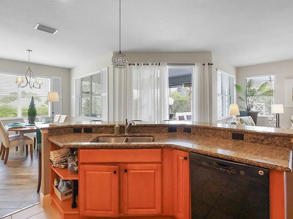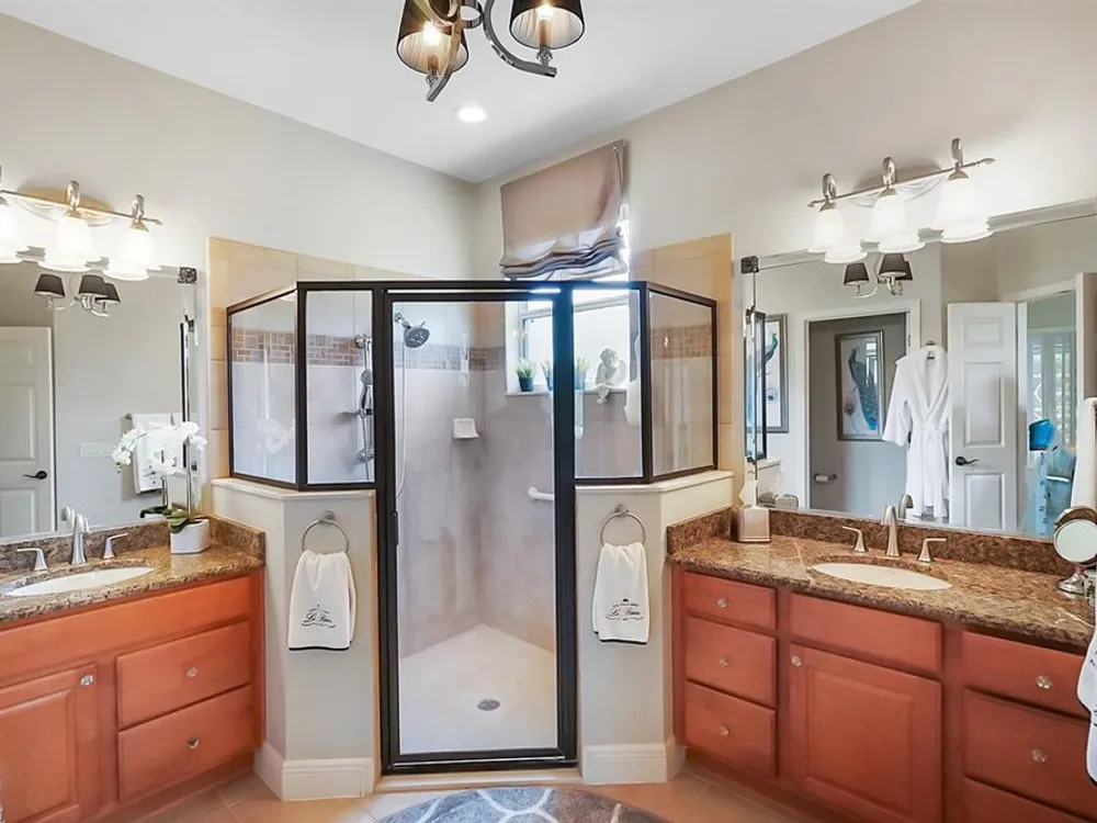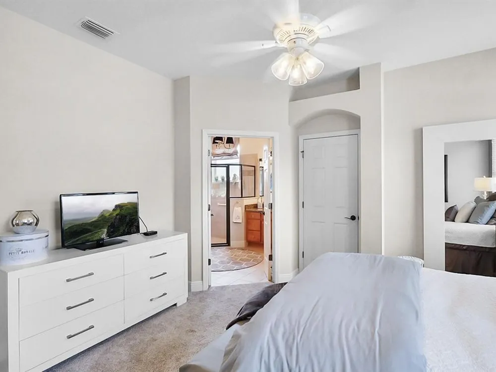 Welcome to your private retreat in the Village of Mallory. This elegant Camden Designer Home, crafted with CBS construction, is ideally positioned at the end of a quiet cul-de-sac on an expansive 10,000+ square foot pie-shaped homesite. With no homes behind and serene views backing to O’Dell Circle, the setting is unmatched for privacy and tranquility. The approach is warm and inviting, framed by lush landscaping, a two-tier stone fountain, solar lighting, and a stately Robellini palm that accents the welcoming front porch. The entryway sets the tone with an old-world glass front door and a charming wallpapered foyer that opens into refined interiors. Inside, soaring 9’4" ceilings create a sense of volume and light, while architectural arches, fresh paint, 5 1/4 inch baseboards, and wide-slat wood blinds enhance the home’s timeless sophistication. The main living areas are finished in durable tile, complemented by newly installed neutral plush carpet with upgraded padding in the bedrooms. The layout is thoughtfully designed with a split floor plan: the owner’s suite offers a grand walk-in closet and a spa-inspired bath with dual granite vanities, chandelier lighting, an oversized tile shower with built-in seating, and carefully upgraded fixtures. Guests are treated to their own private wing with two additional bedrooms and a full bath, ensuring both comfort and privacy. The chef’s kitchen is as functional as it is beautiful, featuring gleaming granite countertops, maple cabinetry with updated hardware, upgraded appliances, a pantry closet, convenient pull-out shelving, and a spacious bar counter that opens seamlessly to the dining and living areas. Designer chandeliers, recessed lighting, and upgraded Kichler ceiling fans throughout the home complete the elegant interior ambiance. A brand-new GE washer and dryer with upper cabinetry enhance the well-appointed interior laundry room, while an oversized two-car garage with pull-down attic stairs and storage space adds practicality. The true crown jewel of this home is its outdoor living space, which was featured on the cover of Villages Magazine and celebrated in an article on entertaining. A heated T&D swim spa pool, with both solar and gas options, is surrounded by an enlarged Mansard-screened lanai with cross bracing, roller shades, multiple lounging and dining areas, and outdoor TV wiring. The northeast-facing orientation captures soft morning and early afternoon sun, creating the perfect setting for gatherings. Mature oaks, magnolia trees, and specimen palms encircle the lanai, blending natural beauty with a private resort feel. Every detail reflects thoughtful updates and pride of ownership, including a new architectural shingle roof in 2014, a new HVAC system with Ecobee thermostat in 2021, tinted double-pane windows for comfort and privacy, upgraded light fixtures and chandeliers throughout, newly installed smoke detectors, and gutters encircling the home. The result is a residence that blends elegance, practicality, and the very best of Florida living. This is more than just a home—it is an entertainer’s showcase, a private sanctuary, and a statement of refined living. With its premier location, soaring ceilings, magazine-worthy outdoor spaces, and a rare blend of privacy and style, this home stands as one of the most desirable residences in The Villages.
