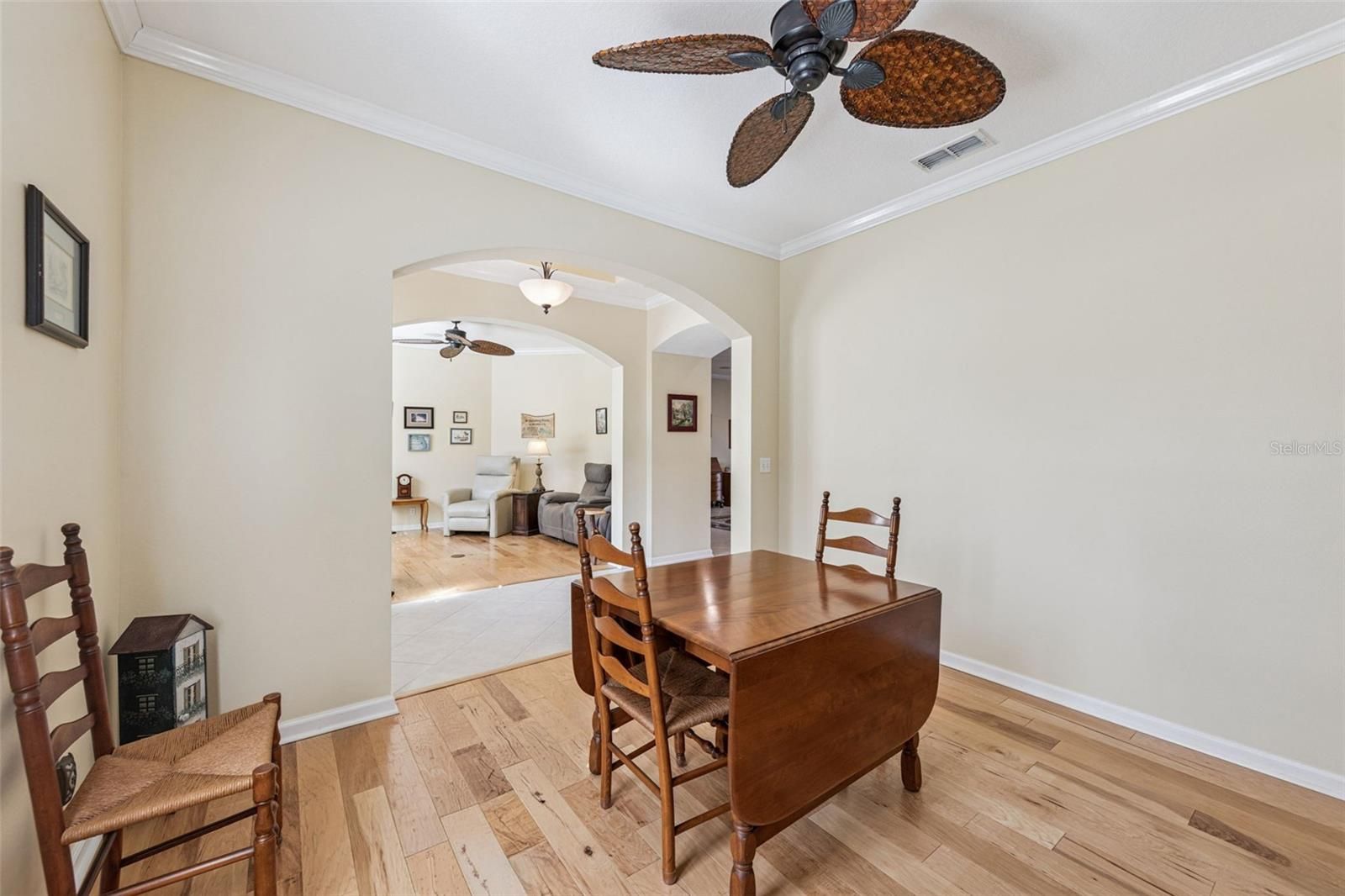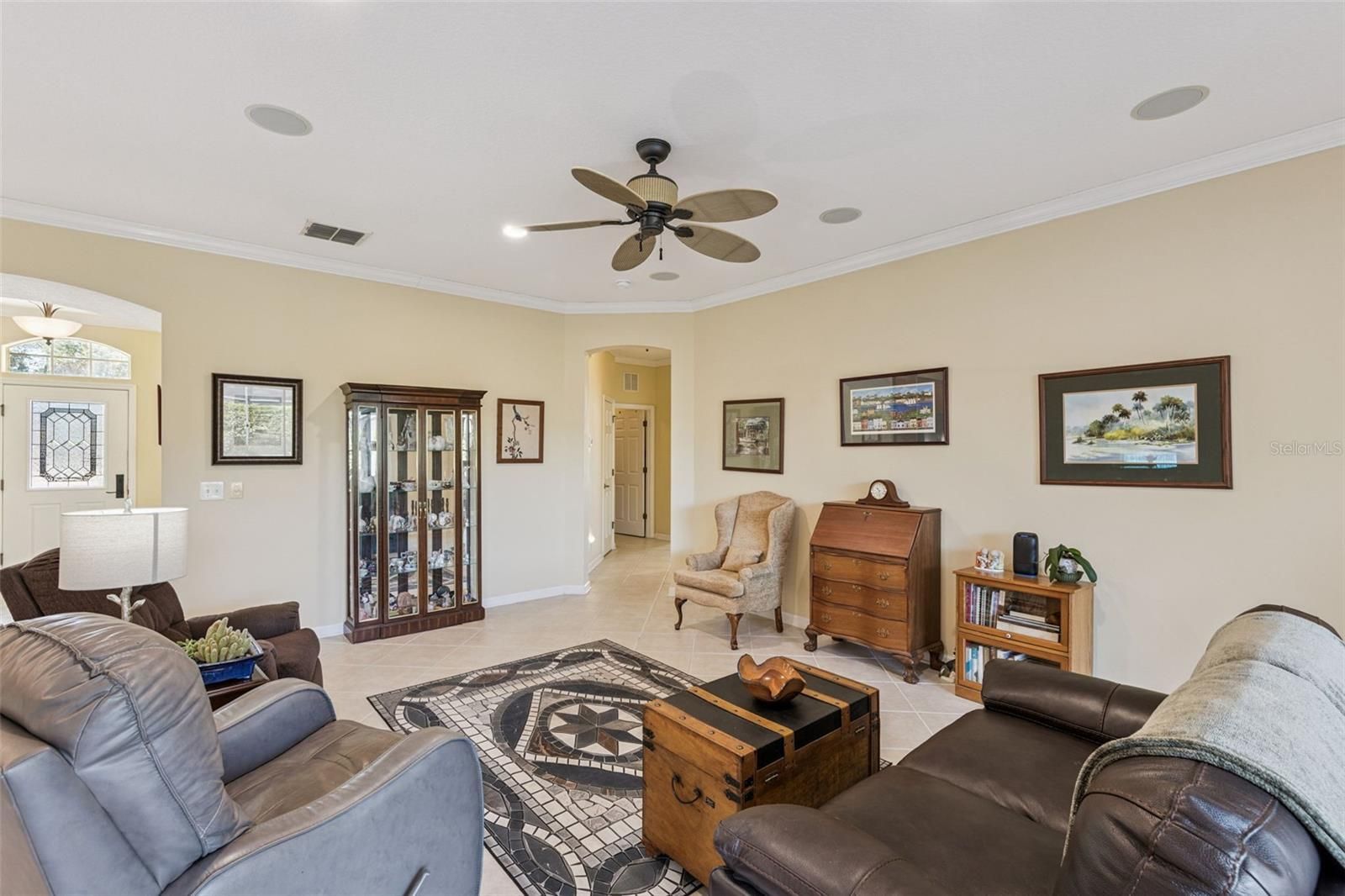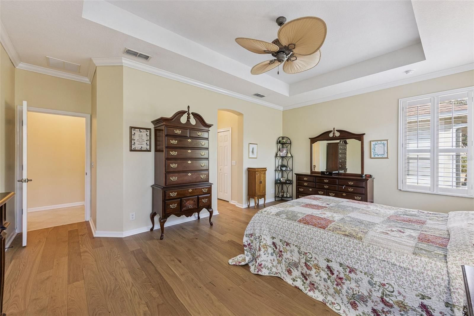 - Ceiling Fan(s), Crown Molding, Eat-in Kitchen, High Ceilings, Kitchen/Family Room Combo, Open Floorplan, Main Level Primary, Solid Surface Counters, Split Bedrooms, Stone Counters, Walk-In Closet(s)