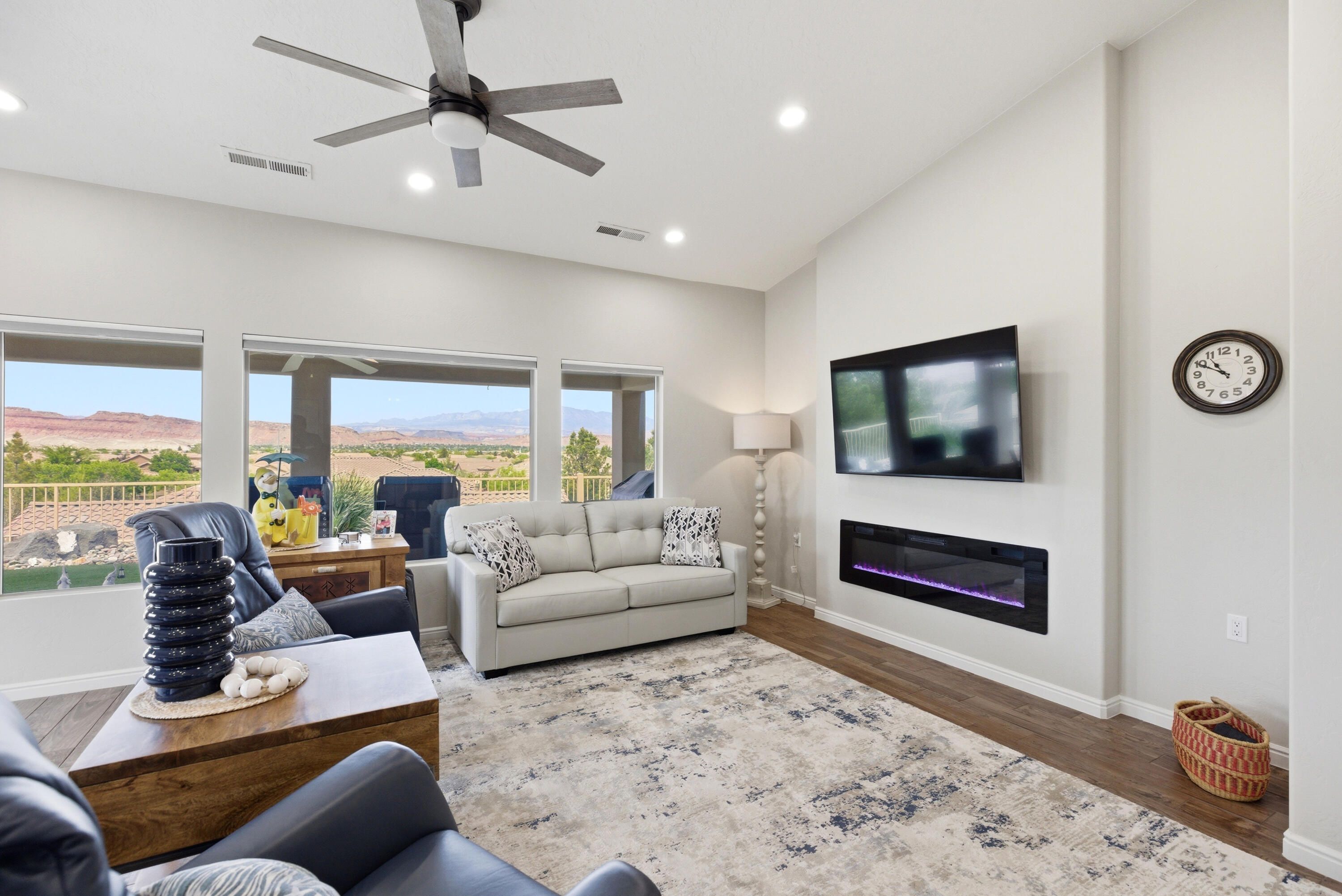 Beautiful Sun River home with exceptional Mountain, and city view's. Super clean, lightly used 2nd home. Enjoy the large covered patio and backyard putting green. The best 55+ community in southern Utah! Indoor & outdoor pools, pickleball, tennis, exercise classes, gym, and way too many amenities to list. Custom colorful electric fireplace! Come see this wonderful property immediately!