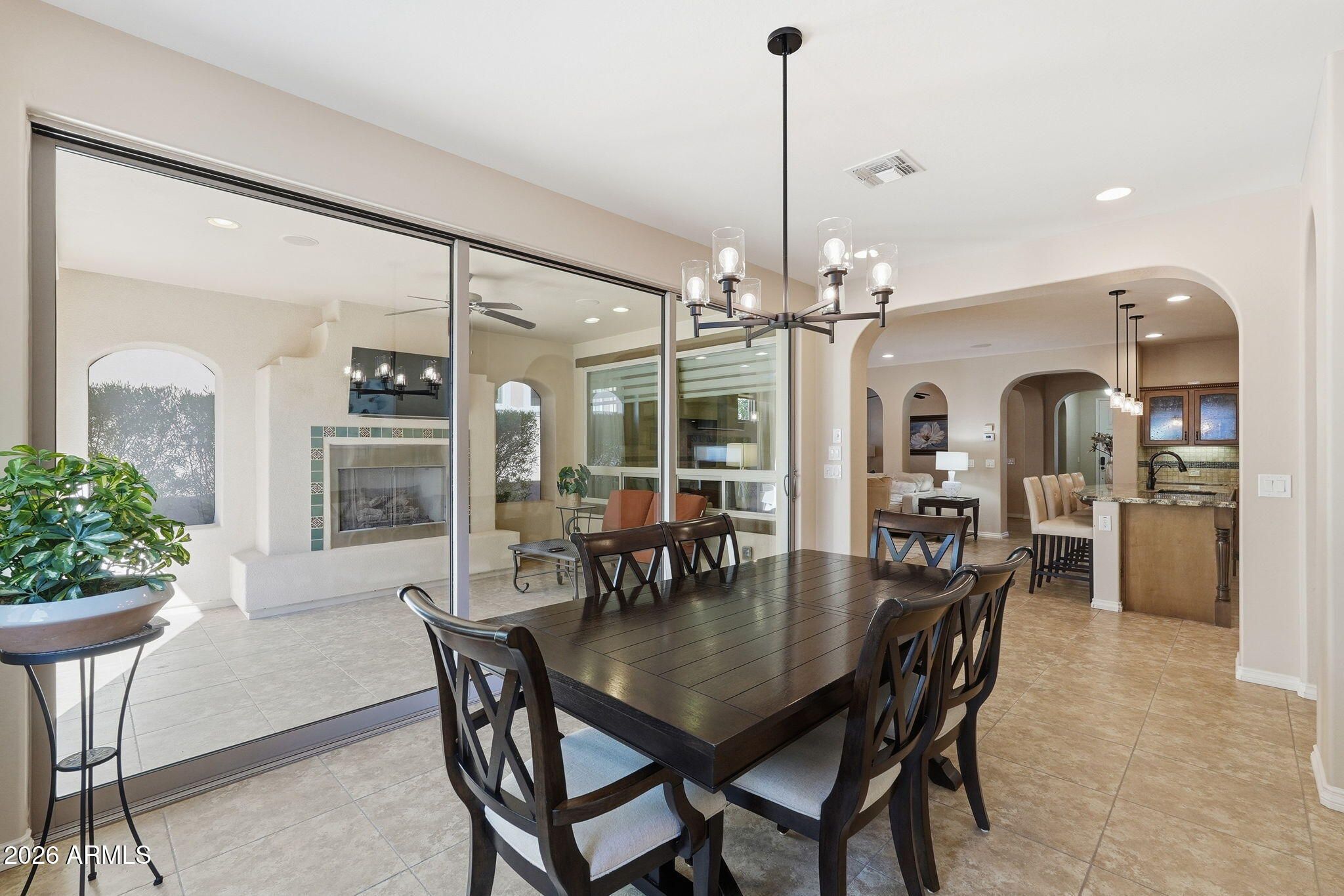 Welcome home to Encanterra! This home offers seamless indoor-outdoor living with a large rolling wall of glass that opens to a private backyard retreat. Enjoy evenings by the built-in outdoor fireplace, host gatherings around the built-in grill, and relax under the covered patio surrounded by lush, mature landscaping. Rolling sun shades provide added comfort and privacy. The gourmet kitchen is a chef's dream with stainless steel Jenn-Air appliances, upgraded cabinetry, and granite countertops, perfect for entertaining. A pre-paid solar lease helps keep energy costs low. Book your tour today!