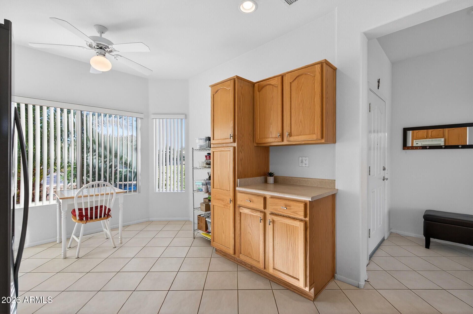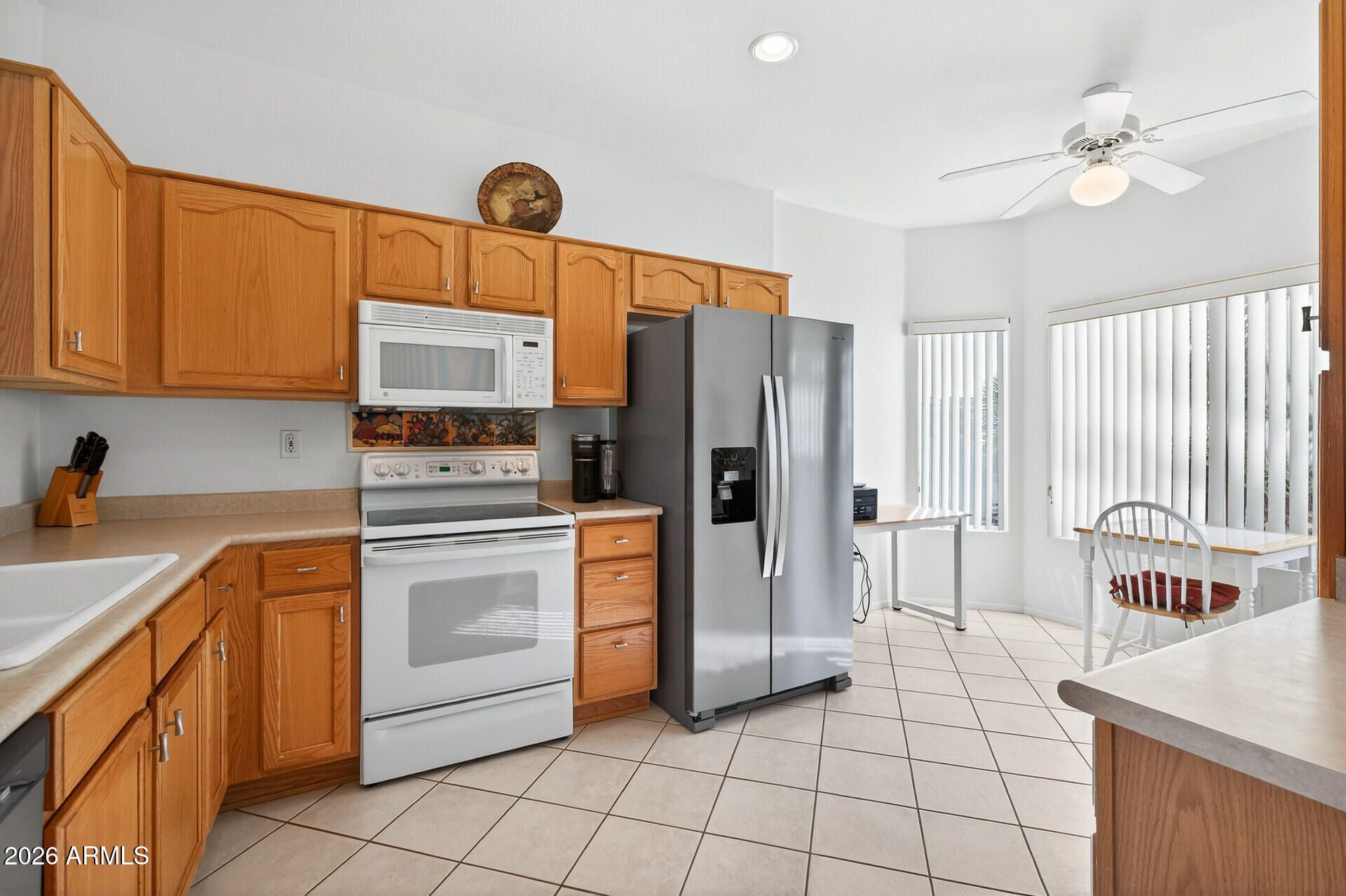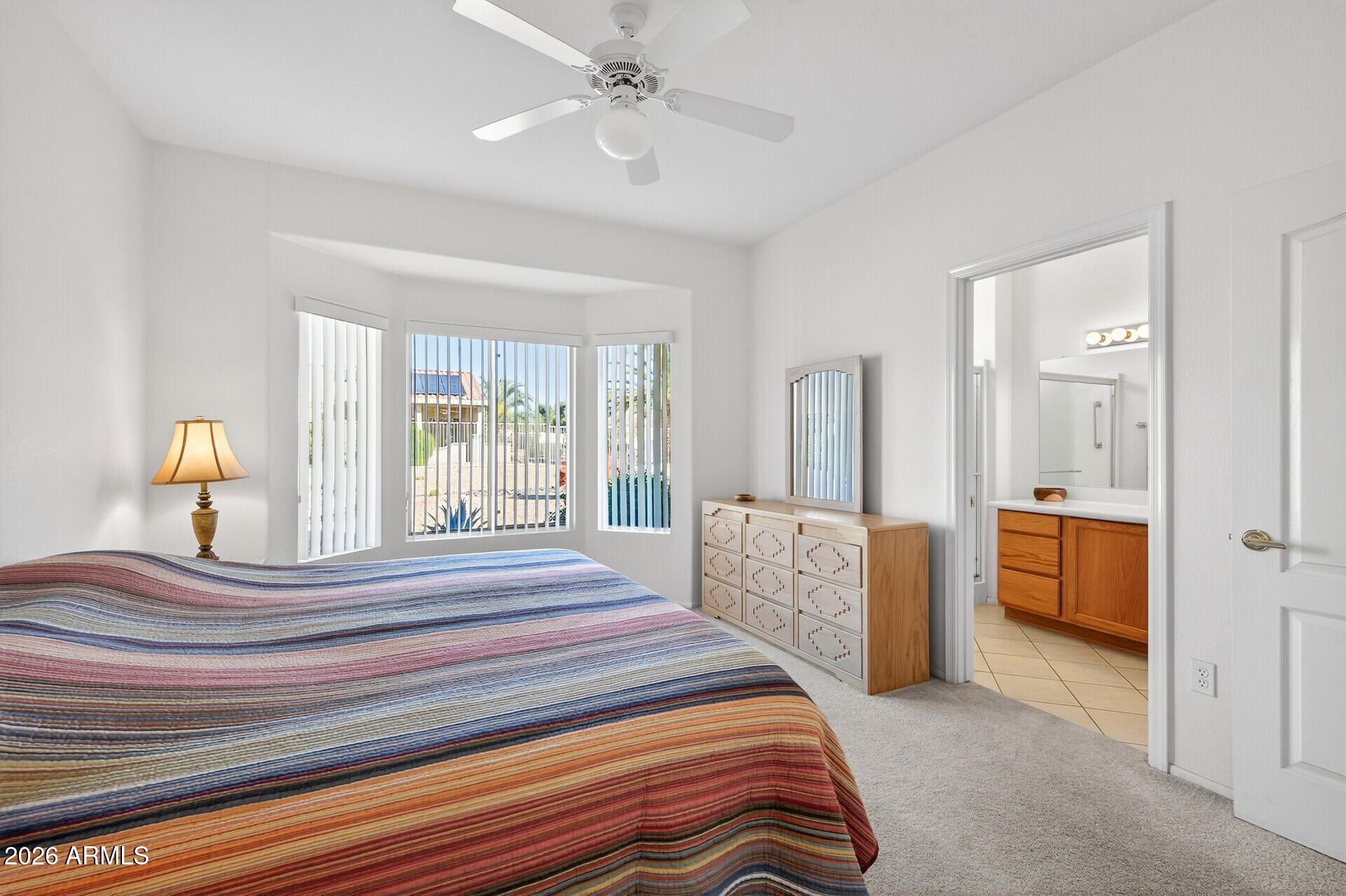 Perfect home for a winter escape or full-time living in the resort community of The Grand. Home features tile floors on the diagonal & carpeting in the bedrooms to add a cozy touch. The kitchen has a newer SS refrigerator and BRAND NEW SS dishwasher + oak cabinetry. A bay window in the breakfast nook creates the perfect place for a casual meal or your favorite beverage while soaking up the AZ sunshine. Or go out onto the extended patio w/pony wall for privacy and a gate to close it in for pets. Other upgrades include a bay window in the owner's suite, security front door, 4 ceiling fans, upgraded baths, raised panel doors & lots of garage storage. Water heater new in 2019 & HVAC NEW IN DECEMBER 2024!