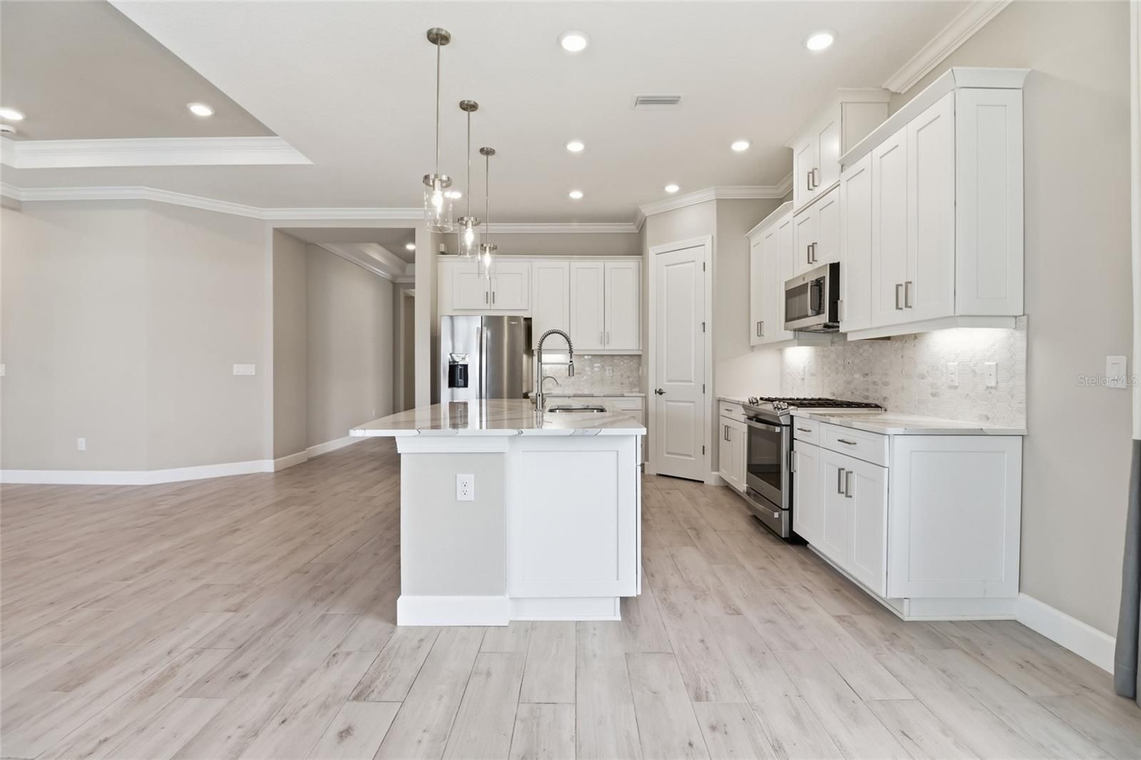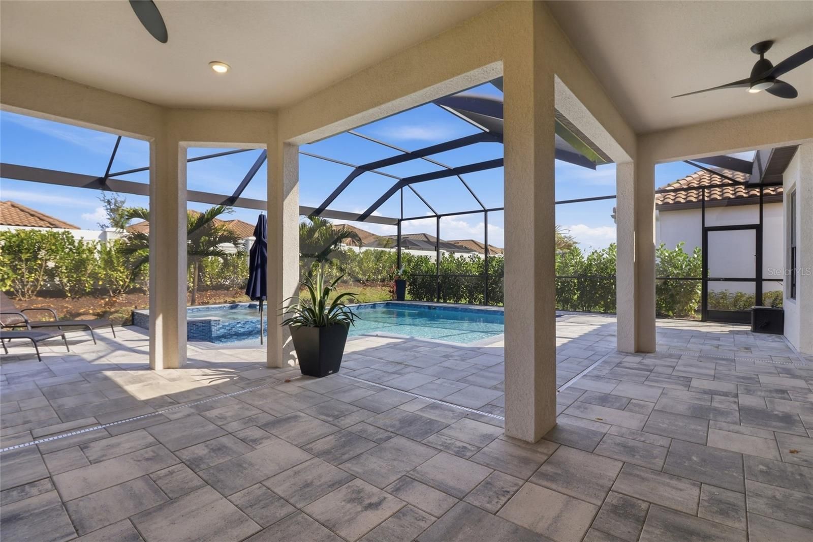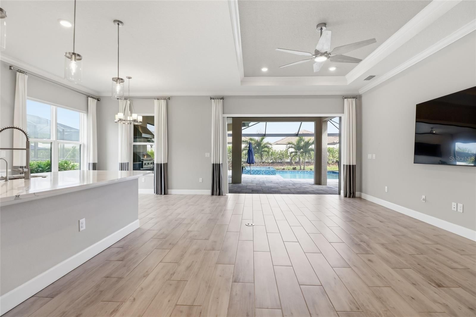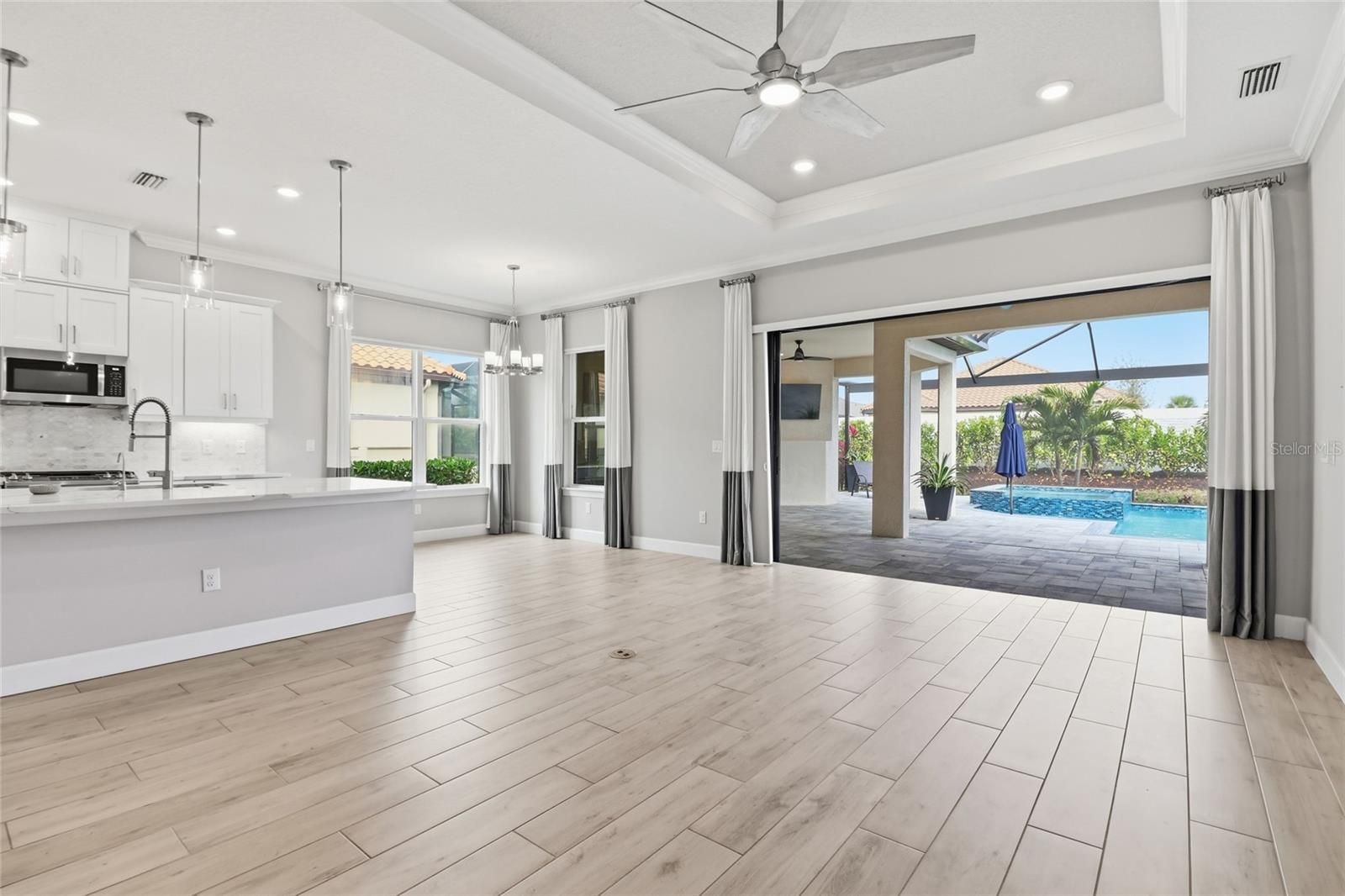Experience the ultimate in resort-style living inside the highly sought-after Esplanade at Azario in Lakewood Ranch. This beautifully designed 3-bedroom, 3.5-bath residence with a versatile den/flex space offers over 2,100 square feet of thoughtfully designed living space, along with a private outdoor retreat featuring a heated pool and spa. Built in 2023, the home showcases a bright open-concept floor plan with elegant wood-look ceramic tile flooring, tray ceilings, and expansive living areas that seamlessly connect indoor and outdoor living. The chef-inspired kitchen is the heart of the home and features luxury GE Monogram appliances, a large center island, walk-in pantry, and abundant cabinetry, making it perfect for entertaining or everyday living. Pocketing sliding glass doors open to a spacious screened lanai, creating the ideal Florida lifestyle setting. Enjoy your private pool and spa, covered seating areas, and an outdoor kitchen designed for year-round relaxation and entertaining. The primary suite offers a peaceful retreat with a spacious bedroom and spa-like bath, while the additional bedrooms provide comfort and privacy for family or guests. The flexible den is perfect for a home office, media room, or additional guest space. Additional highlights include an extended garage providing extra space for storage, golf carts, or hobbies. Residents enjoy transferable access to Azario’s incredible resort-style amenities, including: Championship golf, Resort-style pool & Bahama Bar, Barrel House Bistro & Taproom, Fitness center & wellness studios, Tennis, pickleball & bocce courts, Scenic walking trails and social events. Live every day like you’re on vacation at Esplanade at Azario. Book your private showing today!