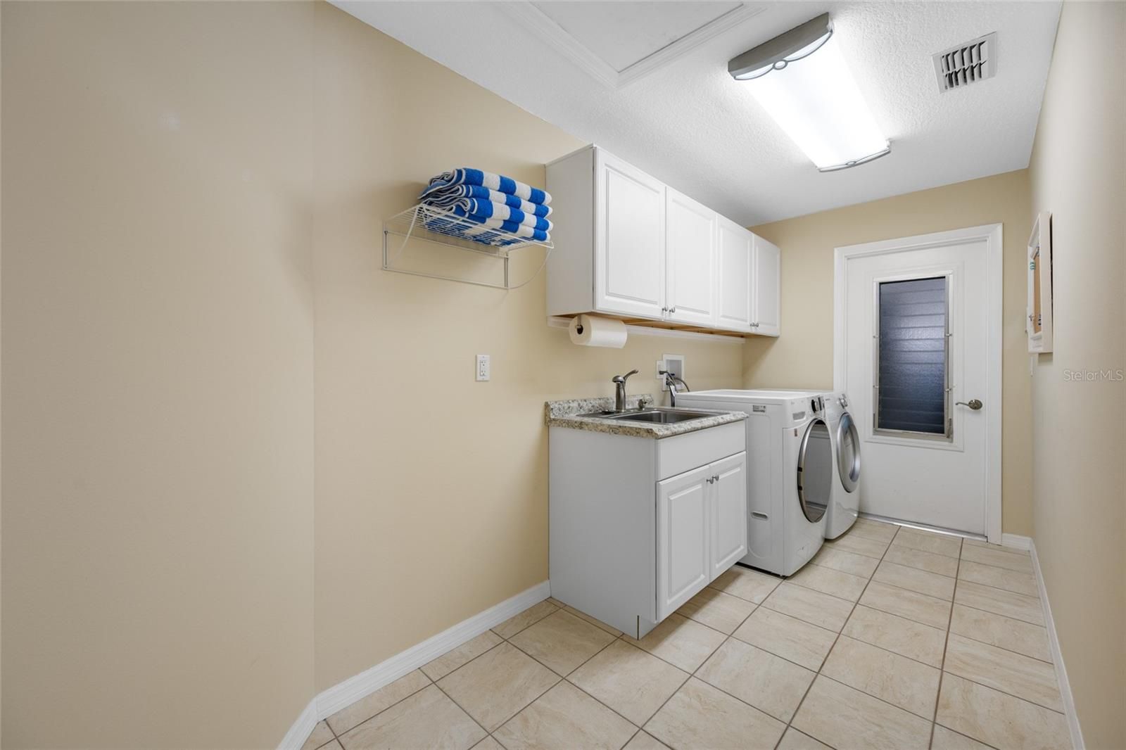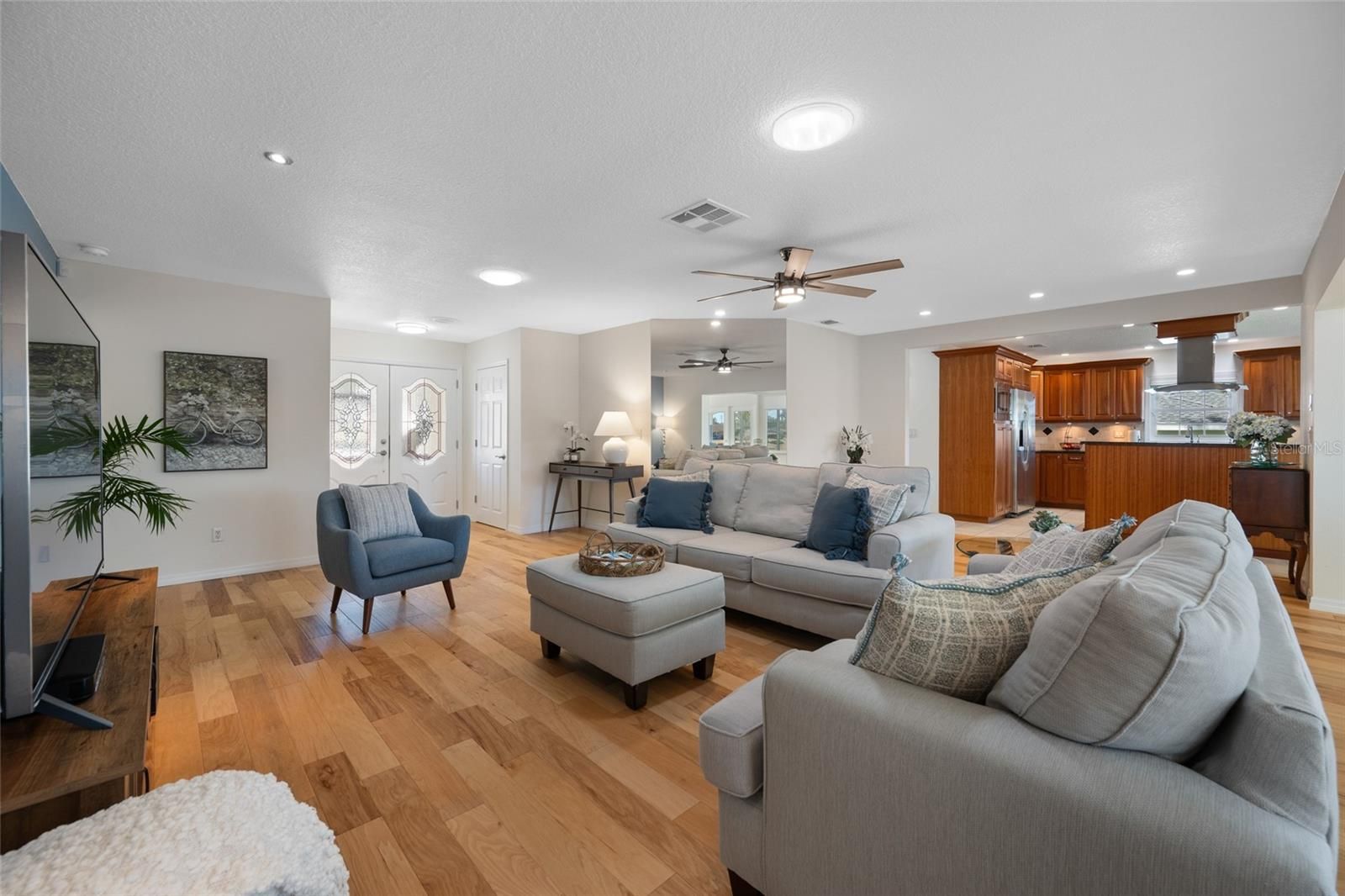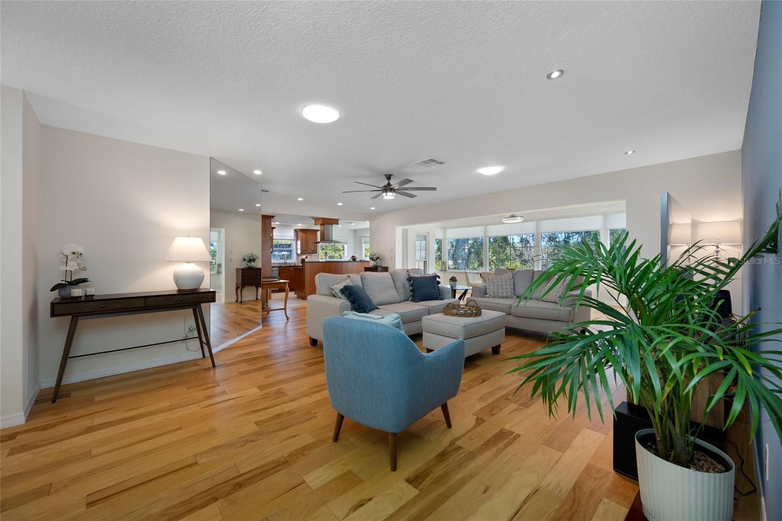Palm Harbor Golf Course Paradise, in a one-of-a-kind location with unmatched views! Wake up to the sunrise streaming through large picture windows that make this home glow. Set on a rare conservation and golf course view lot with no rear neighbors, this beautifully maintained home offers peaceful vistas from nearly every room. The home sits on a quiet street just a short walk to the clubhouse, pool, and all Highland Lakes amenities! Inside, the home feels bright and welcoming with expansive windows and an open floor plan. The updated kitchen offers abundant workspace and storage, ideal for everyday living and entertaining. Two screened porches, front and back, provide flexible outdoor spaces to enjoy wildlife, breezes, and quiet moments throughout the day. The spacious primary suite includes a custom walk-in closet, while the split layout ensures comfort and privacy for guests. A pristine garage with built-in cabinetry and a dedicated laundry room add excellent functionality. Major updates include: impact windows, 2017 roof, remodeled kitchen and baths (2017), 2023 structural inspection (clean), security system (2024), HVAC with UV purification (2015), water heater (2021), upgraded insulation (2018), garage door mechanicals (2025), water softener (2023), new washer (2023), and deep well for irrigation. High and dry, no flood insurance required! Located in the premier Highland Lakes 55+ golf community, your low HOA includes unlimited free golf on three private executive courses, heated pools, pickleball, tennis, fitness classes, and access to Lake Tarpon with pontoon boats, fishing pier, and RV/boat storage. Beaches, dining, shopping, healthcare, and airports are minutes away. Truly move-in ready — even the furnishings can be yours! Come live the Florida dream!