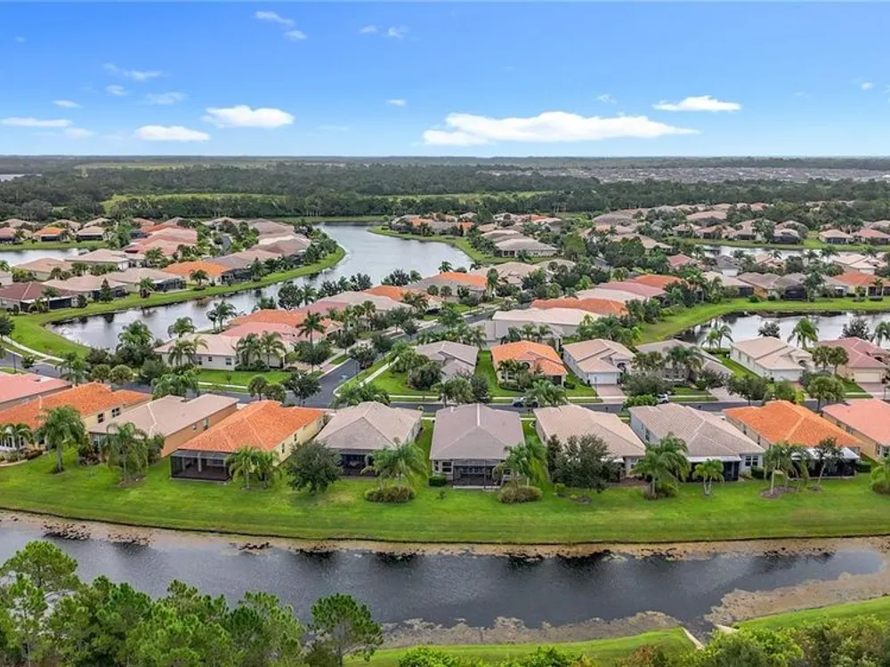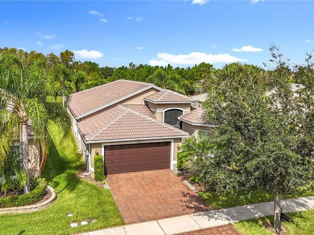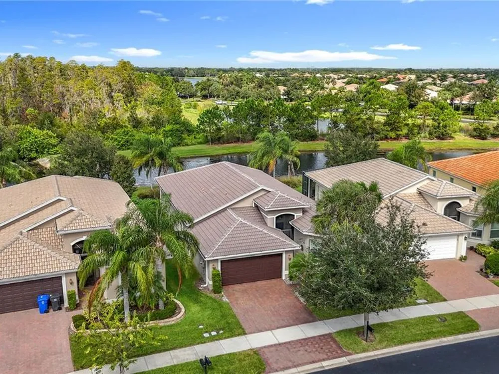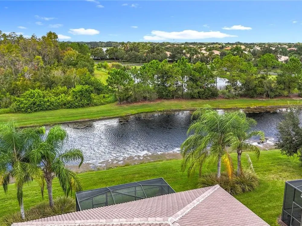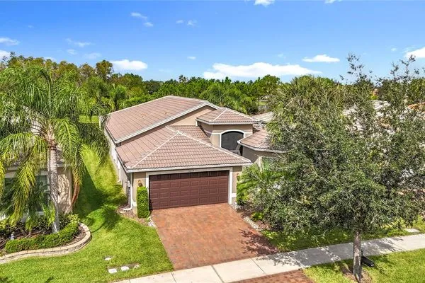 Welcome to this amazing 3 bedroom plus den, 3-bathroom Roma model single family home with many upgrades and lovely, serene water and nature preservation views! From here, there is only a short walk to all of the Valencia Lakes world class amenities catering specifically to an active adult lifestyle. The house is built on an oversized lot surrounded by colorful, tropical landscaping and white stone accent boarders contributing to an unforgettable impression of beauty and tranquility. The front entryway with screened enclosure features an 8 ft front door leading inside to a 14 ft tall spacious foyer flowing into an open floor plan – ideal for entertainment and daily living. Ceramic tiles are laid diagonally throughout the main areas. Elegant crown molding and coffered ceilings in the foyer and the primary bedroom add additional sophistication. The gourmet kitchen designed for entertaining boasts top-of-the-line quality maple cabinetry with soft closing drawers, over/under lighting and a custom-built pantry with sliding shelving. Upgraded stainless steel appliances include a stove, French type door refrigerator, dishwasher and microwave. The granite countertops with tastefully selected neutral backsplash feature a raised center island that expands to become a bar area with generous space for seating. A comfortable breakfast/dinette with a bay window facing the breathtaking water and preservation view is conveniently located just off the kitchen. A formal dining room located off the living room can comfortably accommodate large gatherings. The spacious primary bedroom offers two generously sized walk-in closets with custom built shelving and drawers. The ensuite bath has two separate vanities with granite countertops, walk-in shower with decorative listello and built-in corner bench for relaxation. The 8ft sliding glass door of the Great Room leads to a beautiful, large extended lanai. Additional upgrades include water softener system, garage pro-wet/dry wall-mount vacuum, accordion hurricane shutters and gutters around the entire structure of the house. Valencia Lakes is a 55 and better active adult golf cart community with 40-acre waterfront outdoor recreation area with resort-style heated pool, lap and resistance pool, 40,000 sq. ft. clubhouse, deluxe Bistro is to come soon, har-tru tennis courts, gym, half-court basketball, pickleball and bocce courts, dog park, baseball park, community garden, hundreds of clubs and activities, RV/boat storage area. Over 100 acres set aside as nature preserves; enjoy the quiet and solitude of peaceful views, birds & wildlife by the water. Great sense of community with great friendly neighbors. Please call for a private showing and experience this wonderful community for yourself. Tampa, St. Pete and Sarasota 30-45 minutes away. Close to the airport, medical facilities, shopping and golf.