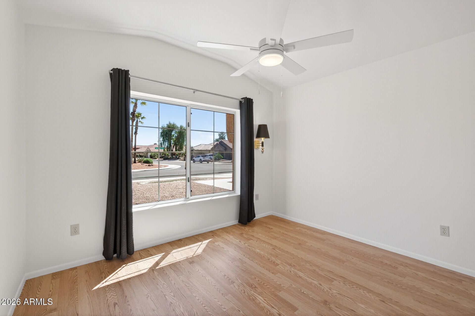 Super clean and meticulously maintained Rio Verde split floor plan, gently lived in by seasonal owners. Fresh interior and exterior paint, along with updated light fixtures and ceiling fans throughout, give the home a crisp, modern feel. Open and bright with 9-foot ceilings and abundant windows, the home features laminate and tile flooring throughout -- no carpet. The primary suite includes a bay window, dual-sink vanity, walk-in shower, and spacious walk-in closet. The guest bedroom and bath are thoughtfully located on the opposite side of the home for added privacy; the guest bath offers a tub/shower combination. The kitchen opens to the breakfast area and living room and includes generous cabinetry, a pantry, and newer white appliances and a gas stub behind the electric range. A separate office or hobby room sits just off the garage entry. The finished garage is equipped with storage cabinets, epoxy flooring, utility sink, and Samsung front-load washer and dryer. Enjoy the covered back patio overlooking a pool-sized yard with mature citrus trees -- perfect for taking in Arizona sunsets. Excellent location with low property taxes, no HOA fees, and convenient access to the amenities of Sun City West and The Grand golf courses.