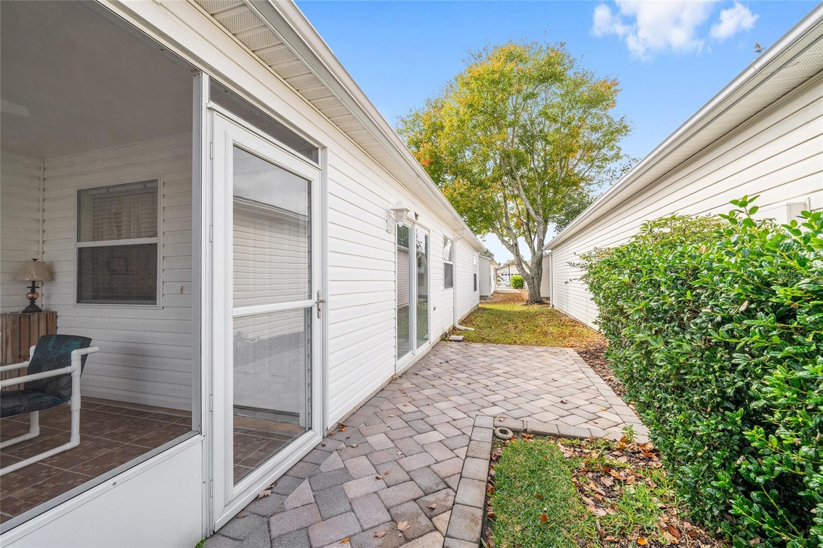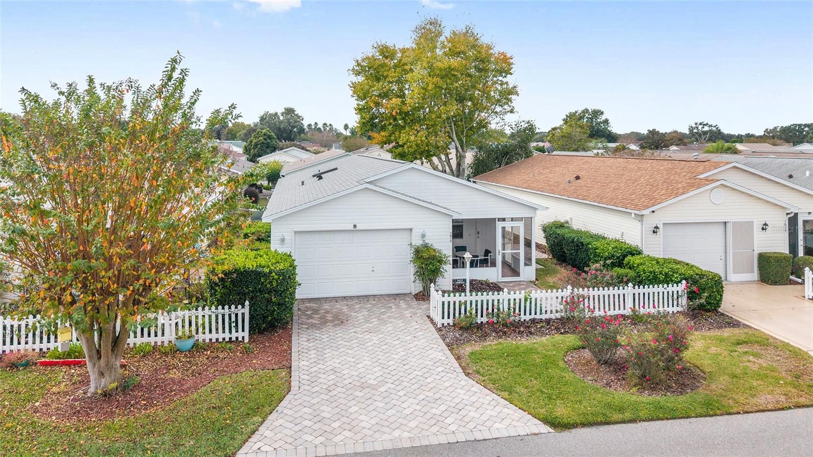 Beautiful, TURNKEY, move-in ready, 2 bedroom 2 bath patio villa home in the gated Village of Alhambra! Bond PAID. ROOF 2020. HVAC 2014. Newer water heater, newer kitchen cabinets. Very well maintained, 1 owner. Primary bedroom features private ensuite bath and walk in closet. Enjoy your morning coffee in the enclosed lanai or the outdoor patio. Both the outdoor patio and driveway are upgraded with brick pavers. Eat in kitchen has skylight and closet pantry. Home equipped with gutters and irrigation system. Also has 2 citrus trees in yard - grapefruit and tangerine. Excellent location - close to dining, medical, shopping, recreation - approx 1 mile to the Savannah Center, approx 2 miles to Spanish Springs Town Square, approx 4 miles to Lake Sumter Landing! Don't miss out on this exceptional value - perfect as a year round residence or seasonal retreat!! (China set in dining room not included.)
