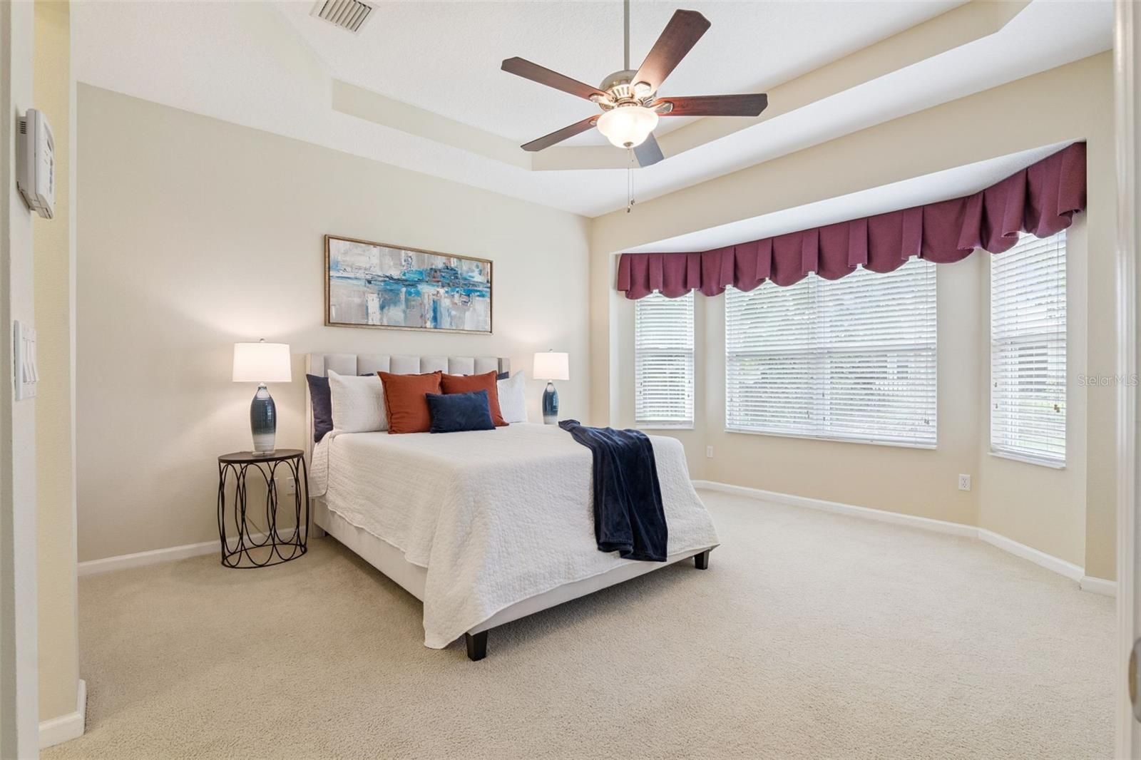 - Built-in Features, Ceiling Fan(s), Central Vacuum, Open Floorplan, Main Level Primary, Solid-Wood Cabinets, Split Bedrooms, Stone Counters, Thermostat, Tray Ceiling(s), Walk-In Closet(s), Window Treatments