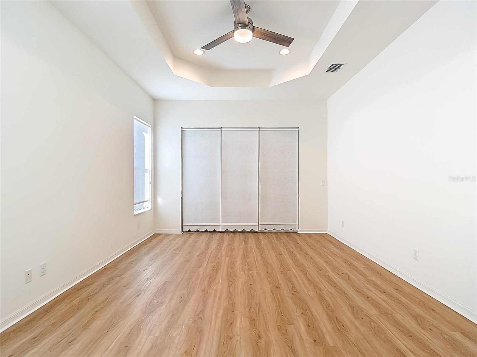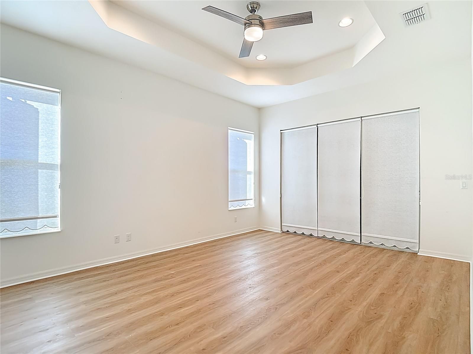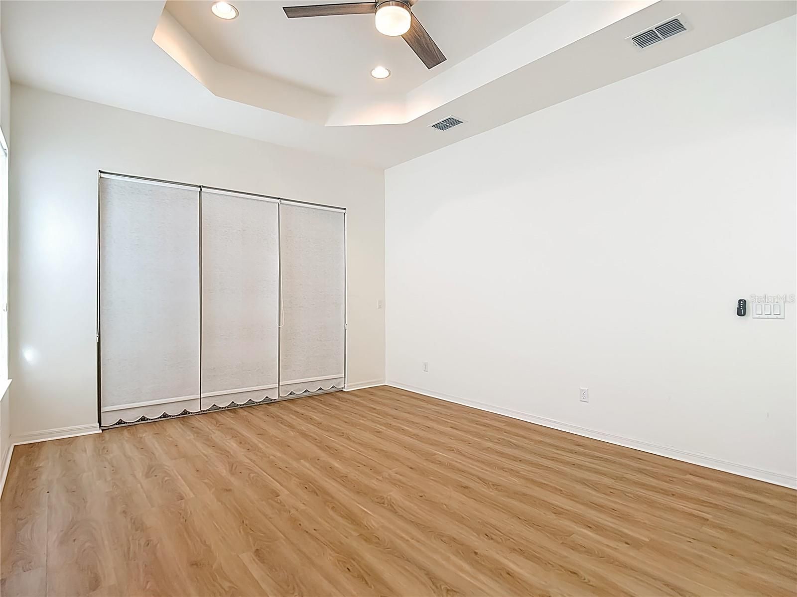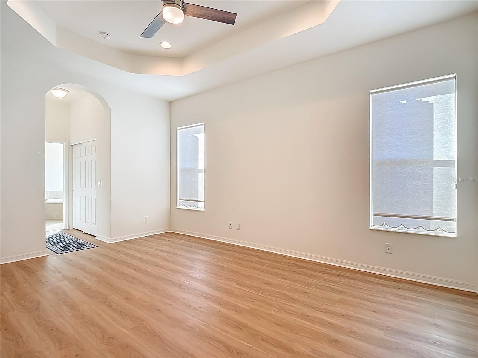 - Ceiling Fan(s), Crown Molding, Eat-in Kitchen, Kitchen/Family Room Combo, Open Floorplan, Main Level Primary, Solid-Wood Cabinets, Stone Counters, Thermostat, Tray Ceiling(s), Walk-In Closet(s), Window Treatments