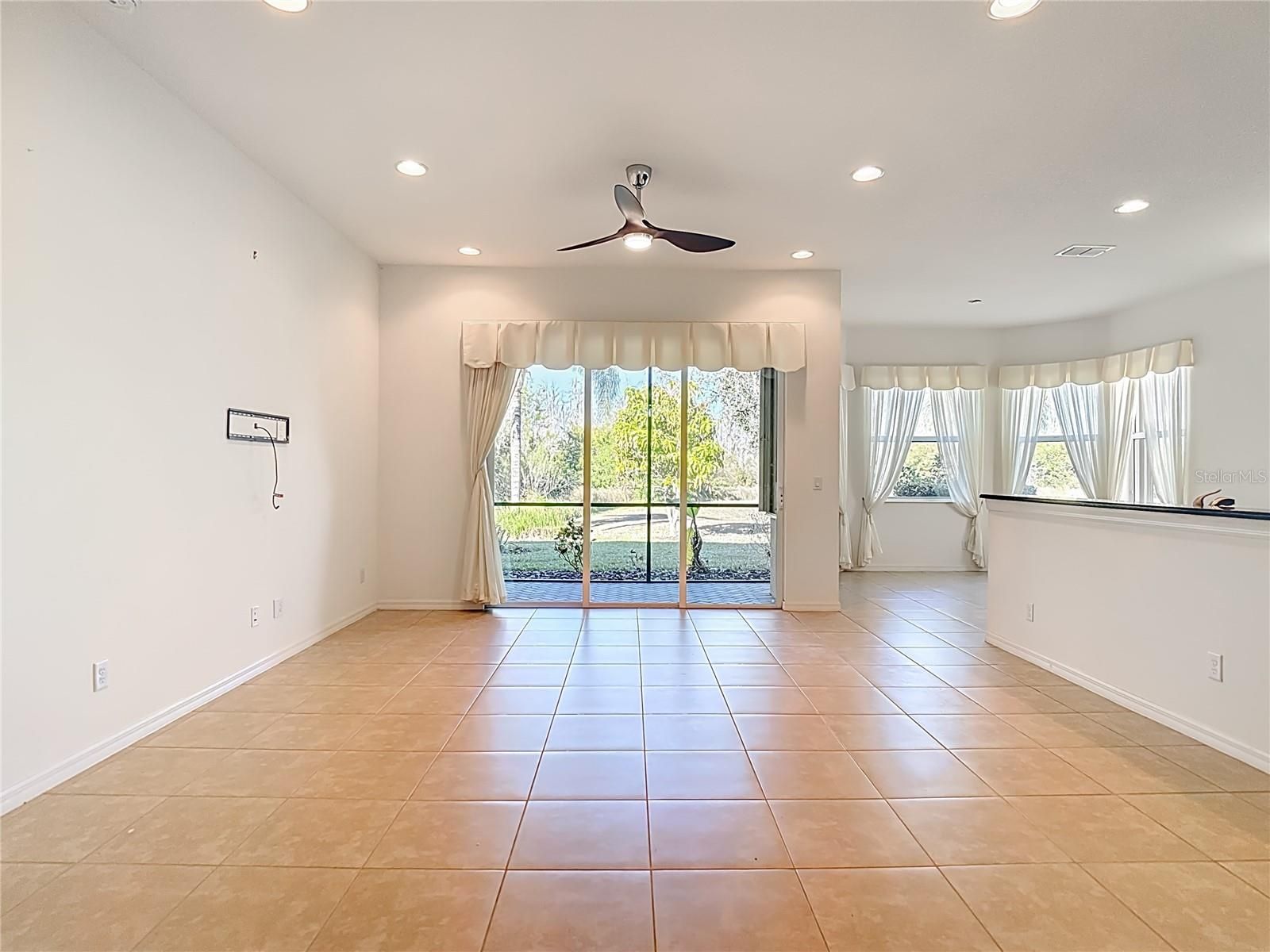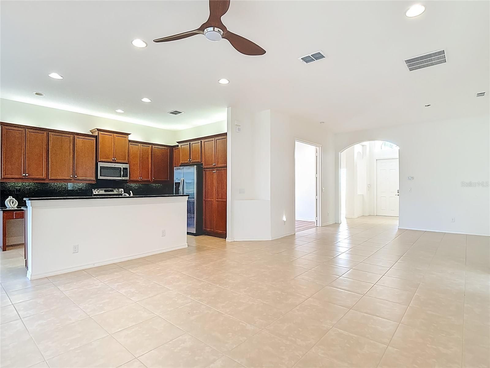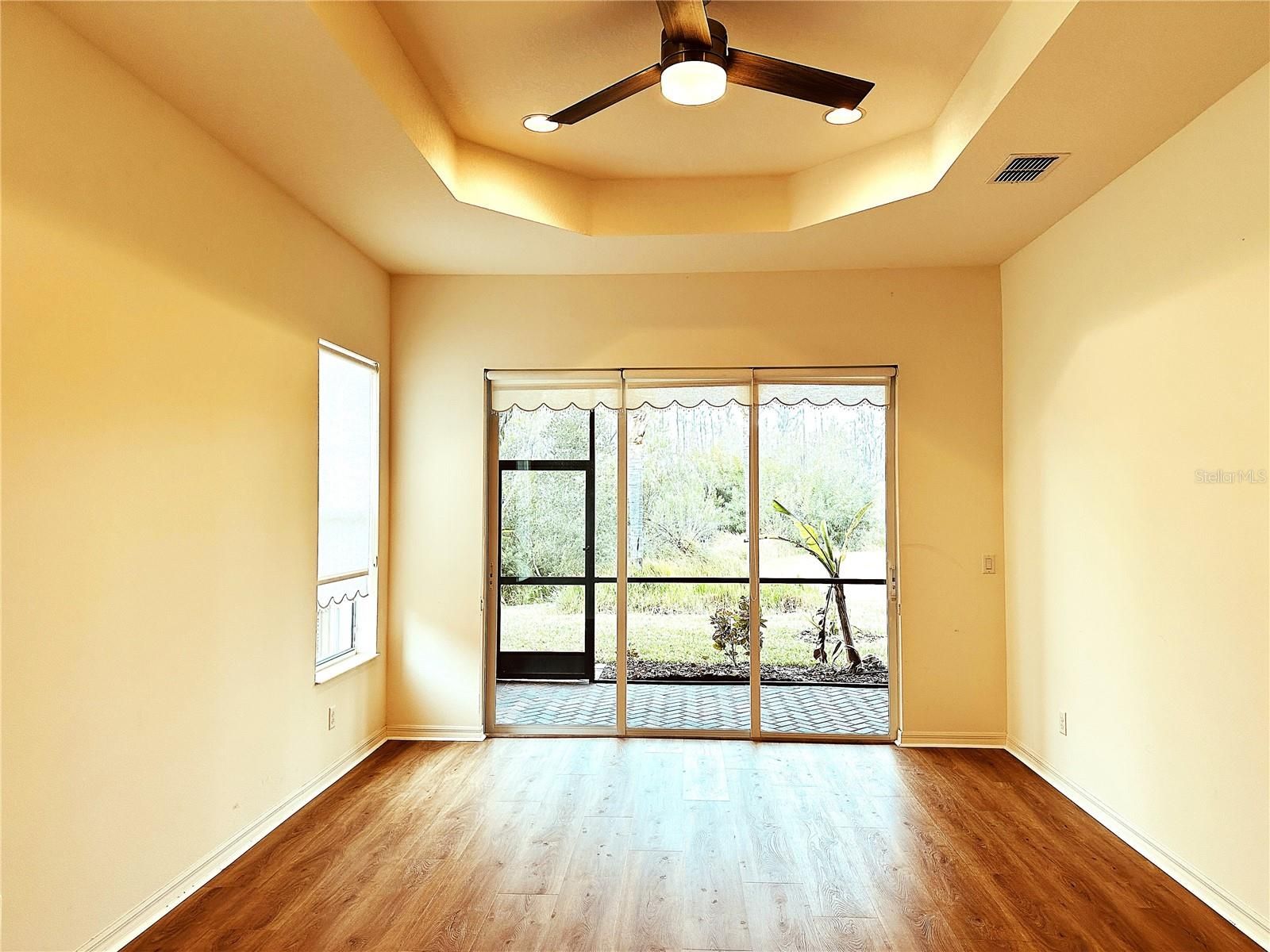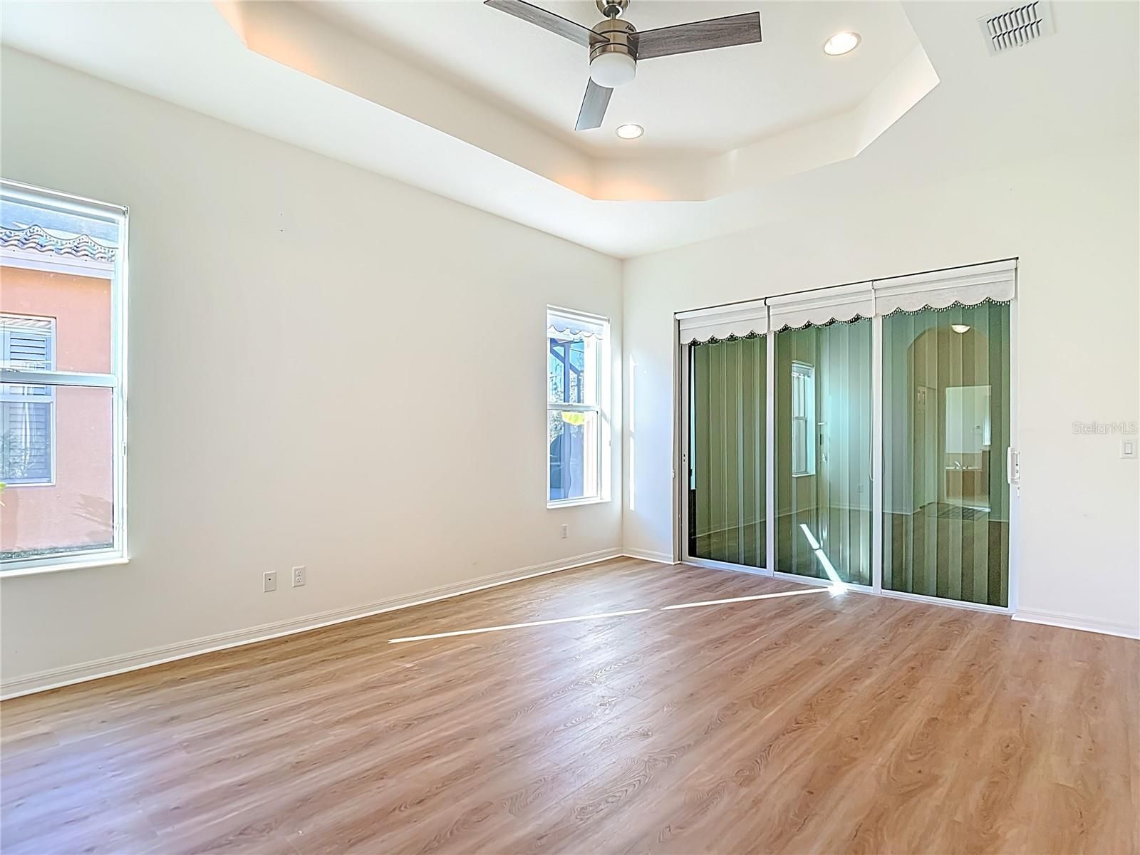 - Ceiling Fan(s), Crown Molding, Eat-in Kitchen, Kitchen/Family Room Combo, Open Floorplan, Main Level Primary, Solid-Wood Cabinets, Stone Counters, Thermostat, Tray Ceiling(s), Walk-In Closet(s), Window Treatments