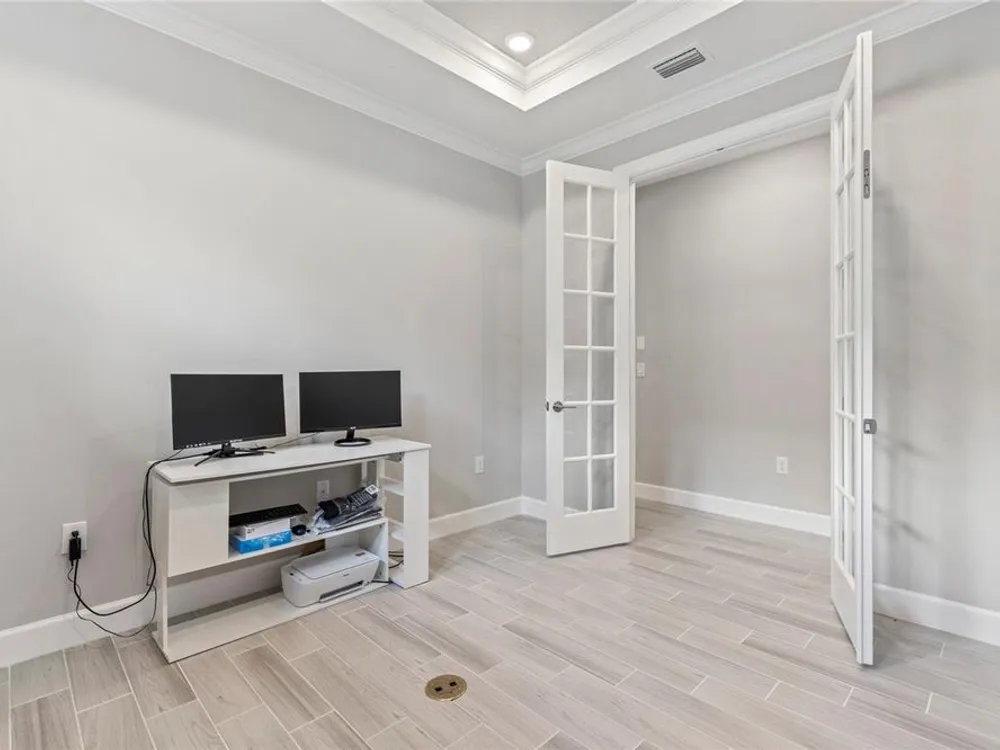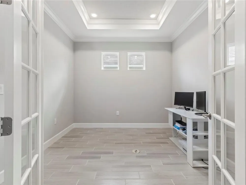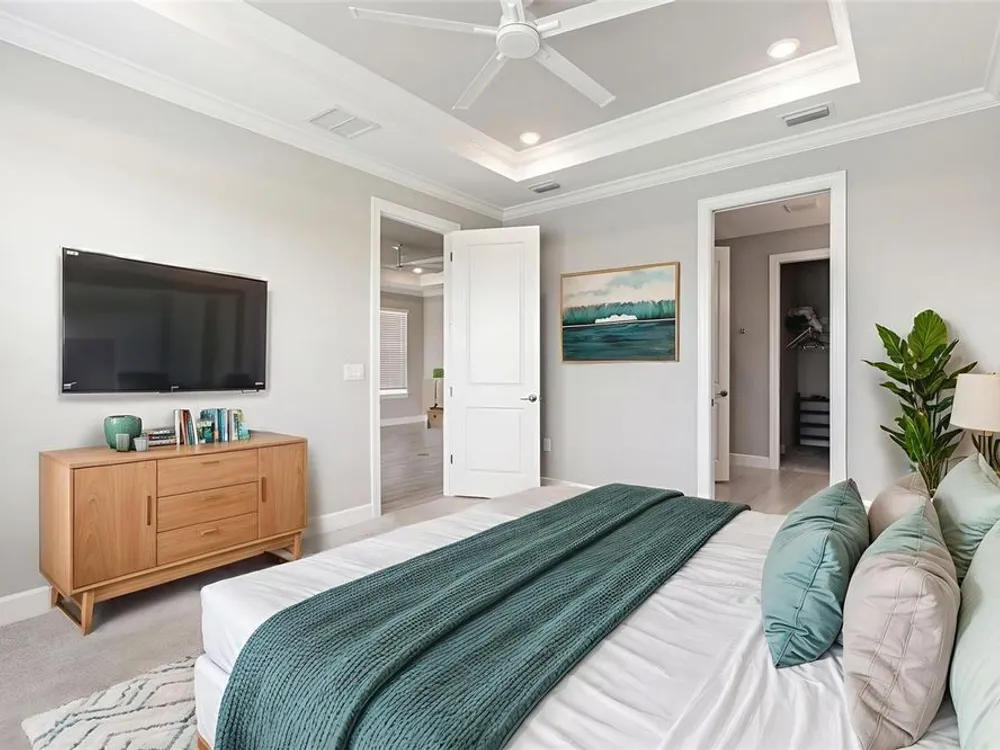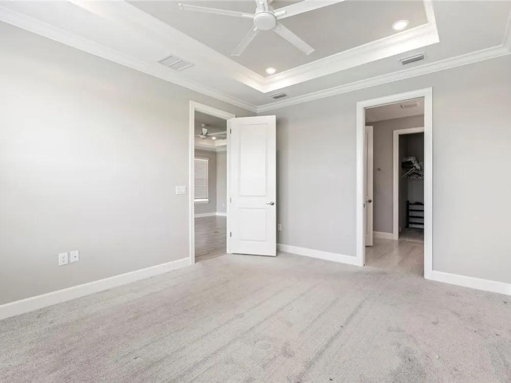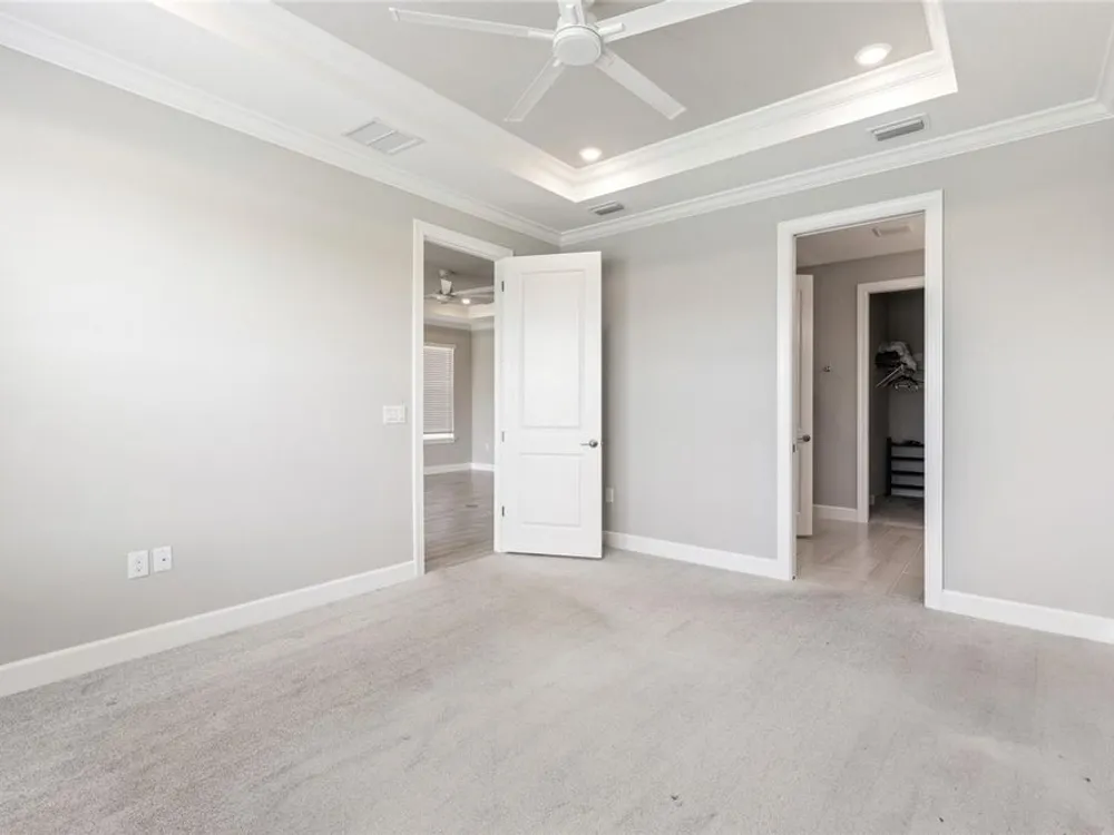 - Ceiling Fan(s), Crown Molding, High Ceilings, Main Level Primary, Stone Counters
