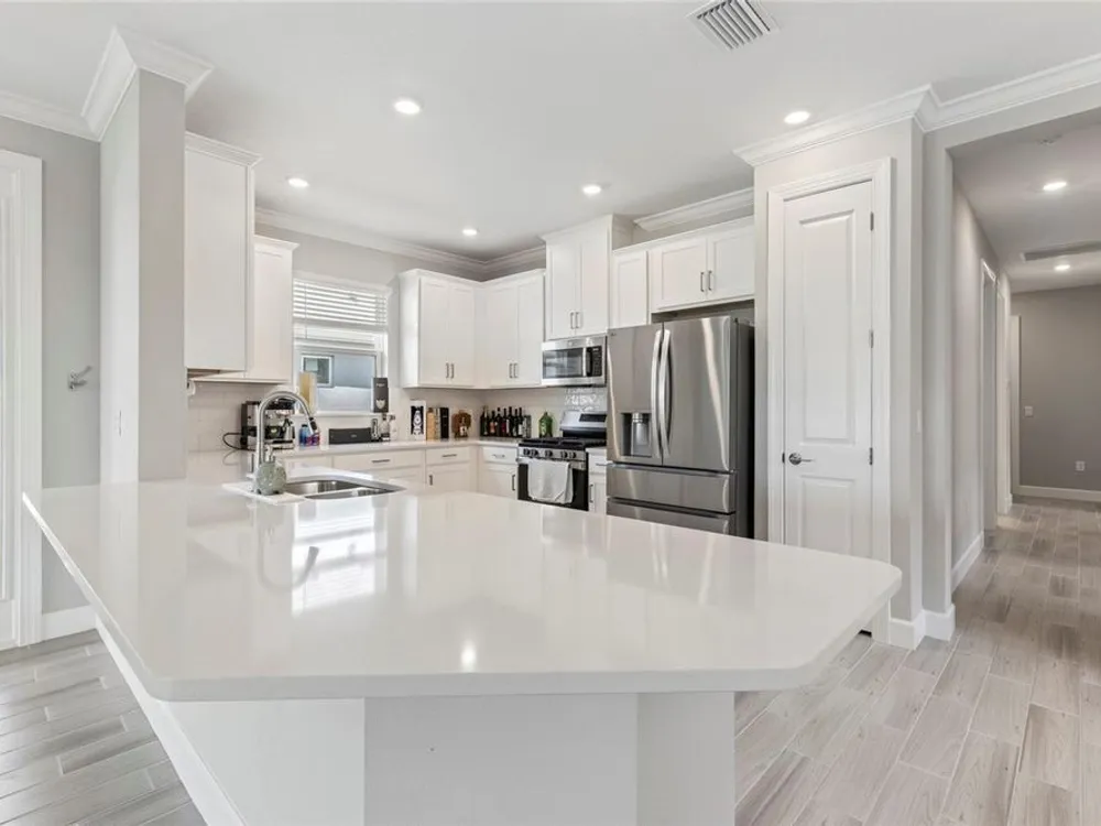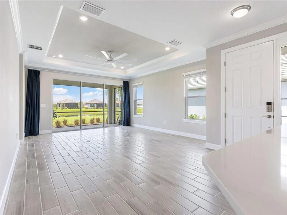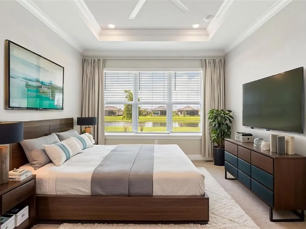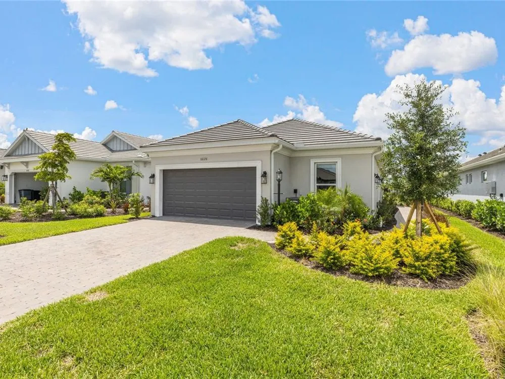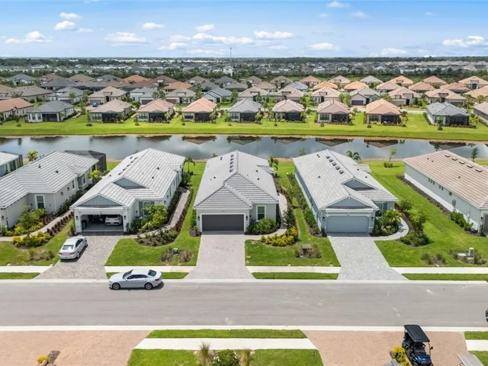 Major Price Reduction – Don’t Miss This Rare Opportunity! Enjoy breathtaking water views and a premium golf-deeded lot without waiting for new construction! Welcome to resort-style living in the prestigious, gated community of Esplanade at Azario. This immaculate 3-bedroom, 2-bath Arrezo model offers 1,926 sq. ft. of thoughtfully designed, maintenance-free living—where every day feels like a vacation. Built in 2024, this pond-facing home features a flat tile roof and is covered under a transferable builder warranty through October 2025. The home is pre-plumbed for a pool, making it easy to create your dream outdoor oasis—perfect for those serene Florida sunsets. Step inside to a bright, open layout enhanced by tray ceilings in the primary suite, living room, and flex space, along with crown molding throughout. The gourmet kitchen showcases shaker cabinets, quartz countertops, a gas range, subway tile backsplash, and stainless steel appliances. Included are an LG refrigerator and Samsung Bespoke washer and dryer for added convenience. The primary suite is a true retreat, offering a spacious walk-in closet, dual vanities, an oversized shower, and a private water closet. The two additional bedrooms and flex room are positioned for optimal privacy—ideal for guests or a home office. Located just minutes from world-class beaches, shopping, dining, and entertainment, this home offers more than a place to live—it delivers the Florida lifestyle you've been dreaming of. Schedule your showing today—and start living like you're on vacation tomorrow!