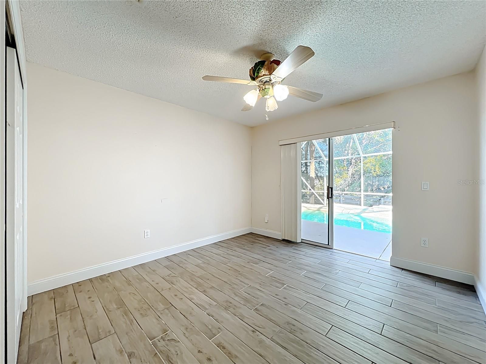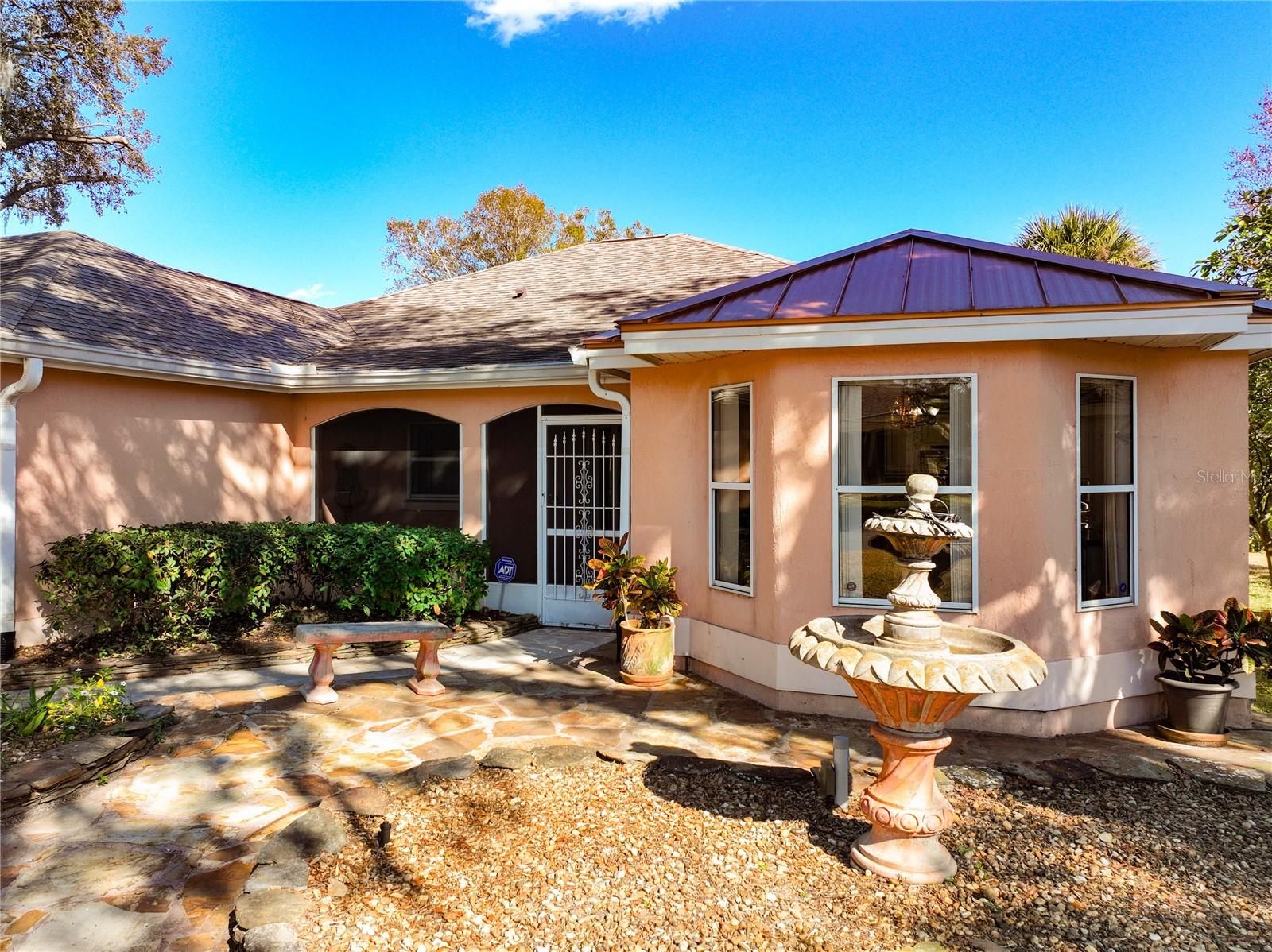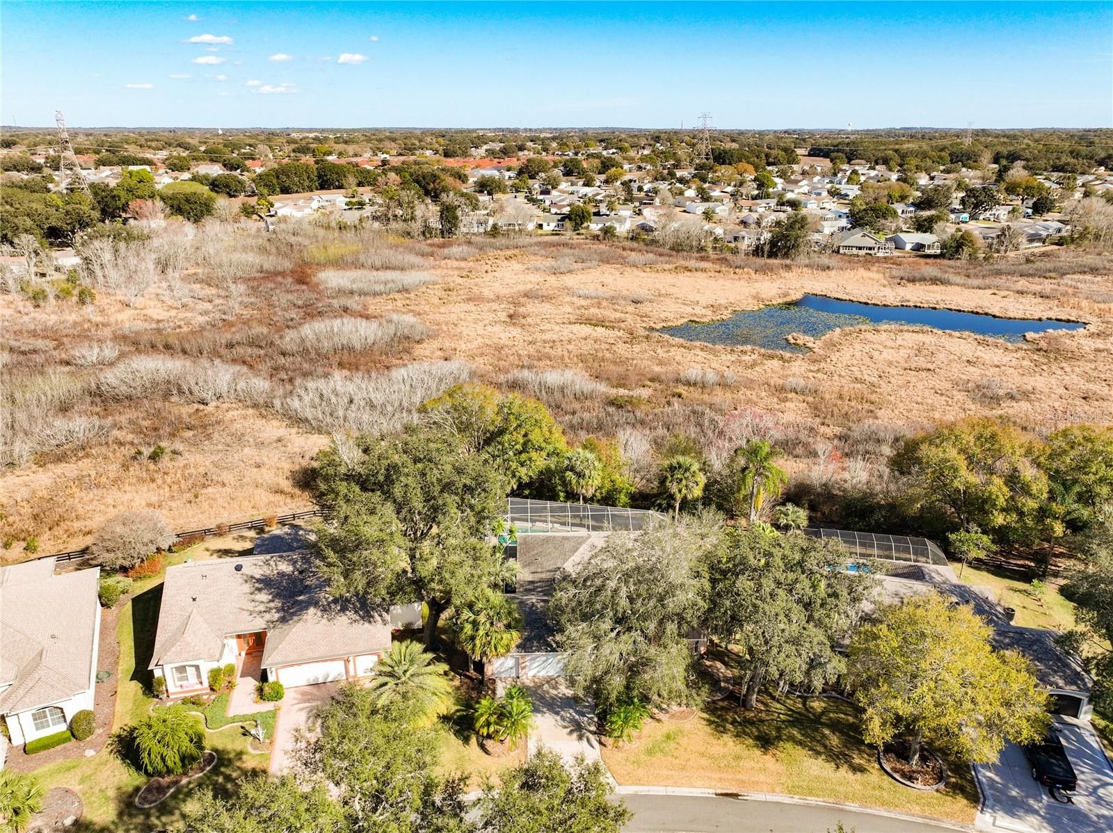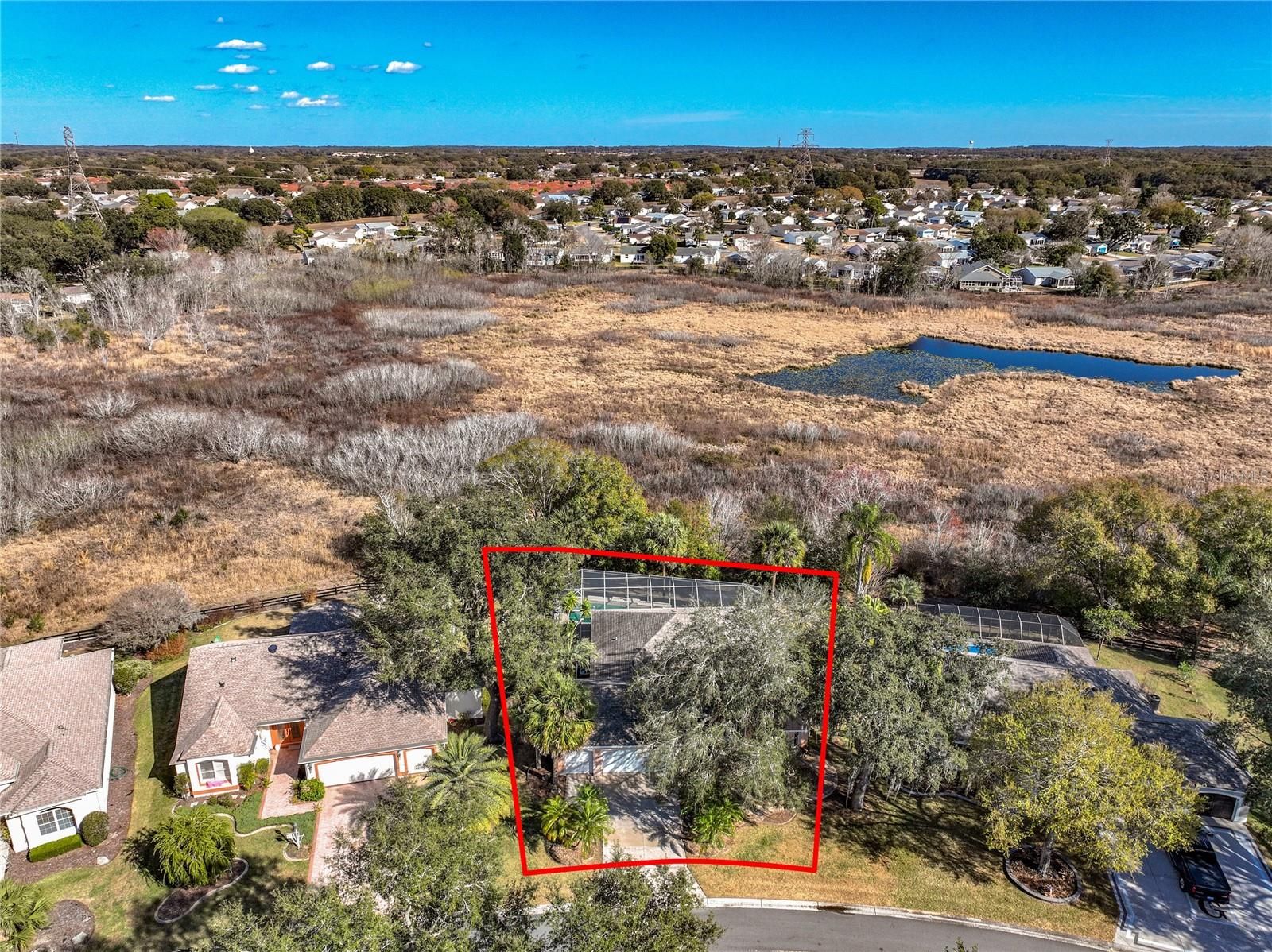 Welcome to this beautifully situated 3-bedroom, 2-bath pool home in the heart of The Villages, perfectly positioned between Spanish Springs Town Square and Lake Sumter Landing Market Square. Set on a peaceful wildlife preserve, this home offers privacy, scenic views, and the opportunity to enjoy local wildlife—all while being close to endless shopping, dining, and entertainment. The Villages’ renowned golf cart lifestyle makes getting around easy and fun, and the BOND IS PAID, adding tremendous value. As you arrive, you’re greeted by a charming screened front porch and mature, well-maintained landscaping, complete with grapefruit and two orange trees. The oversized garage comfortably accommodates two cars plus a golf cart and includes a 50-amp RV plug. Recent updates add peace of mind, including a new garage door, opener, remotes, and keypad replaced in 2026, along with a new pool pump replaced in 2026. The hot water heater was replaced in 2021. Inside, the spacious kitchen is a standout, offering abundant cabinetry, generous counter space, a convenient bar-top, a sit down desk area, and a sunny eat-in area highlighted by a bay window. The open living and dining areas are complete with crown moulding and are ideal for entertaining, with sliding glass doors that lead directly to the screened pool and outdoor living space. A built-in corner bar adds the perfect touch for hosting guests and serving favorite beverages. The split bedroom floor plan provides privacy, with secondary bedrooms separated from the primary suite. The primary bedroom features two closets and an ensuite bath with dual vanities, ample lighting, a dedicated sitting area for getting ready, and a separate toilet and shower room. Step outside to your private retreat, featuring an 11' x 13' covered lanai plus an additional 18' x 23' of screened patio space which currently has a cabana. It is the perfect spot for relaxing, starting or ending your day or entertaining while enjoying the expansive green space beyond. This home is conveniently located near several recreation centers, resort-style pool areas, golf courses, pickleball, and a plethora of shopping, dining, nightlife, and live entertainment, as well as the postal kiosk. Nearby conveniences also include banks, medical offices, and The Villages Regional Hospital, with easy access to CR 446 and US Hwy 27/441 for travel beyond the community. Offering privacy, thoughtful upgrades, and an unbeatable lifestyle, this home truly has it all. Schedule your showing today and make the Village lifestyle your own—this one won’t last long!