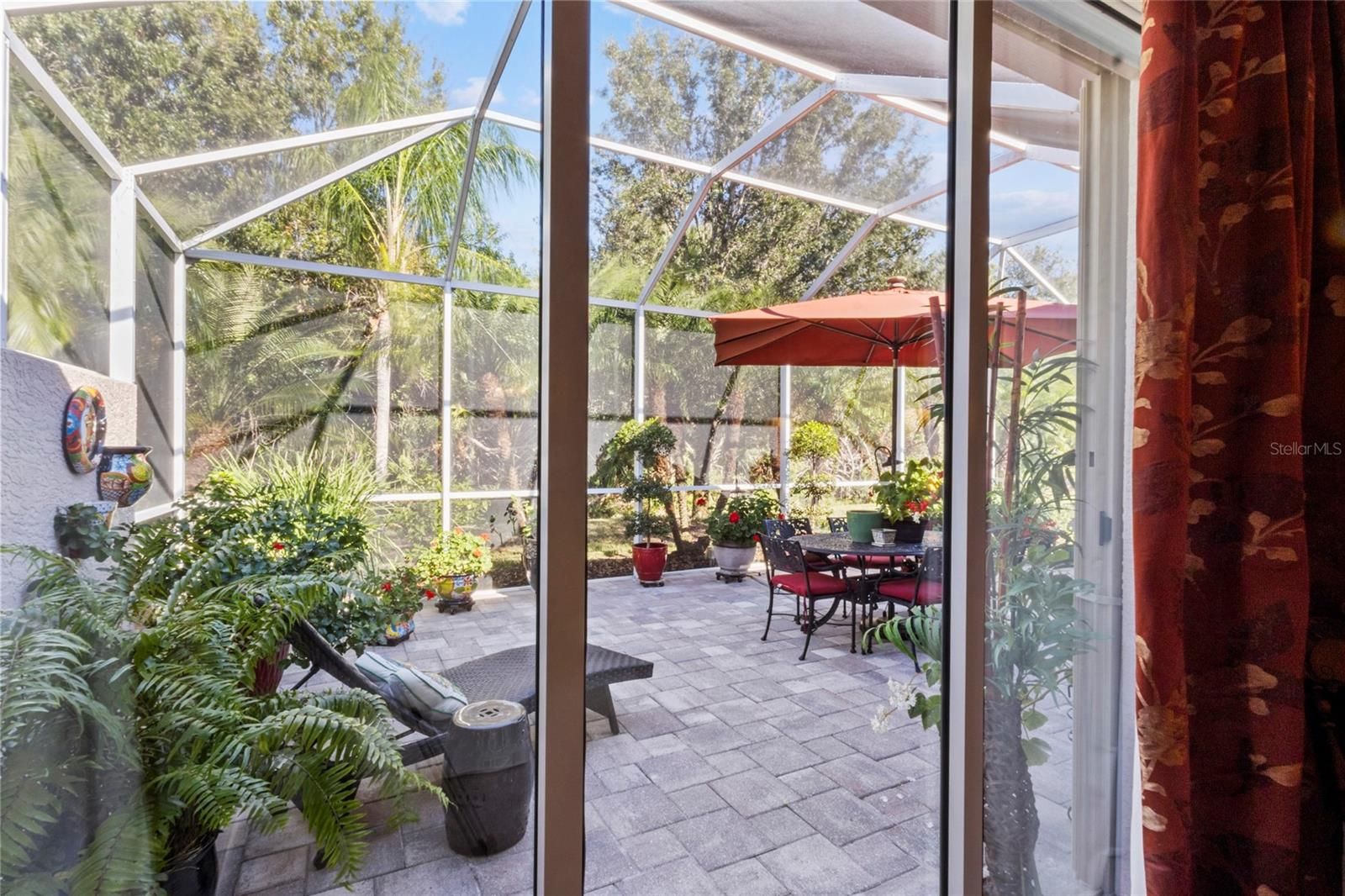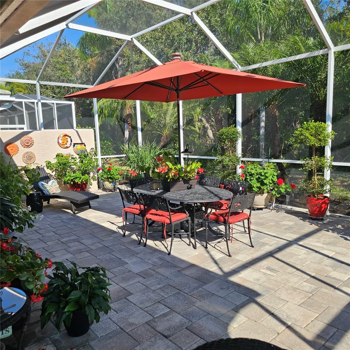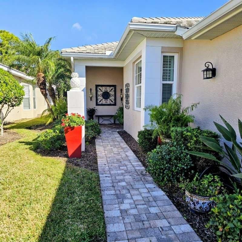 Discover easy, maintenance-free living where everything is handled for you, giving you more time to enjoy the Florida lifestyle. Exterior insurance, roof reserves, lawn care, pest and termite protection, exterior painting, and discounted high-speed internet are included in the quarterly fees. The community offers two pools, a resident-run clubhouse, no CDD fees, and optional membership at Plantation Golf & Country Club for golf, tennis, pickleball, fitness, dining, and social activities. This patio home stands out for its exceptional storage. The primary suite includes two walk-in closets, and the guest suite features another large walk-in closet plus pull-down attic stairs leading to a finished storage room—a rare and valuable feature in Florida homes. Inside, the home is bright and welcoming with neutral tile floors, plantation shutters, crown molding, and tray ceilings. The kitchen has crisp white cabinets, granite countertops, double ovens (2023), induction cooktop with hood vented to outside, Bosch dishwasher (2023), a walk-in pantry, breakfast bar, and an eat-in area framed by a bay window and additional cabinetry. The oversized screened lanai feels like a private tropical oasis, surrounded by lush landscape that creates complete privacy. A bubbling fountain and low-voltage lighting make this space perfect for relaxing or entertaining. Additional highlights include an inside laundry with utility sink, extra cabinetry and counter space, an epoxy-coated garage floor (2025), interior paint (2024), and a new HVAC system with blue light technology (2020). The home is fully storm-ready with impact glass windows, motorized roll-down Kevlar hurricane screen on the covered lanai, and accordion shutters at the primary bedroom slider—allowing quick and complete protection. A third bedroom currently serves as a den/office, offering flexible space for work or hobbies. Immaculately maintained and thoughtfully upgraded, this home offers the rare combination of maintenance-free living, privacy, and exceptional storage in a highly desirable Venice community.