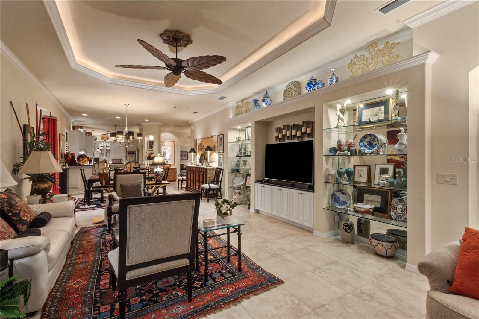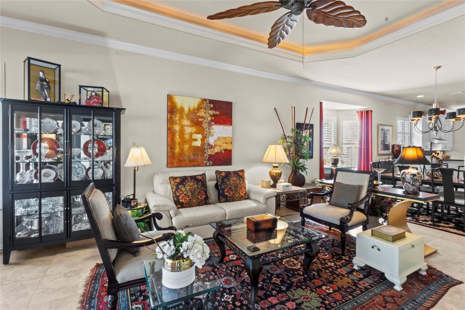 - Ceiling Fan(s), Crown Molding, Eat-in Kitchen, High Ceilings, Living/Dining Room, Open Floorplan, Main Level Primary, Solid Surface Counters, Split Bedrooms, Stone Counters, Tray Ceiling(s), Walk-In Closet(s), Window Treatments