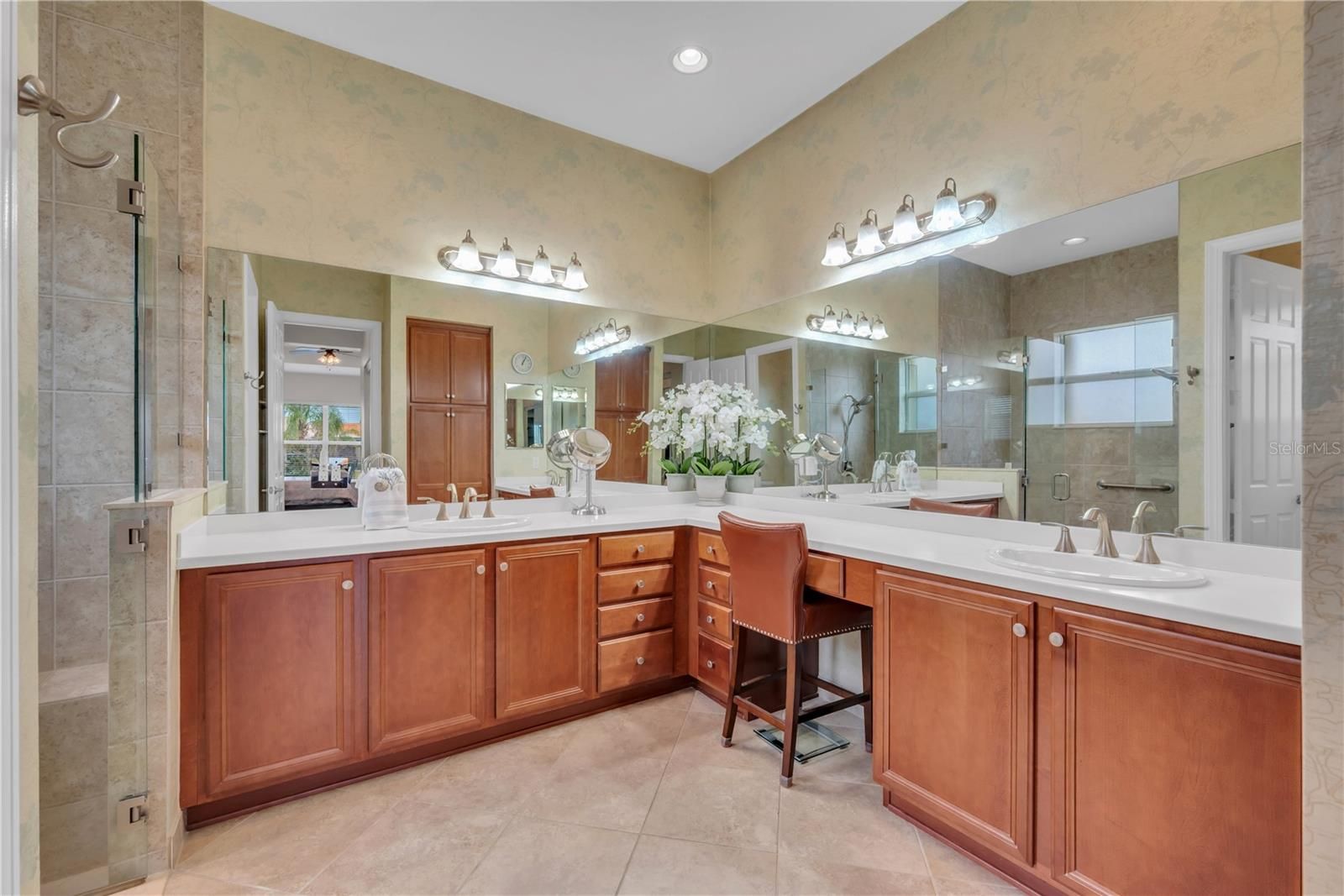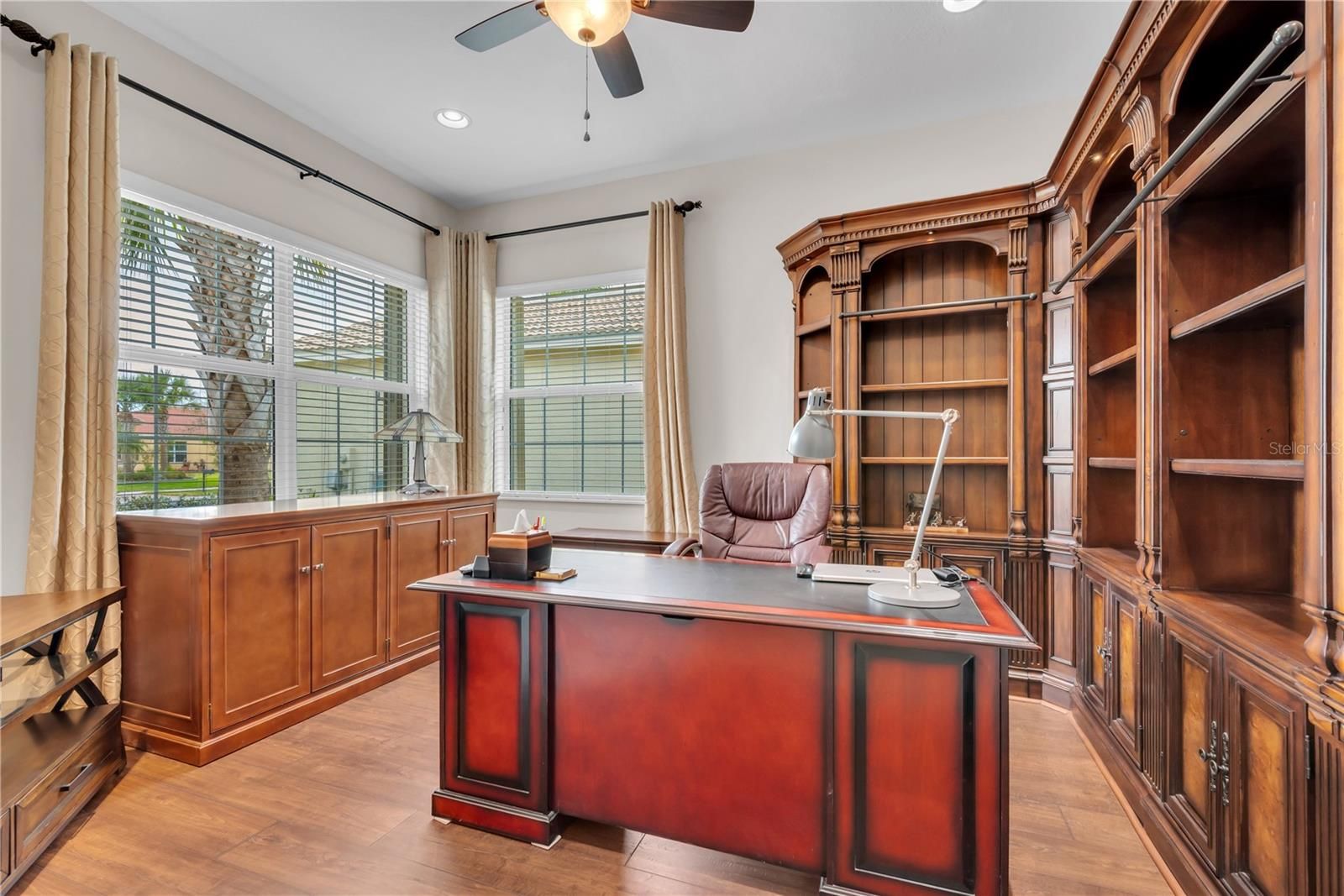 Experience luxury living at its finest in this highly sought-after Palazzo model, perfectly positioned to capture a spectacular water view that will truly take your breath away. Enjoy peaceful mornings and stunning sunsets from the extended covered and screened lanai, designed to embrace Florida’s indoor-outdoor lifestyle. The home’s impressive curb appeal begins with a brick paver driveway and walkway, barrel tile roof, and lush tropical landscaping that create an elegant and welcoming exterior. Located in Valencia Lakes, Tampa Bay’s premier 55+ resort-style community, this immaculate residence offers three spacious bedrooms, a large den, two and a half bathrooms, and a 2.5-car garage. Enter through the screened covered entry and double 8-foot impact glass doors into a grand foyer highlighted by an 11-foot coffered ceiling. The open-concept design seamlessly connects the great room, casual dining area, gourmet kitchen, and formal dining room, creating a bright and airy atmosphere. Triple 8-foot sliding glass doors in the great room frame the breathtaking water view and open directly to the expansive lanai. The gourmet kitchen is beautifully appointed with upgraded granite countertops, an undermount sink, reverse osmosis water filtration system, 42-inch soft-close dovetailed raised panel white cabinetry, under and over cabinet lighting, glass display doors, pull-out trash, designer backsplash, a triple cabinet pantry with roll-out shelves, and upgraded stainless steel appliances including a slide-in range, new refrigerator, microwave, and dishwasher. The adjacent formal dining room provides the perfect setting for hosting special occasions. The luxurious primary suite is a private retreat featuring a coffered ceiling, wood-look laminate flooring, two large custom walk-in closets, and a charming bay window sitting area overlooking the water. The spa-inspired primary bath offers dual vanities with Corian countertops, a walk-in shower with built-in seat and tile to the ceiling, custom frameless glass enclosure, and comfort-height commode. The oversized den, entered through double doors, features upgraded laminate flooring and offers flexible space for a home office or media room. Two guest bedrooms are thoughtfully situated away from the primary suite to provide maximum privacy. The secondary bathroom includes a tub and shower combination with custom frameless glass enclosure, Corian countertops, and maple cabinetry, while the powder room is conveniently located and includes a custom built-in linen closet. A separate laundry room features additional cabinetry, a utility sink with storage, and an extra-large capacity washer and dryer. This meticulously maintained home also features a new HVAC system in 2025, replaced water heater, designer lighting and ceiling fans, floor outlets, extended screened lanai, whole-house water softener, designer built-in closets, accordion hurricane shutters, rain gutters, whole-house surge protector, split HVAC system in the garage, overhead garage storage racks, and freshly painted interior. The home is truly move-in ready, with select furniture available. Valencia Lakes offers an unparalleled resort lifestyle centered around a stunning 40,000-square-foot clubhouse with 24-hour fitness center, resort-style pools, on-site bistro, tennis and pickleball courts, bocce, social clubs, live entertainment, arts and crafts, cooking classes, scenic walking paths, and countless activities. Schedule a showing today!