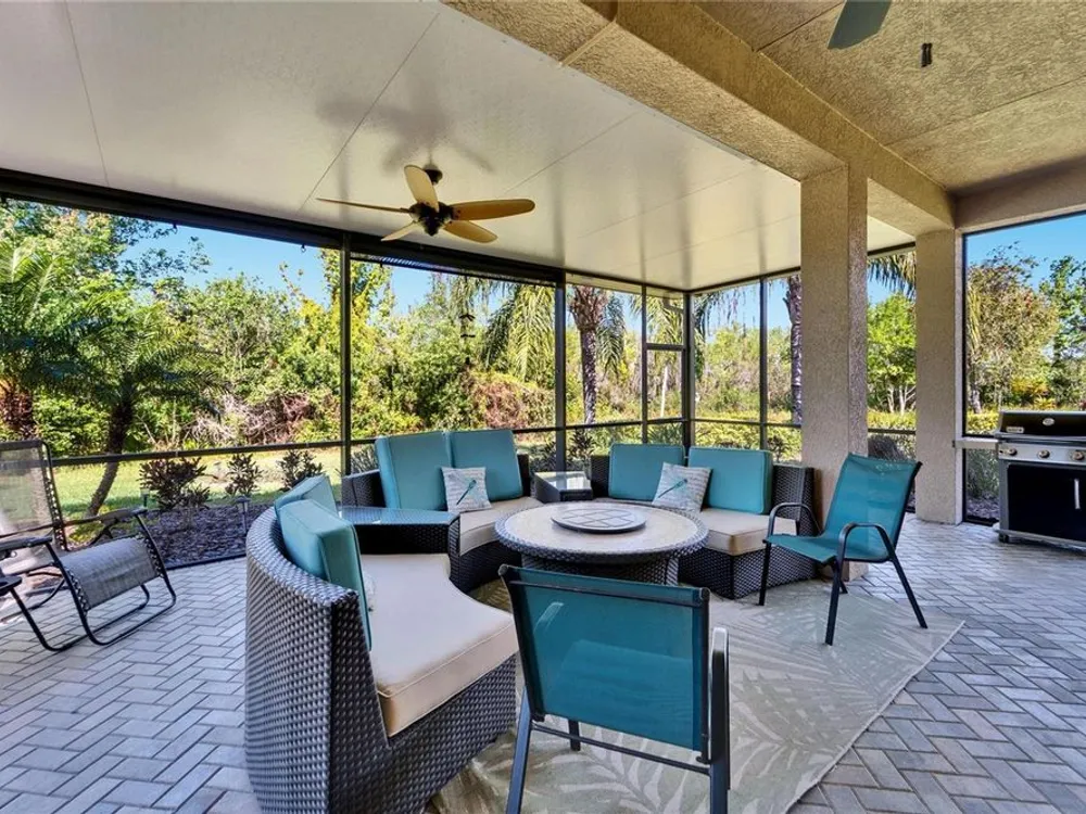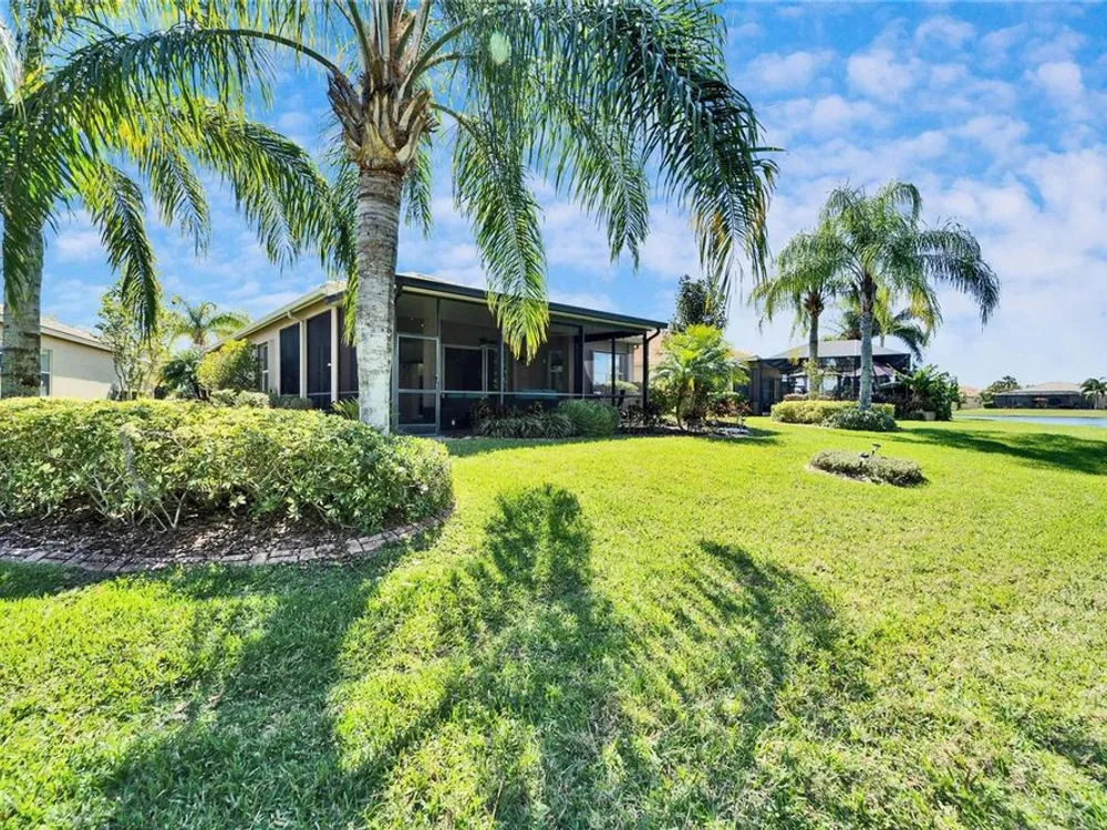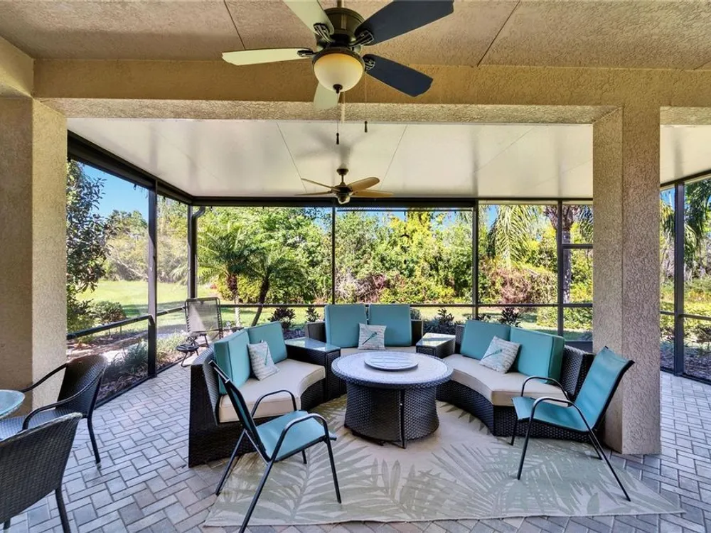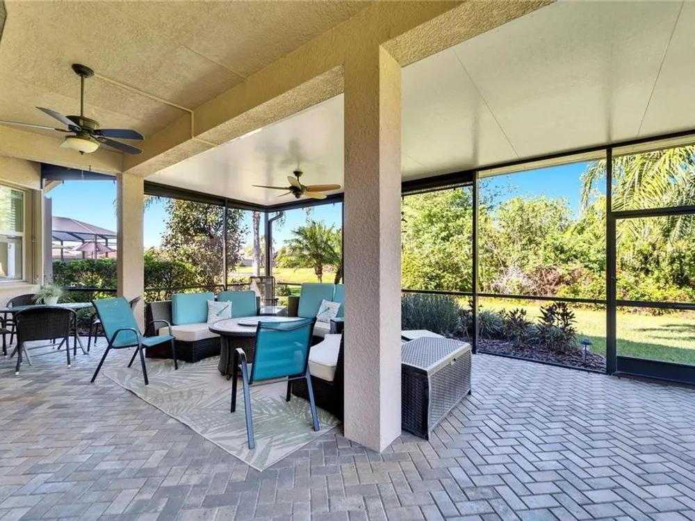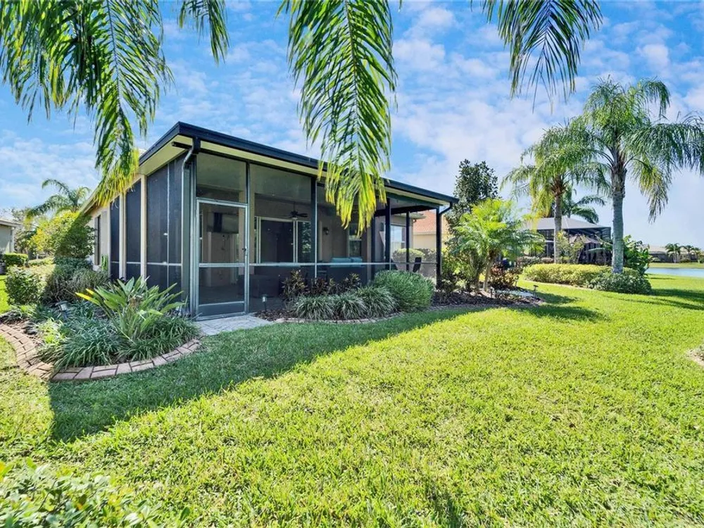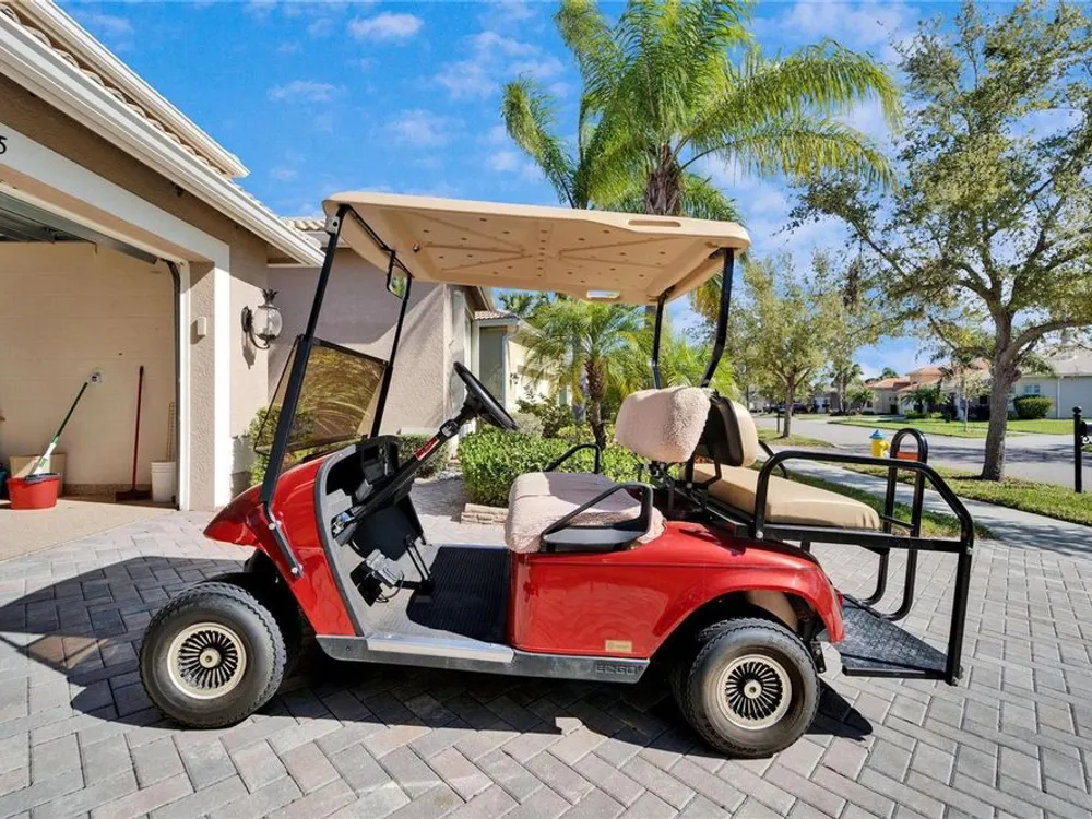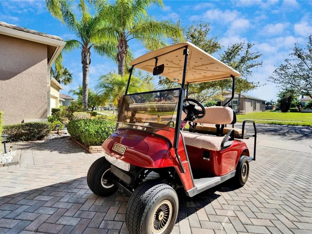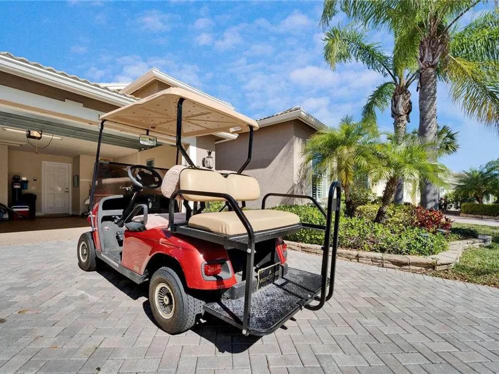 Spectacular FULLY FURNISHED GENOVA model with both WATER and CONSERVATION views. This 2074 Sq. Ft. home features 2 bedrooms plus den / study, 2 baths and 2 car garage. Move in ready, everything included, just bring your toothbrush! Extended covered lanai with propane gas fire pit to enjoy the scenic water and conservation views. GOLF CART INCLUDED with newer lithium batteries. ACCORDIAN HURRICANE SHUTTERS on windows along with whole house gutters. Open floor plan is perfect for daily living and entertaining. Wide sliders lead out to the extended screened lanai with covered roof. Outdoor furniture and Weber grill included so you can relax and enjoy the sun with both water and conservation views. Gourmet kitchen features breakfast bar, 42 inch wood cabinets, over/under lighting, granite counters, tile backsplash and cabinet pantry. Stainless-steel appliances with new refrigerator in 2024. Breakfast nook for casual dining while enjoying the outdoor view. Spacious master suite with two large walk-in closets. Master spa like bath features dual vanities and roman tub. Split floor plan with the second bedroom and guest bath located in the front of the home for privacy. Versatile den / study to offer additional living space. Covered screened front entry with glass doors leading to coffered ceiling foyer. Crown molding throughout with plantation shutters on all windows. Newer upgraded carpet in master and second bedrooms. Other updates include new HVAC system in 2022, epoxy garage floor and water softener with whole house filter. Ceramic tiles installed diagonally in main areas plus den/ study. Enjoy the Florida lifestyle in this desirable active adult community located in the Greater Tampa area. Conveniently located near Tampa, Sarasota, St. Pete with easy access to beaches, shopping, entertainment and health care facilities. Approximately 90 minutes to Walt Disney World. This sought after community has a 40,000 sq.ft. clubhouse featuring a huge social hall that offers entertainment, live shows and dances. Numerous clubs to satisfy every interest. Clubhouse amenities include fitness center, sauna, billiards, card rooms, arts and craft studio. The outdoor waterfront recreation area features a resort style heated pool, with lap pool. Other amenities include 7 pickleball courts, 6 USTA Har-Tru Clay tennis courts, 4 bocce courts, shuffleboard courts, half-court basketball, dog park, softball field and R/V boat storage area. Enjoy exploring the natural preserves and walking paths in your community with your included EZ Go golf cart. A short ride to the clubhouse amenities. Golf cart access to nearby shopping and restaurants. What are you waiting for, come and enjoy the Florida lifestyle ! Have a "Cheeseburger in Paradise" in our newly renovated bistro that will be opening soon !