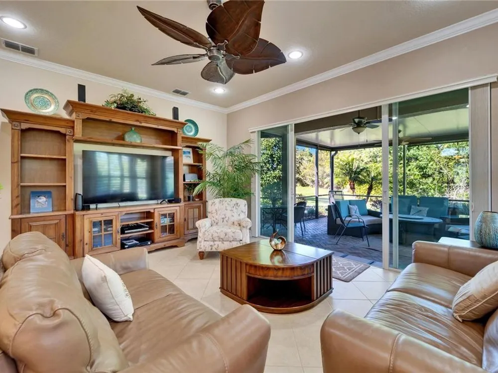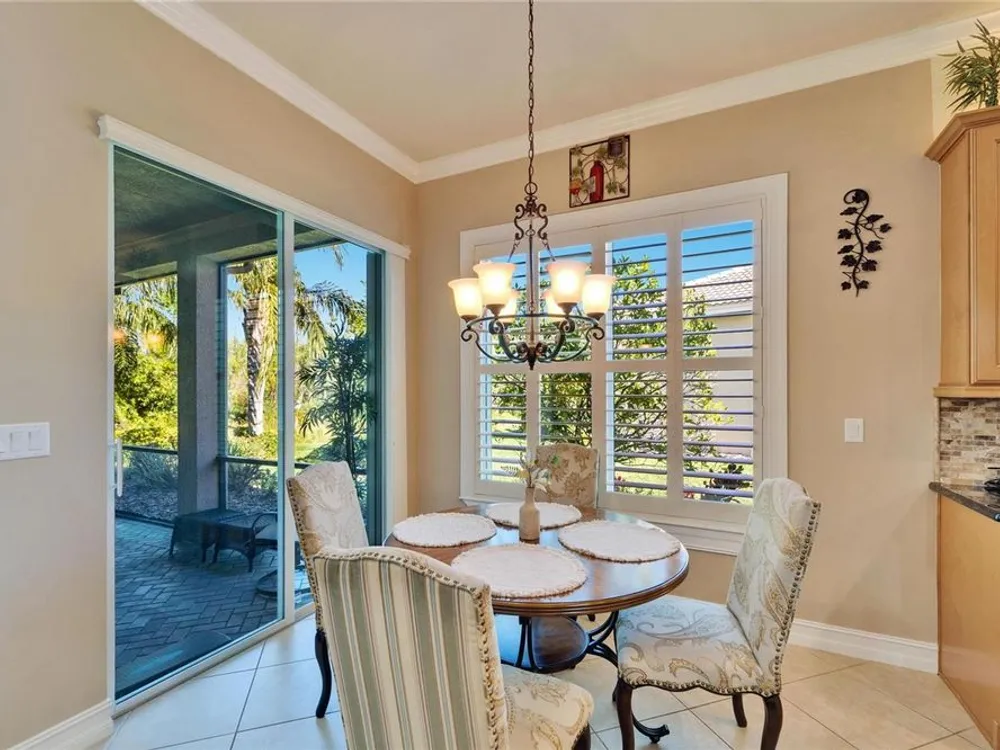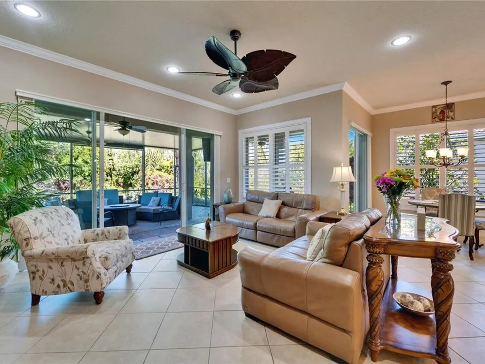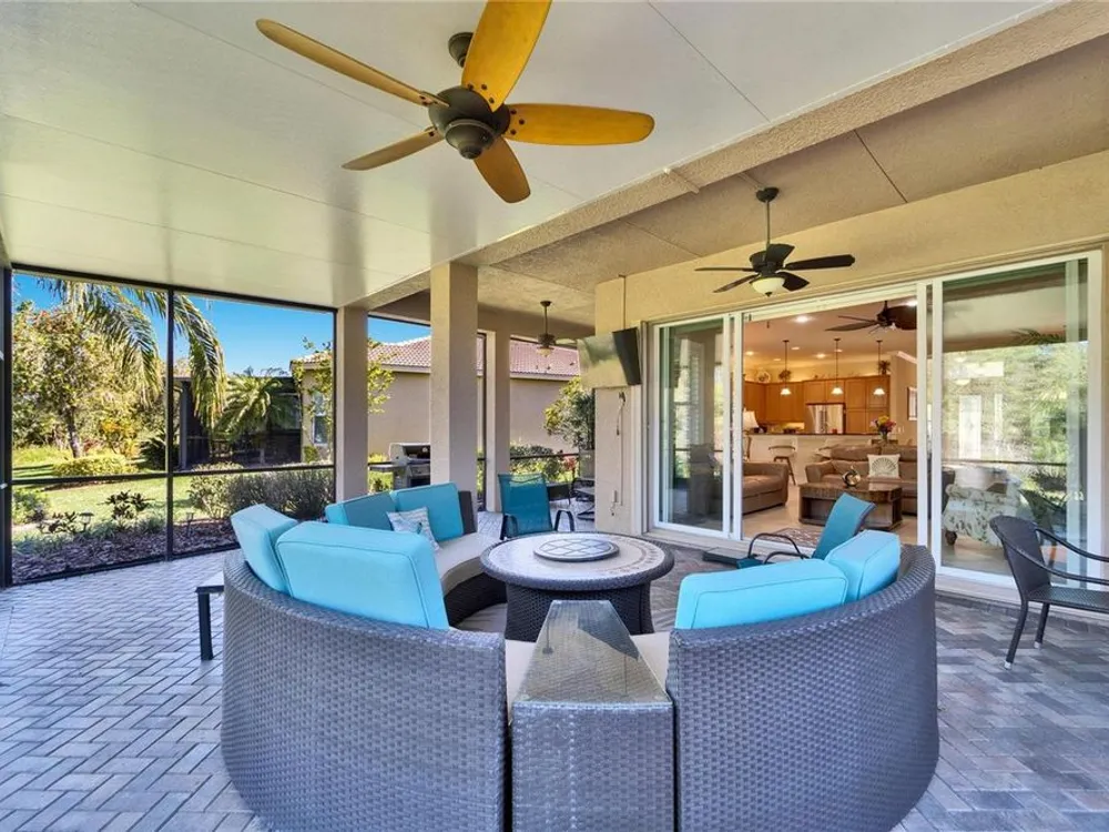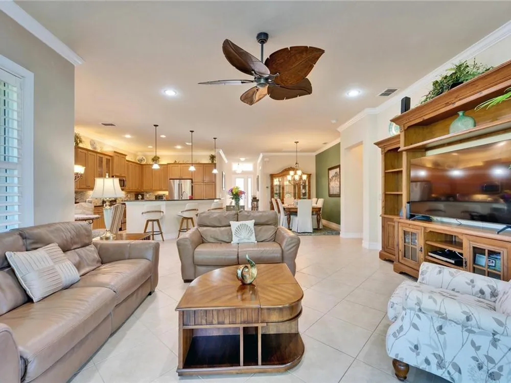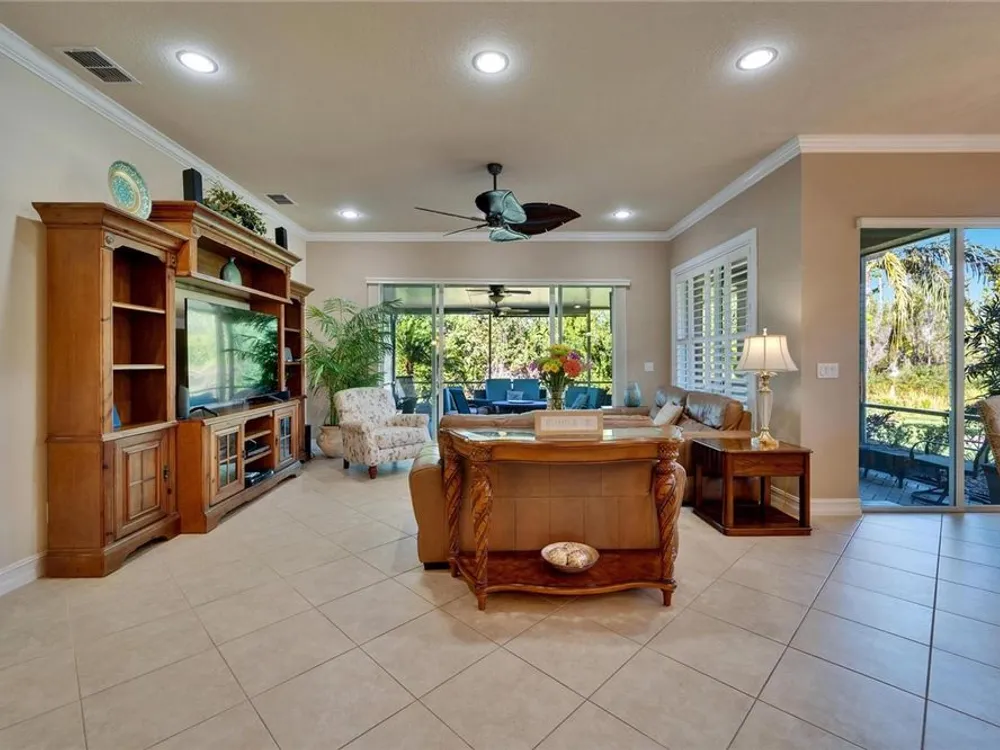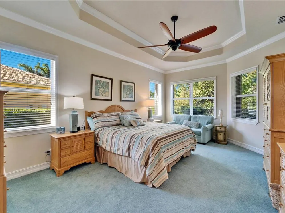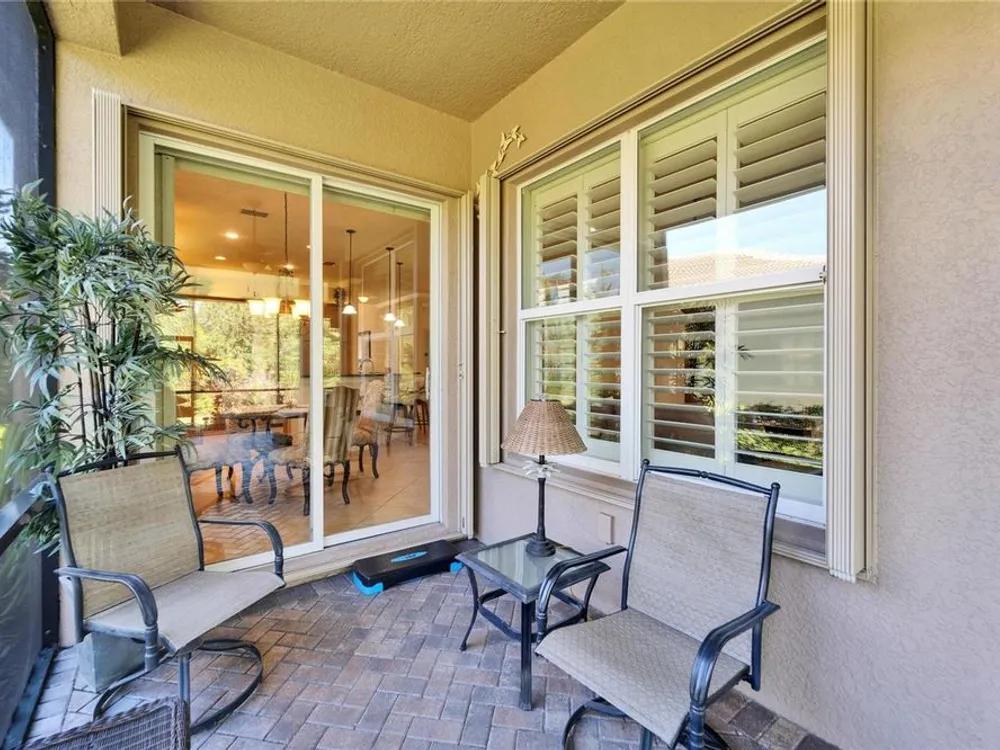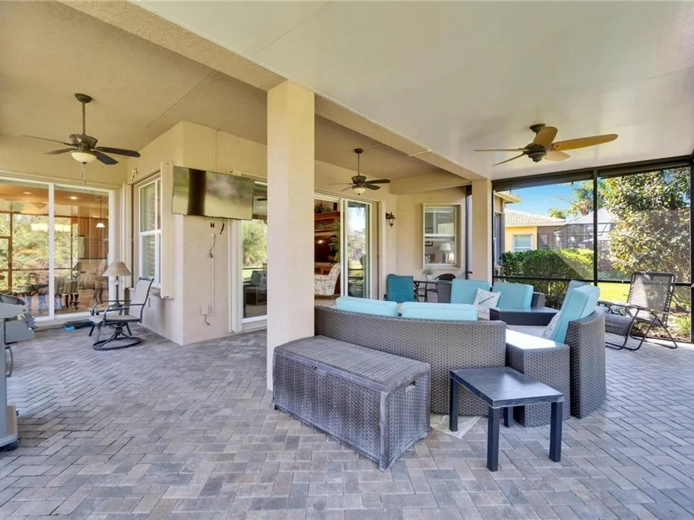 Spectacular FULLY FURNISHED GENOVA model with both WATER and CONSERVATION views. This 2074 Sq. Ft. home features 2 bedrooms plus den / study, 2 baths and 2 car garage. Move in ready, everything included, just bring your toothbrush! Extended covered lanai with propane gas fire pit to enjoy the scenic water and conservation views. GOLF CART INCLUDED with newer lithium batteries. ACCORDIAN HURRICANE SHUTTERS on windows along with whole house gutters. Open floor plan is perfect for daily living and entertaining. Wide sliders lead out to the extended screened lanai with covered roof. Outdoor furniture and Weber grill included so you can relax and enjoy the sun with both water and conservation views. Gourmet kitchen features breakfast bar, 42 inch wood cabinets, over/under lighting, granite counters, tile backsplash and cabinet pantry. Stainless-steel appliances with new refrigerator in 2024. Breakfast nook for casual dining while enjoying the outdoor view. Spacious master suite with two large walk-in closets. Master spa like bath features dual vanities and roman tub. Split floor plan with the second bedroom and guest bath located in the front of the home for privacy. Versatile den / study to offer additional living space. Covered screened front entry with glass doors leading to coffered ceiling foyer. Crown molding throughout with plantation shutters on all windows. Newer upgraded carpet in master and second bedrooms. Other updates include new HVAC system in 2022, epoxy garage floor and water softener with whole house filter. Ceramic tiles installed diagonally in main areas plus den/ study. Enjoy the Florida lifestyle in this desirable active adult community located in the Greater Tampa area. Conveniently located near Tampa, Sarasota, St. Pete with easy access to beaches, shopping, entertainment and health care facilities. Approximately 90 minutes to Walt Disney World. This sought after community has a 40,000 sq.ft. clubhouse featuring a huge social hall that offers entertainment, live shows and dances. Numerous clubs to satisfy every interest. Clubhouse amenities include fitness center, sauna, billiards, card rooms, arts and craft studio. The outdoor waterfront recreation area features a resort style heated pool, with lap pool. Other amenities include 7 pickleball courts, 6 USTA Har-Tru Clay tennis courts, 4 bocce courts, shuffleboard courts, half-court basketball, dog park, softball field and R/V boat storage area. Enjoy exploring the natural preserves and walking paths in your community with your included EZ Go golf cart. A short ride to the clubhouse amenities. Golf cart access to nearby shopping and restaurants. What are you waiting for, come and enjoy the Florida lifestyle ! Have a "Cheeseburger in Paradise" in our newly renovated bistro that will be opening soon !