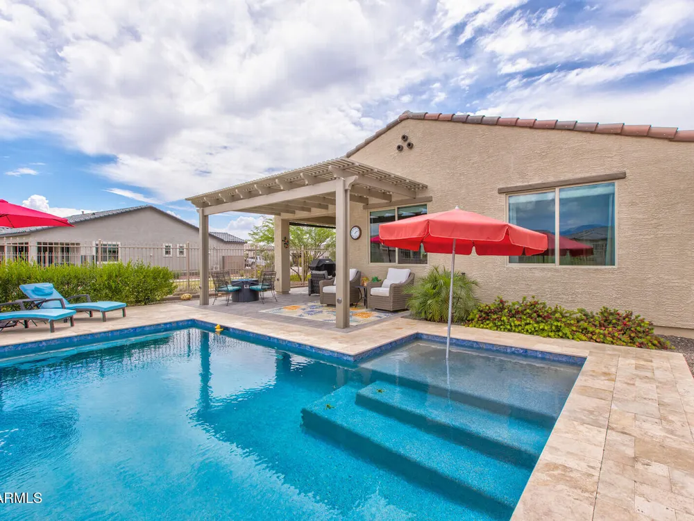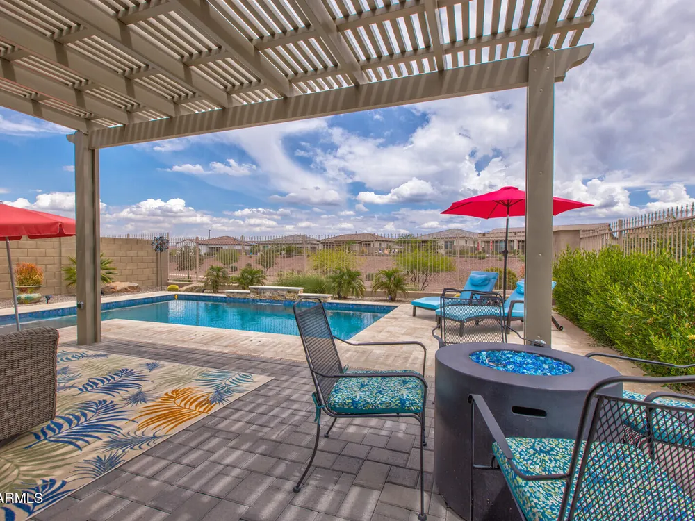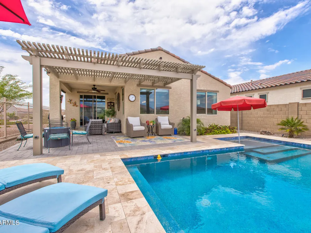 Welcome to CantaMia, a gated 55+ community where every day feels like a vacation. This beautifully maintained 2-bed, 2-bath single-level home offers the perfect blend of style, functionality, and low-maintenance living. Built in 2020, the home features a split floorplan that maximizes privacy and is ideal for hosting guests, a home office setup, or just enjoying your own space. The open-concept kitchen, living, and dining area offers a sleek electric fireplace, creating a cozy yet modern vibe for relaxing or entertaining.A 4-foot extended garage makes parking easy for pickup trucks. Outside, your backyard is a true retreat: a sparkling pool, shaded pergola, view fencing, and a quiet walking path just beyond offer a sense of openness while maintaining connection to the community. Enjoy serene views as you sip your morning coffee or unwind at sunset. As a CantaMia resident, you'll have access to resort-style amenities: clubhouse, fitness center, community pool, spa, walking trails, and a calendar full of activities to help you stay social, active, and inspired.