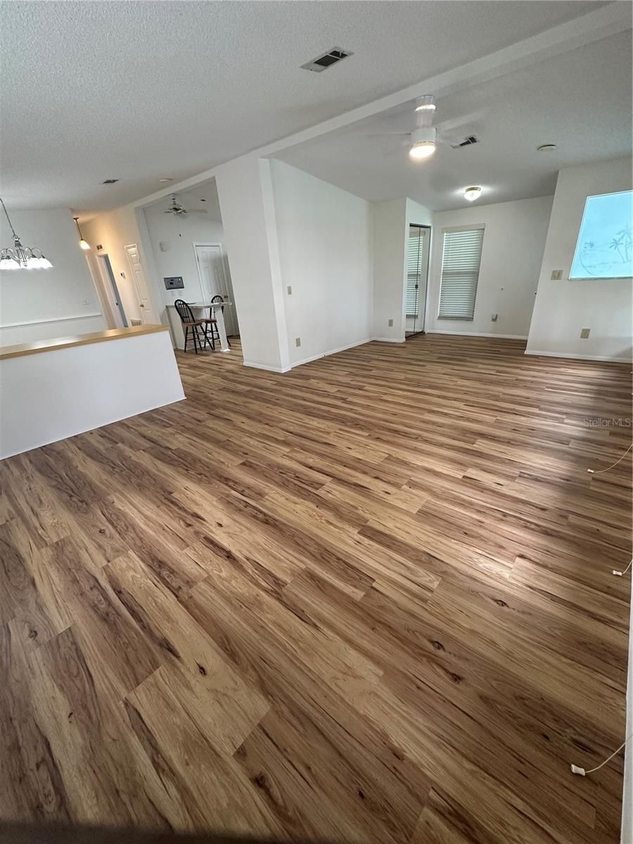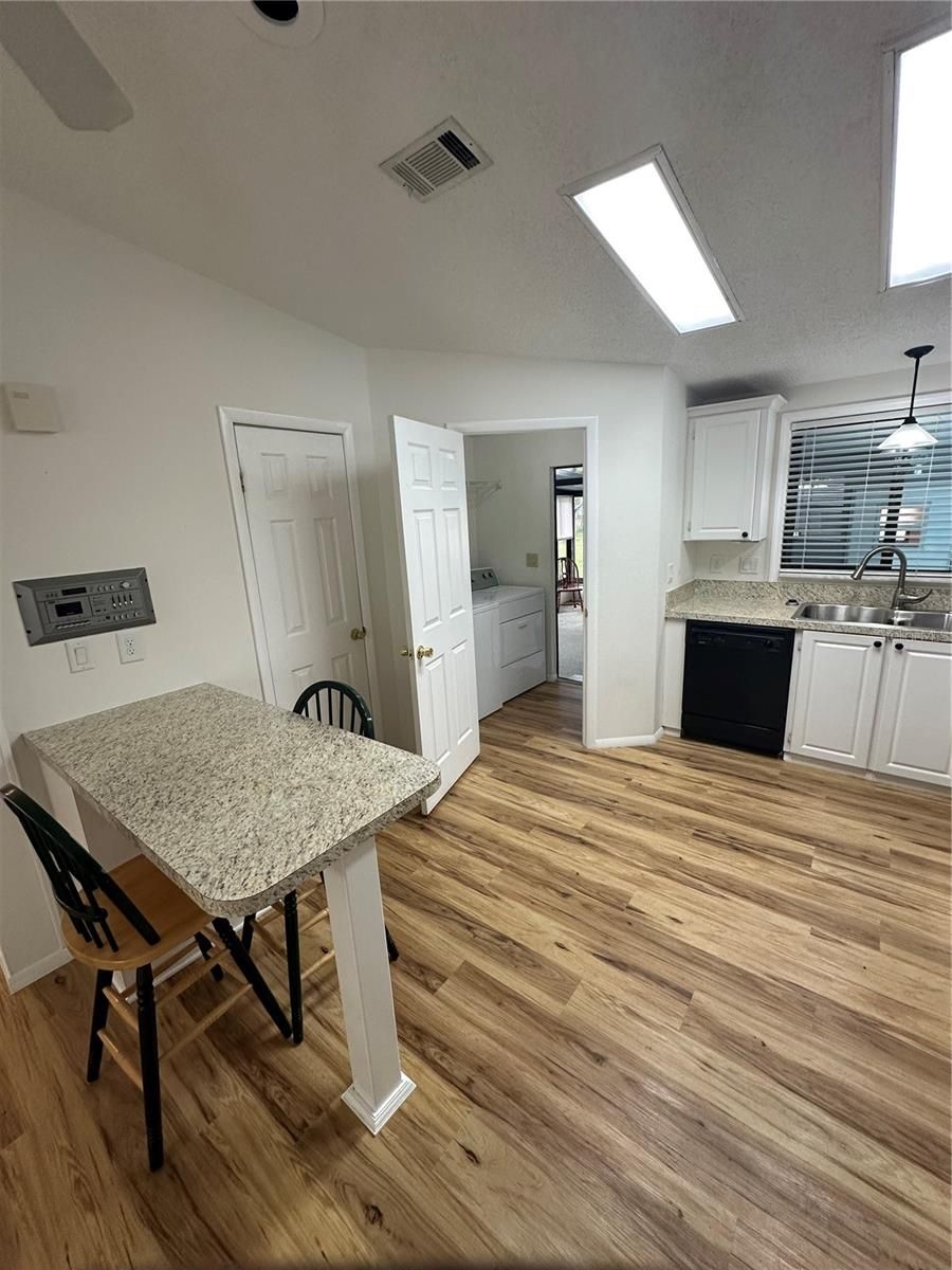 REDUCED - NO BOND * NO CDD * OWN YOUR LAND! Gorgeous St. Lucia Designer Model on a quiet street in historic Country Club Hills - just minutes by golf cart to Spanish Springs Town Square! This 2-bed plus 2-bath home shines with an INSIDE laundry room, an updated kitchen with a new stove and a stainless steel dual sink with a new disposal unit. The beautiful luxury vinyl plank flooring is throughout the home - (even in the closet), and the living room is bright and open with a wall of windows plus a coat closet. The spacious master suite has a walk-in closet, a shower stall, an extra closet plus a linen closet. The enclosed lanai/Florida room has heat and A/C and is perfect for year round relaxing. The carport is covered and the extended golf cart garage has a workbench and lots of storage. The home has a durable metal roof and the A/C system was installed in 2021. Live the true Villages lifestyle - everything is a quick cart ride away - nightly entertainment, restaurants, shopping, hospitals, championship and executive golf courses, pickleball, tennis, pools, and recreation centers. Priced to sell and ready for immediate occupancy. Don't wait - this no-bond home will go fast!