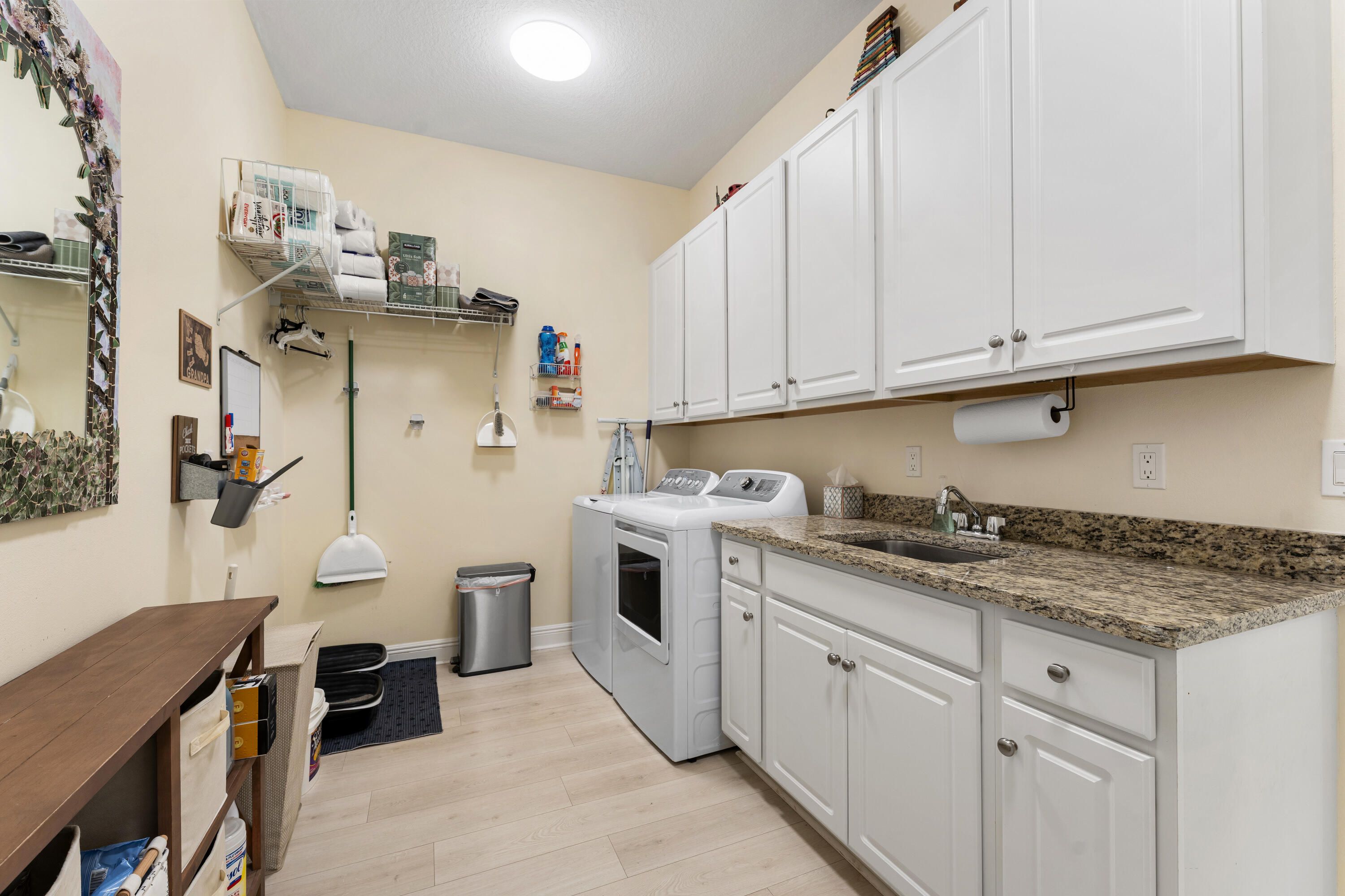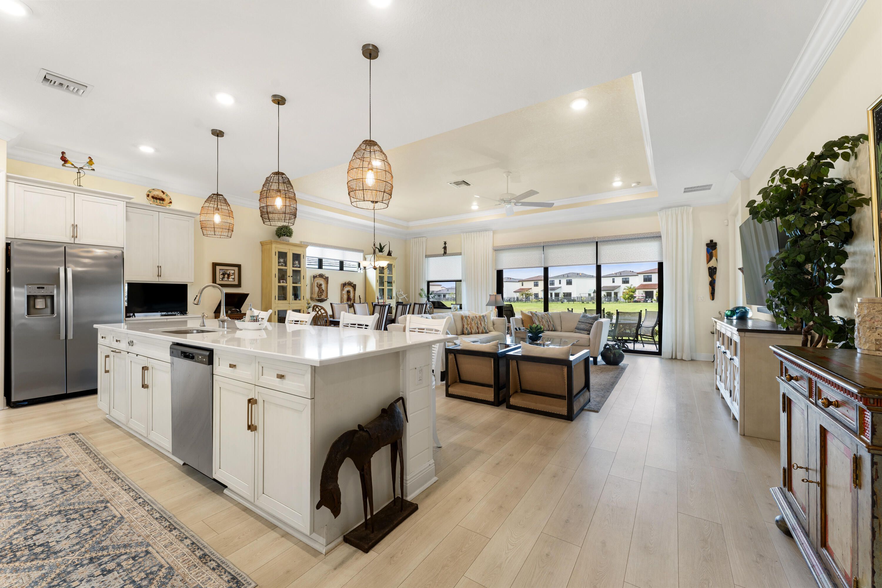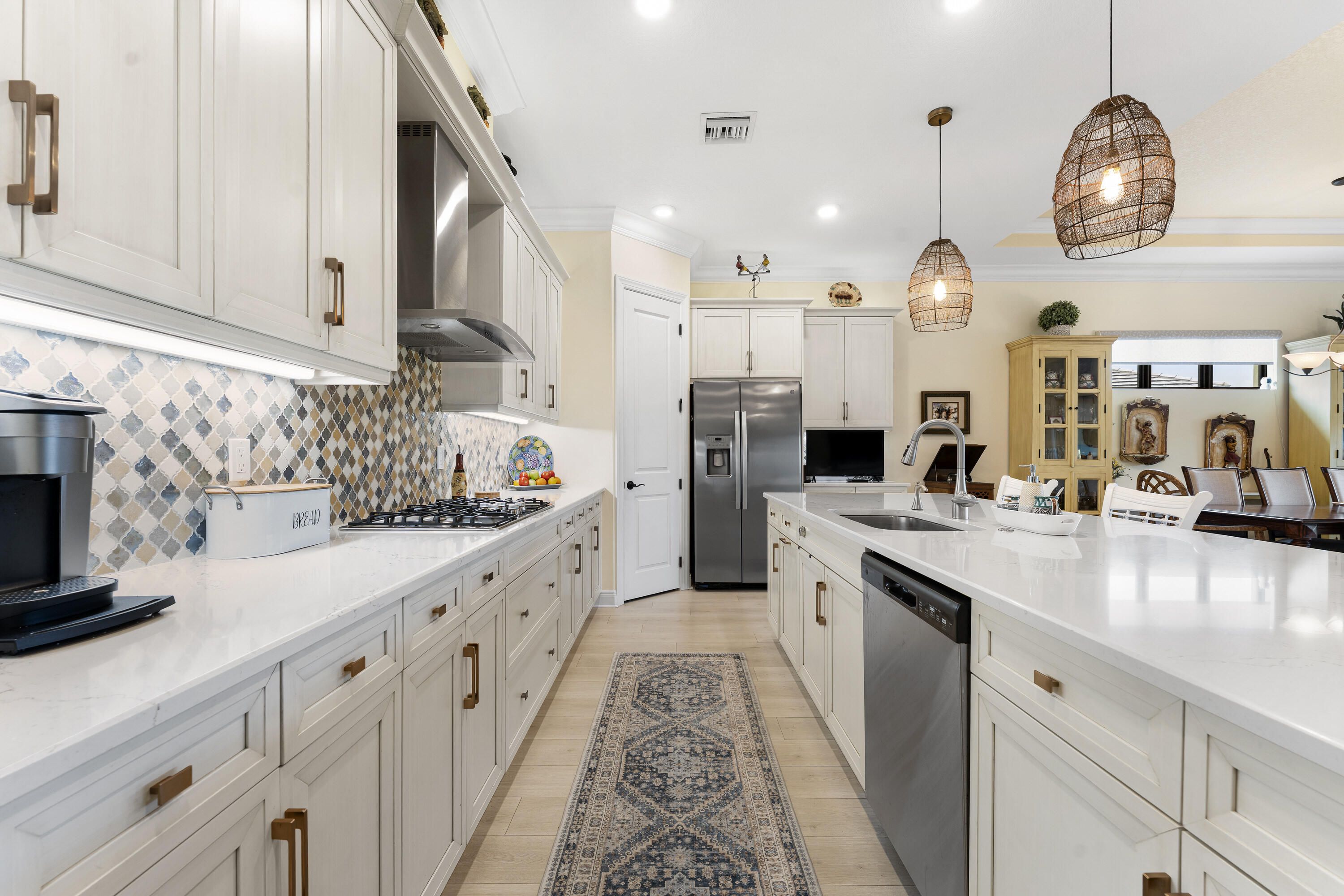 Set on a premium waterfront cul-de-sac lot with exceptional spacing between neighboring homes, this residence offers a rare combination of privacy, light, and refined design. Every detail has been thoughtfully elevated to create a clean, high-end living experience. A dramatic entry with impact glass double doors opens to a polished foyer featuring custom wall detailing and layered crown molding. Wide-plank flooring extends throughout the main living areas, enhancing the home's seamless, modern flow. The kitchen is a standout, designed with both function and style in mind. It features sleek, soft-close cabinetry in a neutral palette, quartz surfaces, and a full-height backsplash for a striking finish. A professional-grade gas range with designer hood anchors the space, complemented by built-in wall ovens, microwave, and an oversized single-basin sink. The large island, finished with custom detailing, serves as both a centerpiece and gathering space. The main living area is elevated by intricate ceiling work and refined millwork, creating a sophisticated yet welcoming environment. Custom window treatments complete the space while allowing for adjustable natural light. A private office or flex room sits behind glass French doors, offering a quiet, versatile space enhanced by modern lighting and a distinctive accent wall. Secondary living spaces continue the home's elevated feel. Guest bedrooms are well-proportioned with upgraded finishes, while bathrooms feature contemporary styling with quartz countertops, vessel-style sinks, and floor-to-ceiling tilework. One guest suite includes its own upgraded bath with a frameless glass shower for added comfort and privacy. The primary suite is designed as a retreat, featuring elegant ceiling detail, custom finishes, and a calm, airy atmosphere. The ensuite bath delivers a spa-like experience with dual vanities, quartz surfaces, a walk-in shower with designer tilework, and expansive mirrored walls. A fully built-out walk-in closet adds both convenience and luxury. Additional highlights include an oversized laundry room with extensive cabinetry, workspace, and utility sink—designed for both efficiency and organization. Outdoor living is equally impressive, with a covered lanai overlooking tranquil water views and open green space. Motorized screening allows for year-round enjoyment, creating a seamless indoor-outdoor experience ideal for entertaining or quiet relaxation. The generous lot placement enhances the sense of privacy, offering a peaceful backdrop rarely found in community living. This residence delivers a refined balance of design, comfort, and location—set within a sought-after, amenity-rich community offering resort-style pools, fitness facilities, racquet sports, and vibrant social spaces. A distinctive opportunity for those seeking elevated living in a premier setting. All in the Prestigious Cresswind at Westlake, a residential community offering a range of amenities tailored for active adults 55+. World-class amenities, Clubhouse, Very active community, Silver Award Winner - Best of 55+ Housing Awards (National Association of Home Builders)" "2021 "Top 100 Places to Live" (ideal Living Magazine)" The community clubhouse, managed by a full-time lifestyle director, offers a SmartFIT Training Center powered by EGYM, event and game rooms, an arts and crafts studio, pickleball and tennis courts, a dog park, resort-style and resistance pools, a spa, outdoor event plaza, and much more. Westlake Adventure Park amenities include a lagoon pool with a 3-story slide, a splash pad, cabanas, lawn space for parties, an outdoor concert pavilion, basketball courts, an adult pool clubhouse (lodge), a playground, a dog park. As an owner, you also have access to Westlake's Adventure Park. Cresswind HOA covers lawn maintenance, internet and the community amenities. Foyer Chandelier and Wall Sconce do not convey with the sale of the home