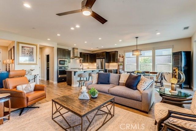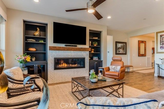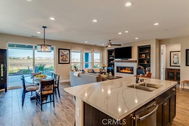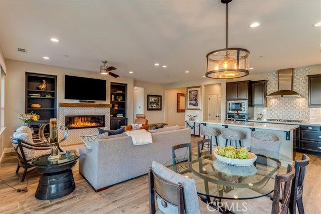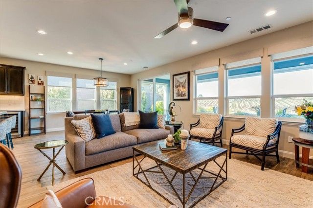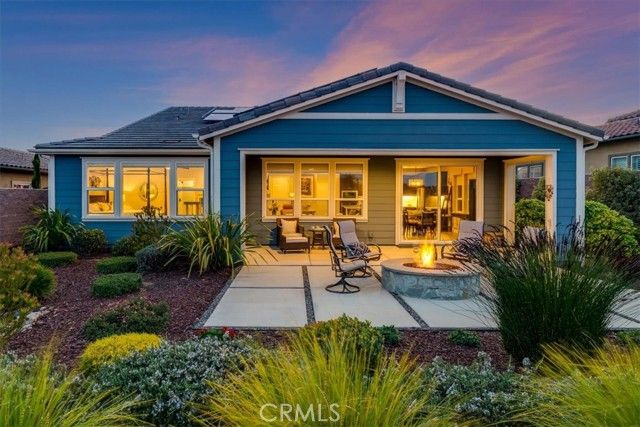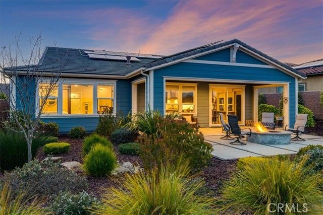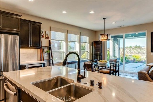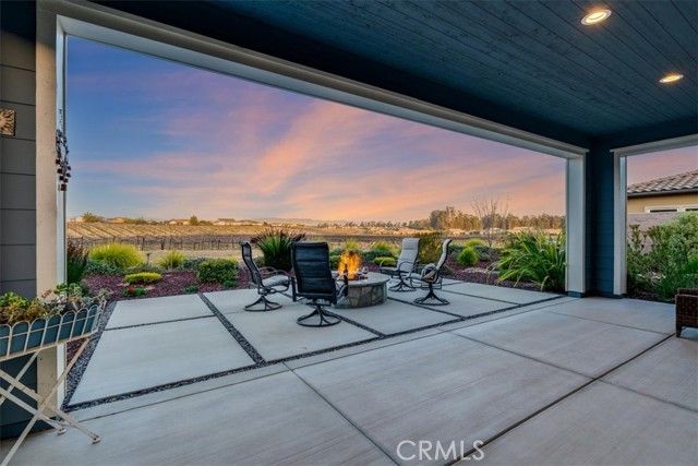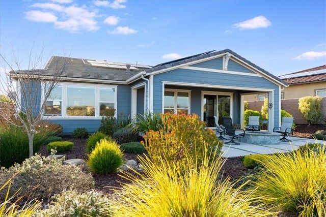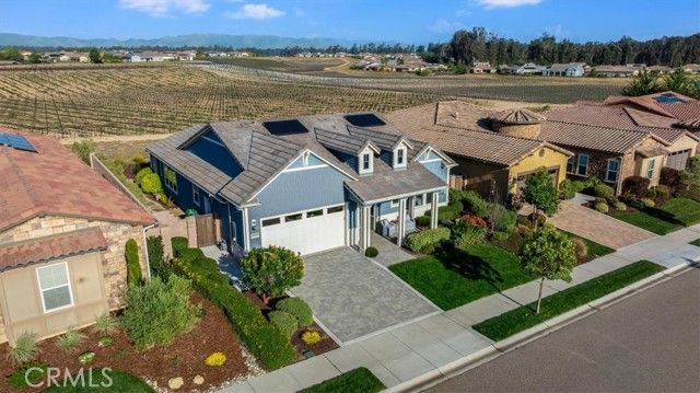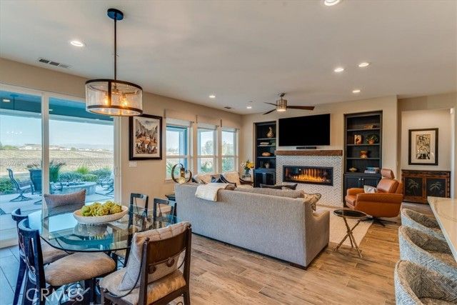 Set against a backdrop of rolling vineyards, this charming coastal home awaits. A welcoming porch greets guests and once inside, this beautifully designed home is ready to create warm memories with friends and family. Step into an open great-room floorplan where natural light pours in and the amazing vineyard views set the stage for all this home has to offer. The living room offers an inviting focal point with its newly remodeled gas fireplace, elegant surround and mantel, and custom cabinetry on each side—creating a warm, stylish space for gathering or relaxing. From here, the home flows seamlessly into the chef’s kitchen, thoughtfully designed for both everyday living and elevated entertaining. Stainless steel appliances—including a refrigerator and wine fridge—pair with soft-closing, luxurious cabinetry enhanced by under-cabinet lighting and clever storage features like a lazy Susan. A striking quartzite island anchors the space, opening to the great room and drawing your eye toward the stunning vineyard hills beyond. Hardwood-style tile flooring offers the warmth of wood with the ease of low-maintenance living. Additional upgrades include stone slab counters throughout, refined window treatments, solar, and more. A beautifully outfitted Smart Space laundry room adds exceptional functionality with its built-in cabinetry, desk, and sink—an ideal hub for organization and utility. The primary suite is a sanctuary of its own, offering endless views and a spa-inspired bathroom with marble styled tile. Outside, the professionally designed landscaping creates a private oasis. A covered patio, oversized firepit, and generous gathering areas make it easy to enjoy the region’s mild climate and embrace true indoor–outdoor living. Located within the highly desirable Trilogy Monarch Dunes Resort Community, this home offers not just a place to live, but a community you will enjoy.