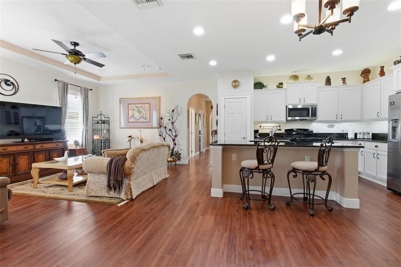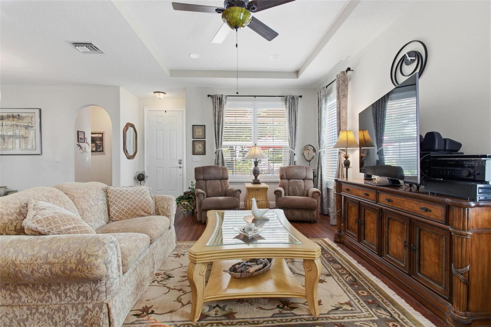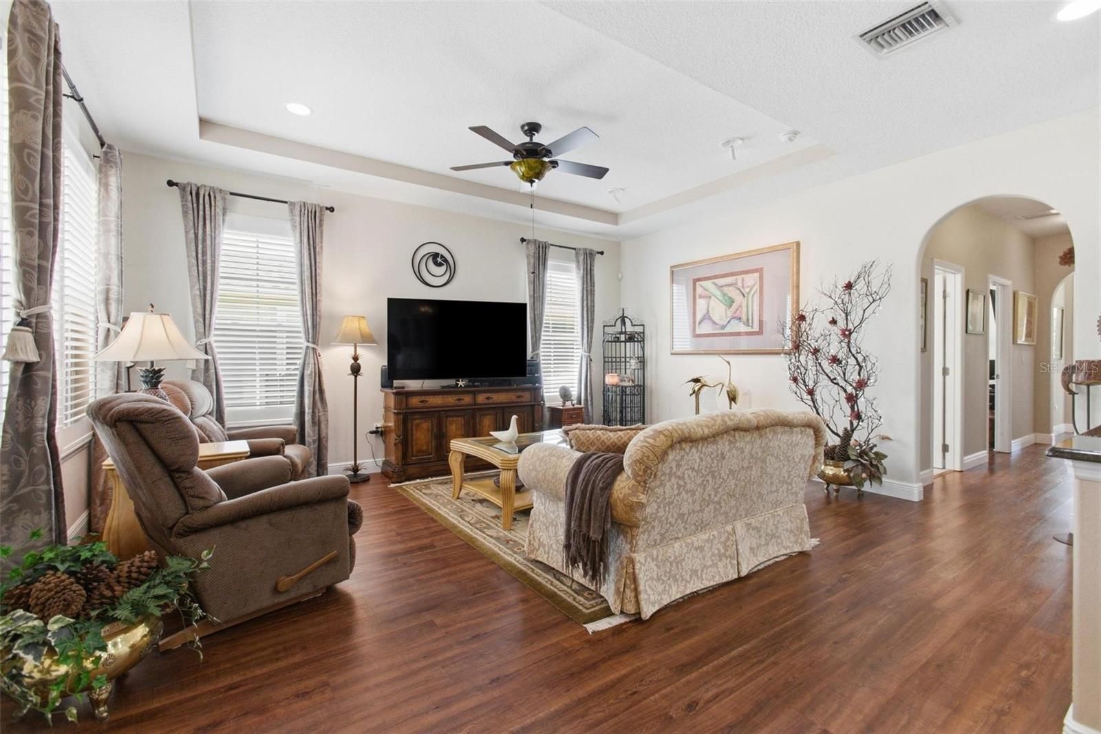 - Built-in Features, Ceiling Fan(s), Eat-in Kitchen, High Ceilings, Open Floorplan, Main Level Primary, Solid-Wood Cabinets, Stone Counters, Thermostat, Tray Ceiling(s), Walk-In Closet(s), Window Treatments