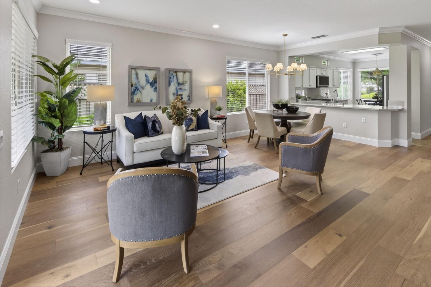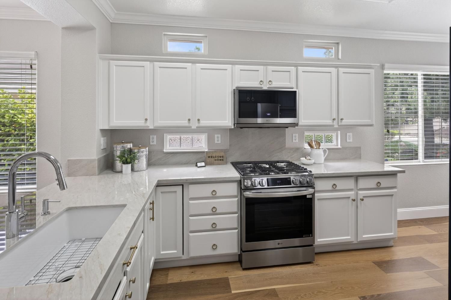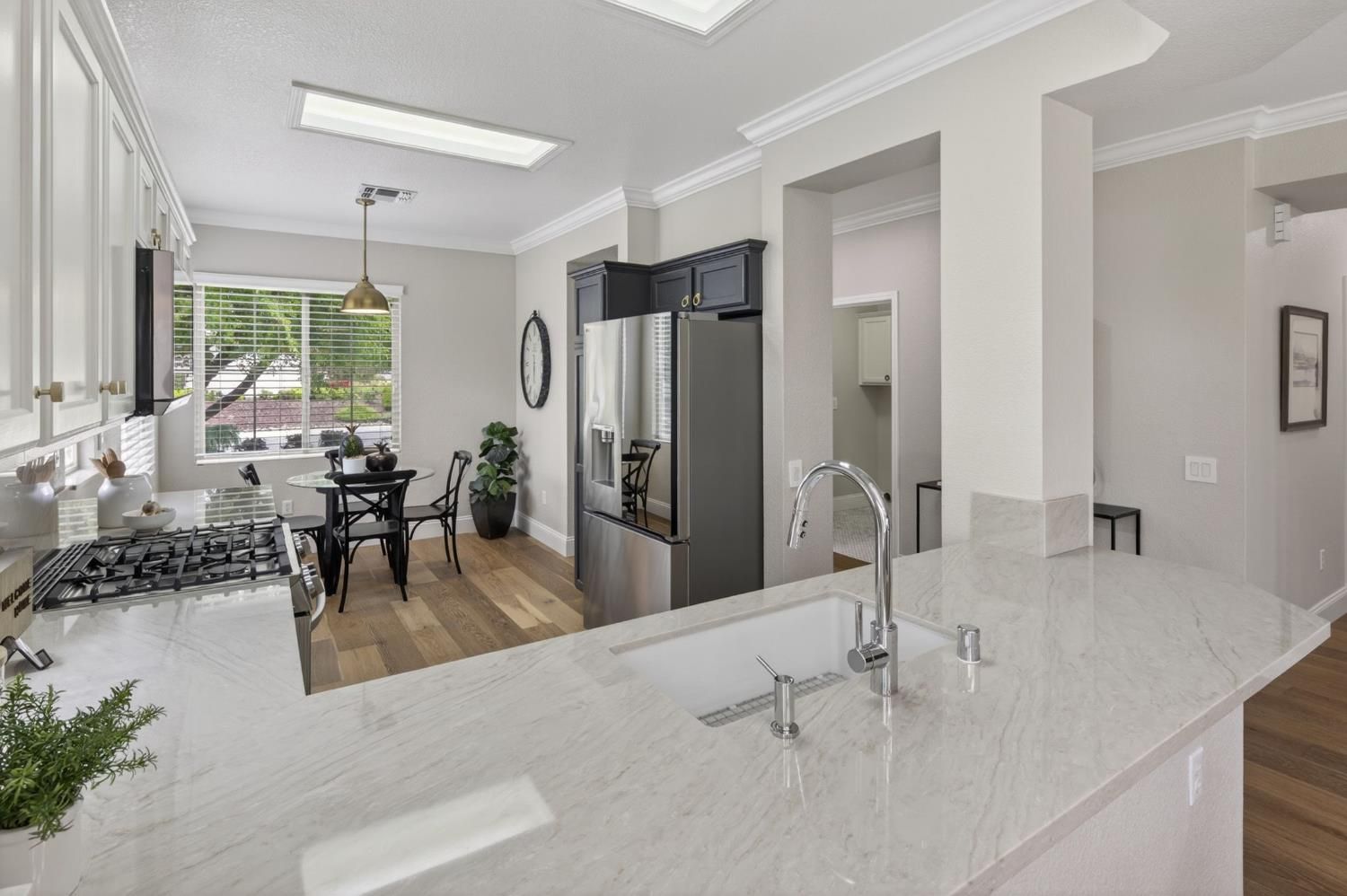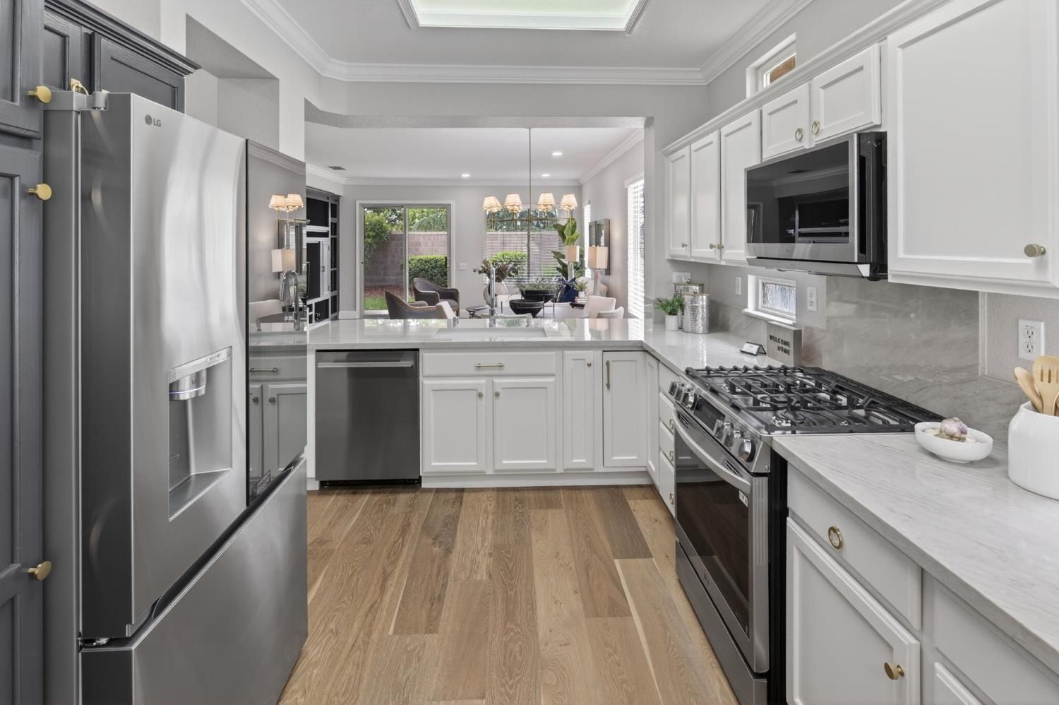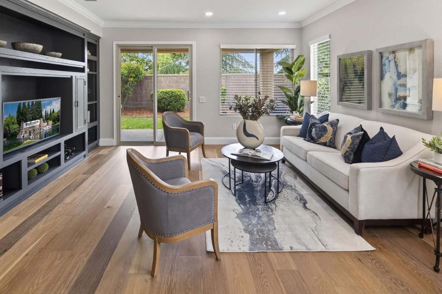 Welcome to Sun City Lincoln Hills, a premier active adult community by Del Webb. This beautifully updated Bridgegate model is truly move-in readyjust unpack and start enjoying pickleball, golf, and all the lifestyle amenities. The home features rich hardwood flooring throughout most rooms, complemented by a modern, designer-inspired color palette. The kitchen has been fully refreshed with brand-new, never-used stainless steel appliances and a sleek quartz countertop that's been lowered to enhance both functionality and contemporary style. The breakfast nook, highlighted by new lighting, faces the front of the homean inviting space to greet neighbors and enjoy the vibrant community atmosphere. The spacious great room includes a built-in entertainment center ideal for a large TV. The master suite offers plush wool carpeting and a charming bump-out window, while the adjoining bath showcases mosaic tile flooring and organized closet space. The guest bathroom has been tastefully updated with a new vanity top, fixtures, shower head, and mirror. An oversized garage provides room for two cars plus extra storage or a golf cart. Outside, relax on the covered patio surrounded by low-maintenance landscaping, perfect for enjoying the outdoors without the upkeep.
