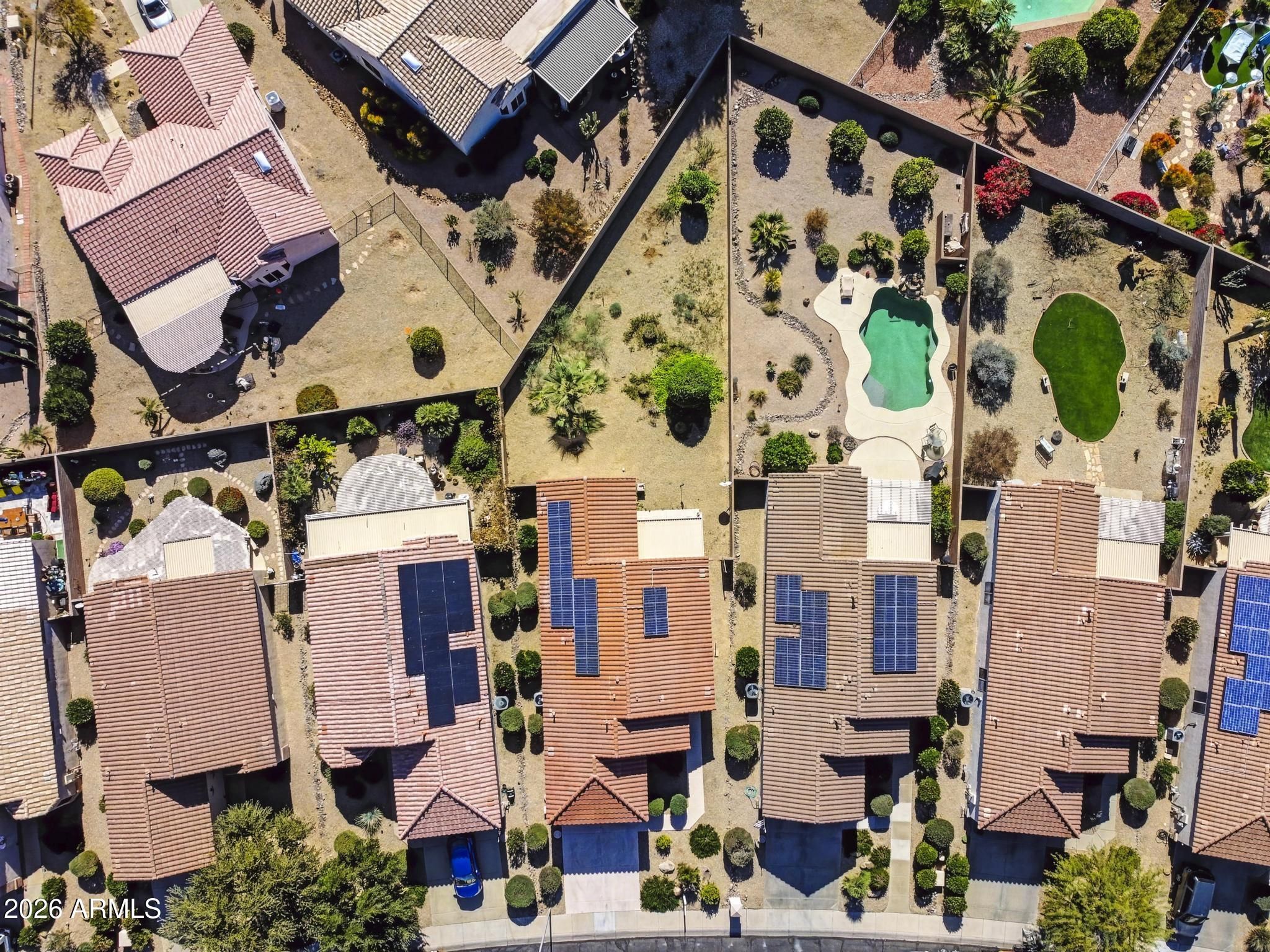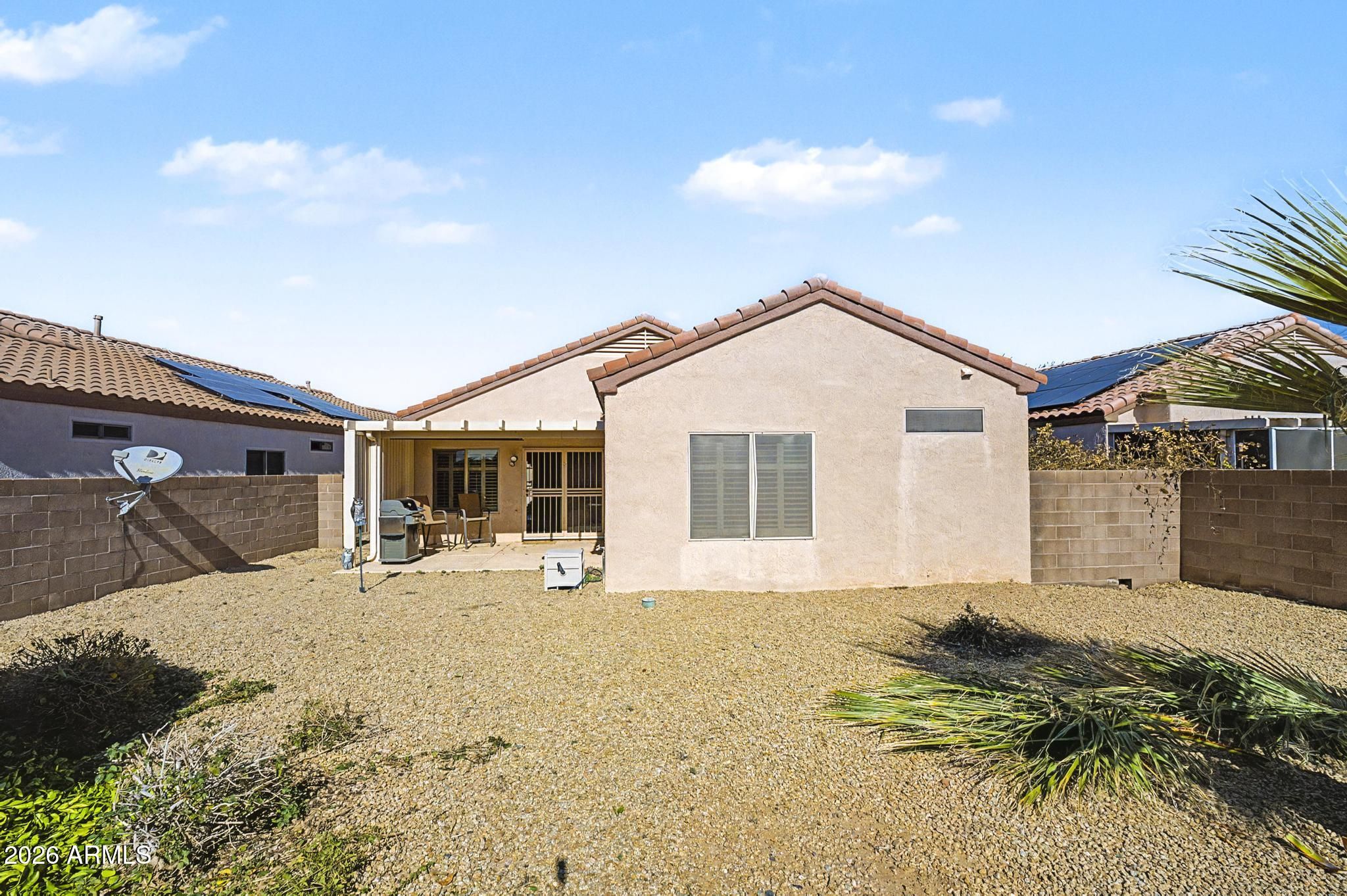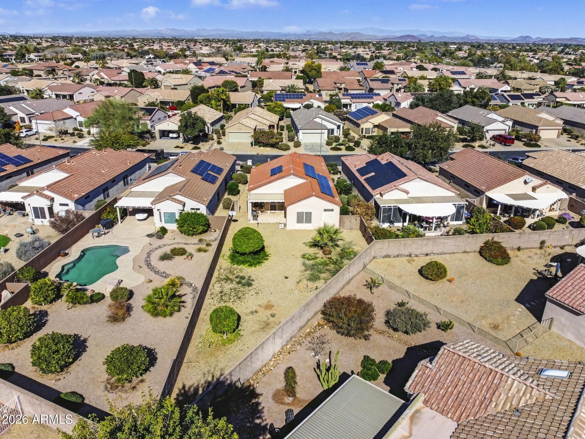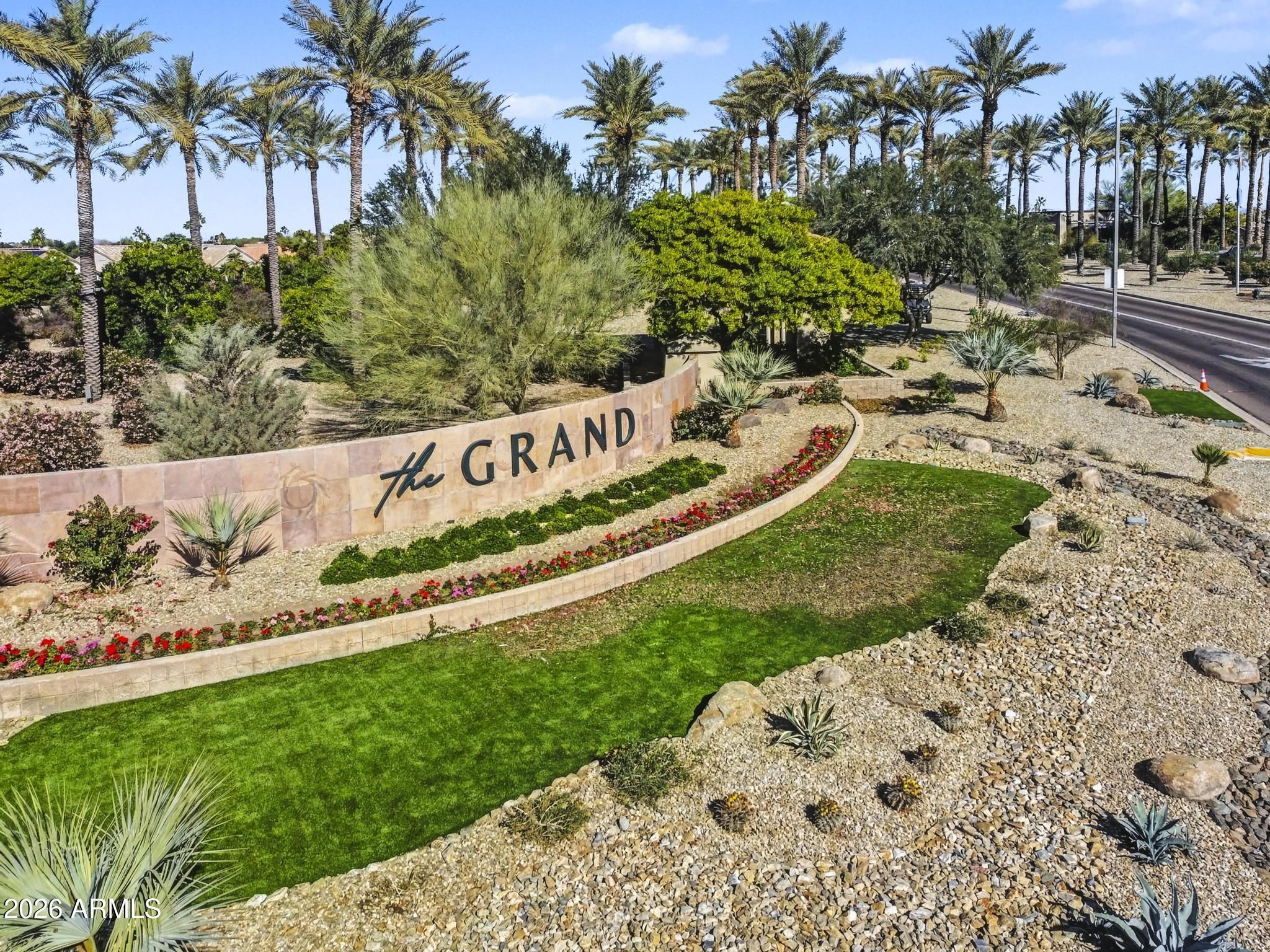 Welcome to The Grand, a highly sought after active adult community offering an engaging and fulfilling lifestyle. This popular floorplan features 3 bedrooms (the den with slider barn door functions as a true third bedroom) and 2 baths, with freshly painted cabinets, granite countertops, and plantation shutters throughout. Enjoy a large backyard perfect for entertaining on an oversized pie shaped fenced lot. The home is offered furnished with most items conveying (some staging items excluded) and includes solar to help keep energy costs low. his property offers a wonderful combination of comfort, efficiency, and resort style living. Solar is leased with a remaining balance of $10,579 and a monthly payment of $83. Estimated electric bill is approximately $19 per month during the winter. Annual membership provides access to championship golf, resort style pools, creative arts, social clubs & a full calendar of events designed to bring neighbors together while offering comfort, choice & connection. Endless Ways to Stay Active, Social, and Inspired Residents of The Grand enjoy access to an impressive array of amenities, including: " 4 Championship Golf Courses " 4 Community Pools with indoor & outdoor lap lanes and leisure pools " 22 Pickleball Courts " 11 Tennis Courts " 8 Bocce Ball Courts " 2 Fitness Centers " 100+ Monthly Group Fitness Classes " 75+ Grand Learning Enrichment Courses per Semester " 65+ Chartered Clubs & Interest Groups " 6 Creative Studios (Art, Clay, Glass, Photography, Stitchers & Woodshop) " 8 Outdoor Walking Trails ranging from ½ mile to 4.7 miles " Indoor air-conditioned walking track " Lawn bowling green " Fishing lake " Softball stadium " Outdoor model railroad park " Veterans monument Additional conveniences include: " 3 Restaurants with Bars plus snack bars & poolside service " 3 Hot Tubs " 2 Dog Parks (large & small dogs) " 2 Technology Centers " 2 Performing Arts Stages (Sonoran Plaza Ballroom & Cimarron Club) " Billiards room " Full-service day spa